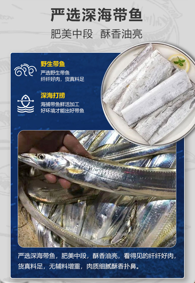4、海捕带鱼鲜活加工,无辅料增重,不加防腐剂,肉质细腻酥香扑鼻。