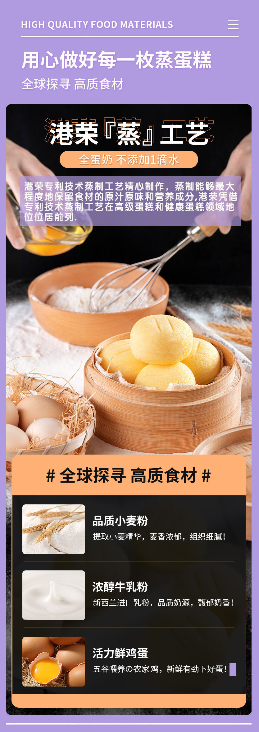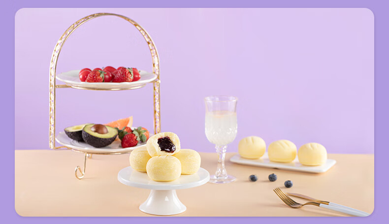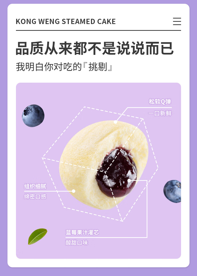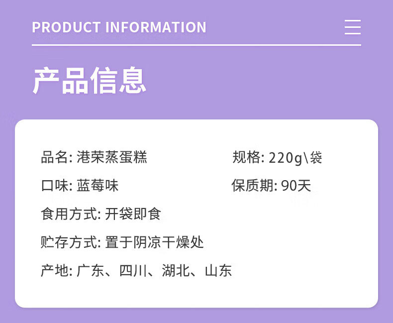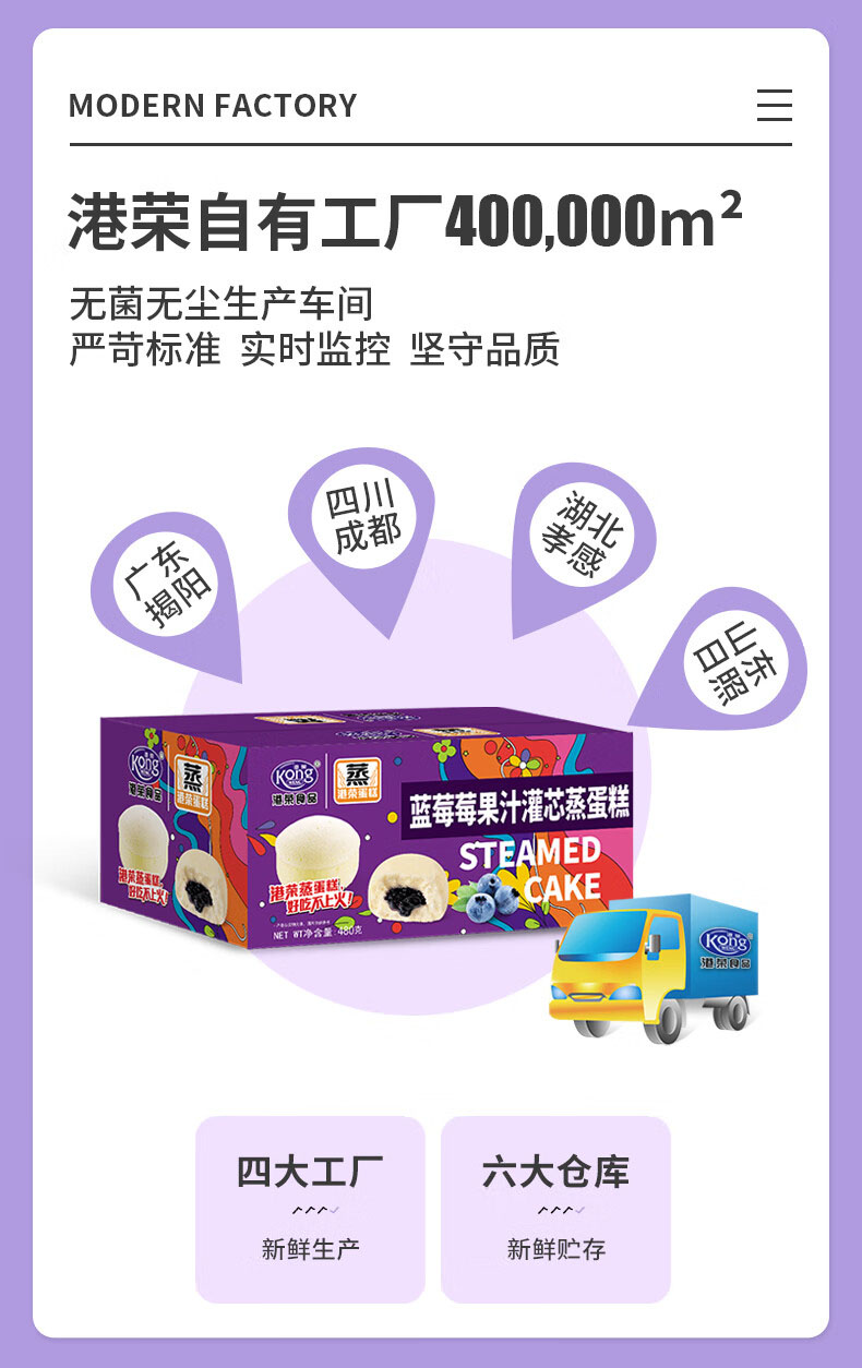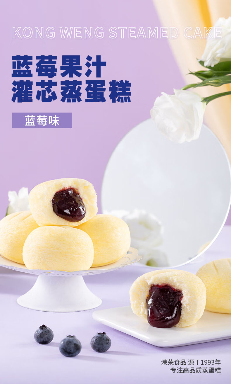蓝莓果汁灌芯蒸蛋糕,8袋组合,甄选高端食材,专利蒸制技术+低油低糖配方,麦香、蛋香、奶香融合酸甜可口的蓝莓果香,松软弹嫩,入口即化不粘牙,港荣大品牌,值得信赖M