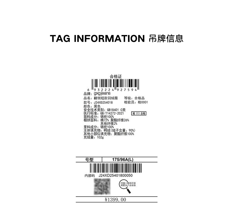 gxg.jeans男装冬季热卖黑色翻领短款羽绒服保暖舒适羽绒服J24XD254018
