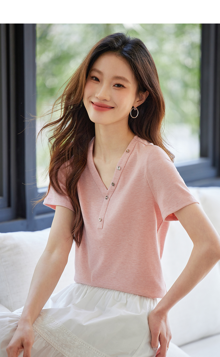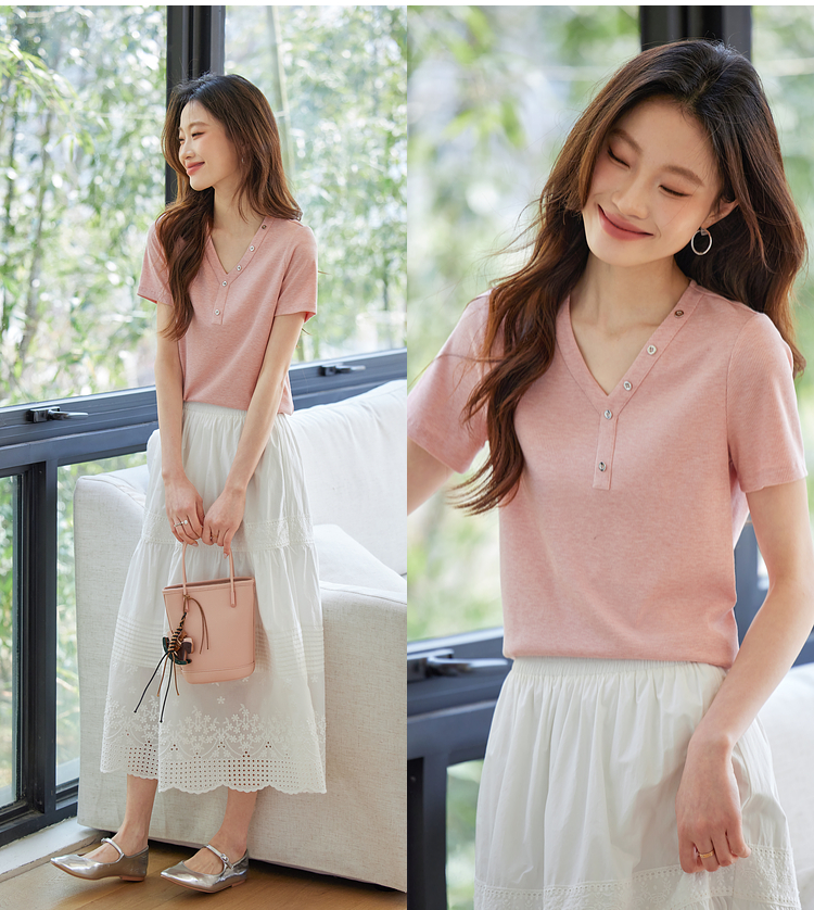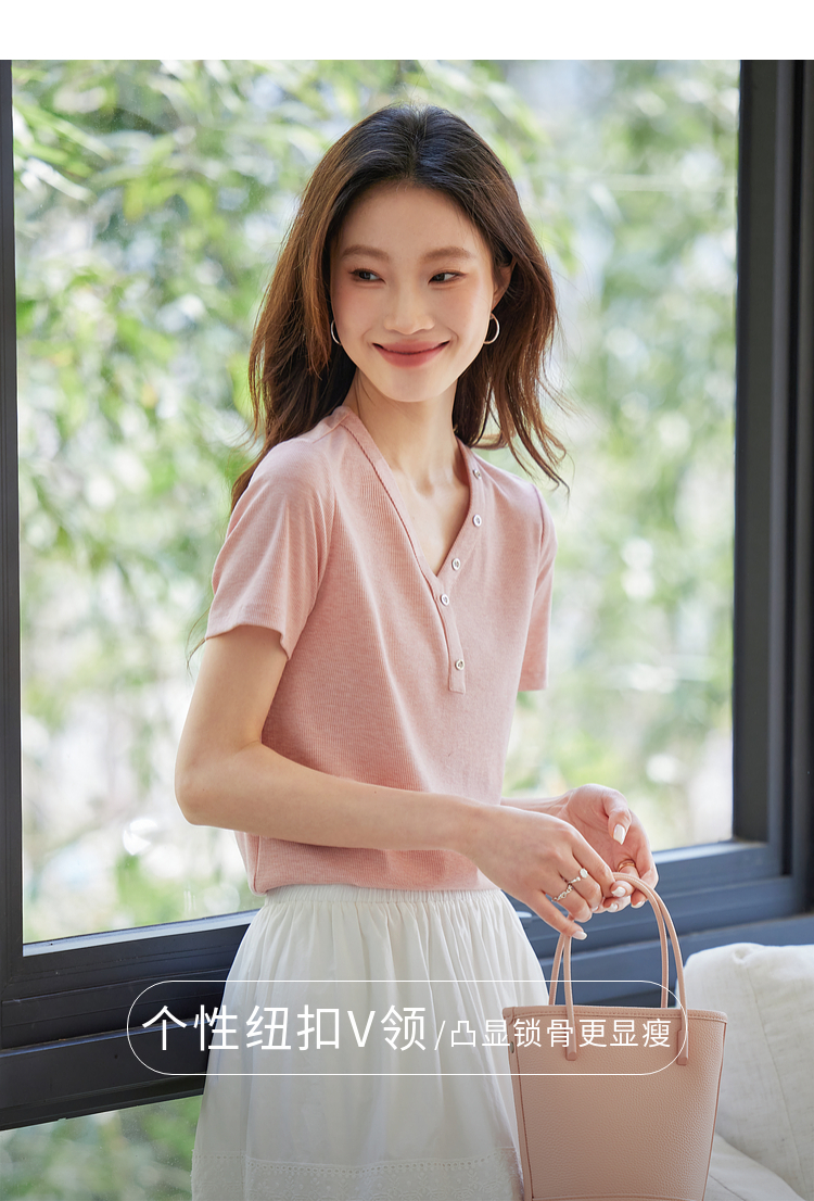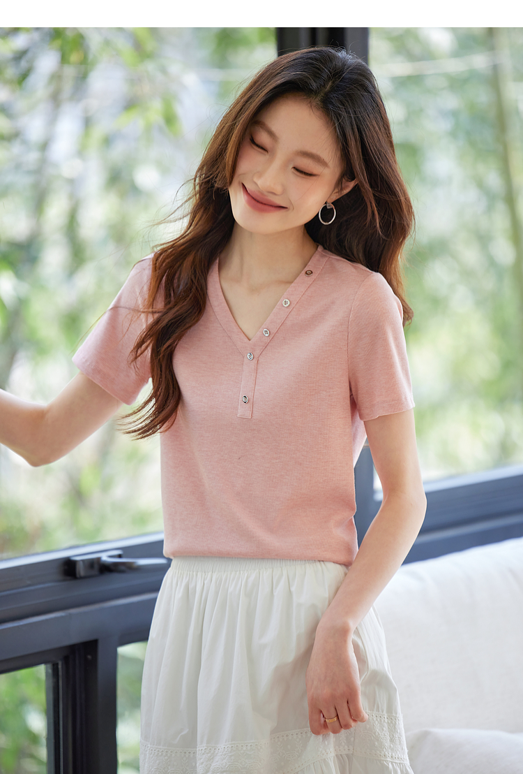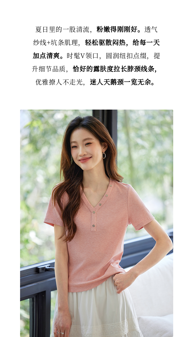 【专属特价】熙世界设计感V领T恤女短袖2025夏季新款气质肌理针织体恤粉色上衣