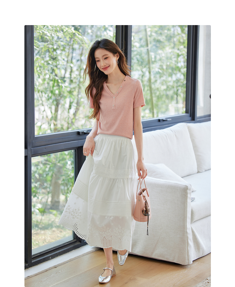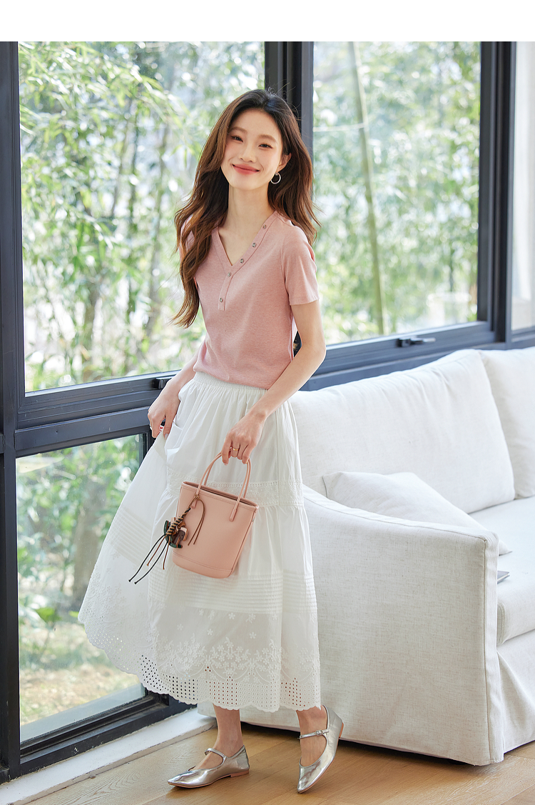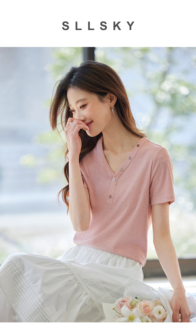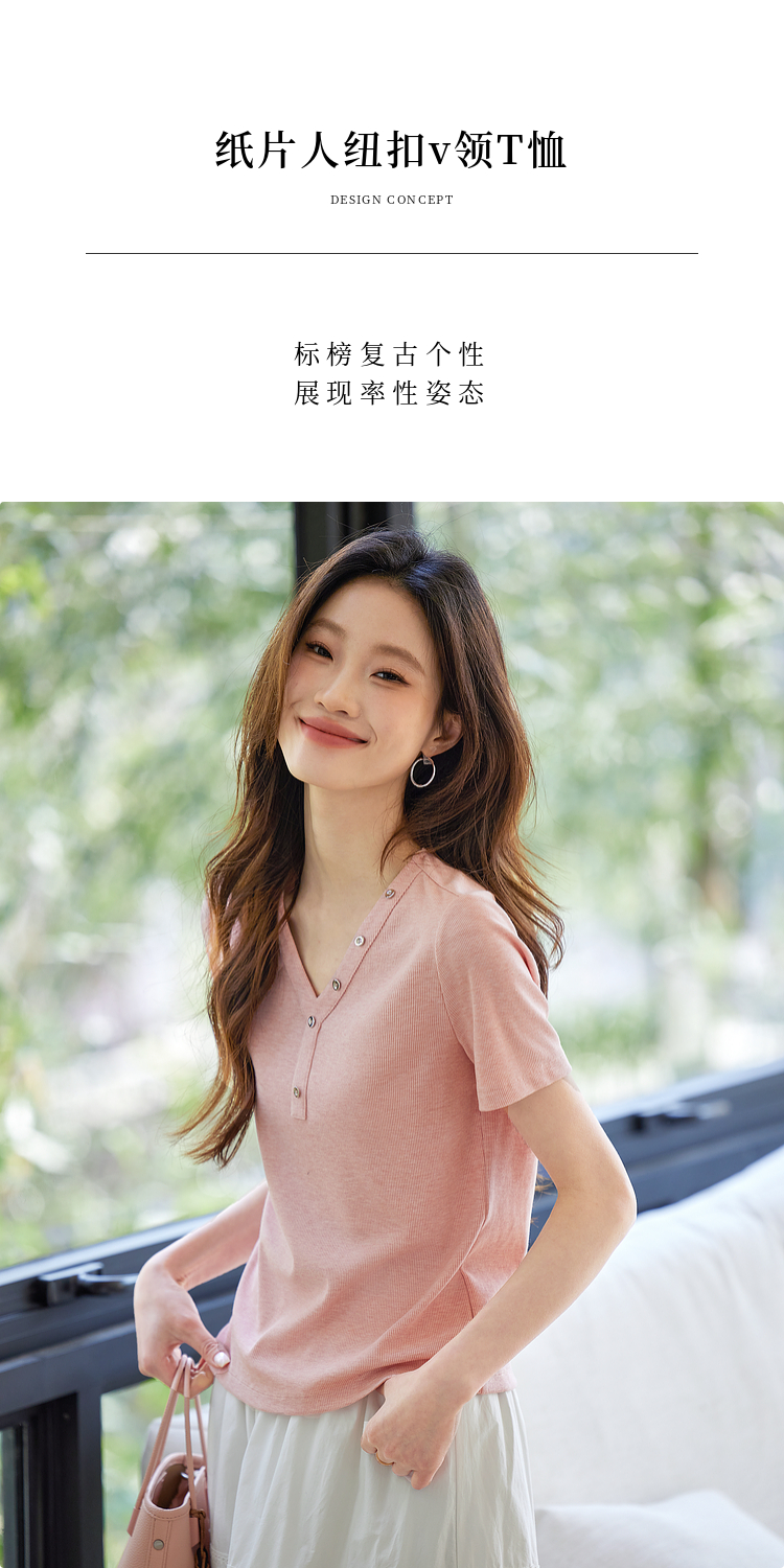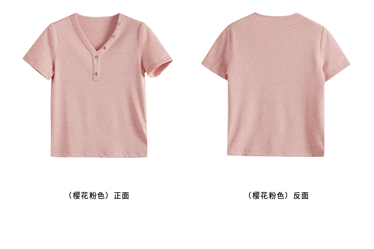 【专属特价】熙世界设计感V领T恤女短袖2025夏季新款气质肌理针织体恤粉色上衣