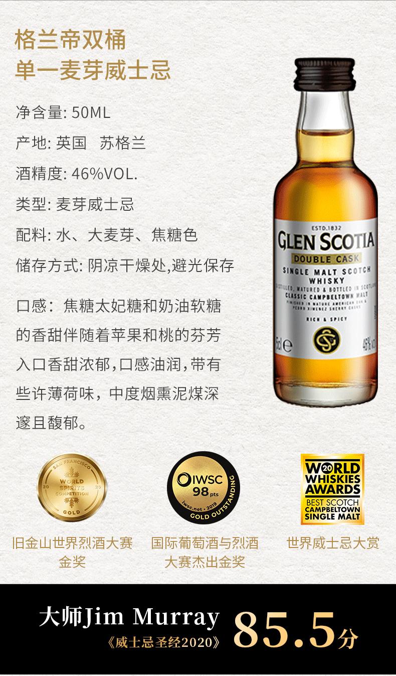 46°格兰帝双桶苏格兰单一麦芽威士忌50ml