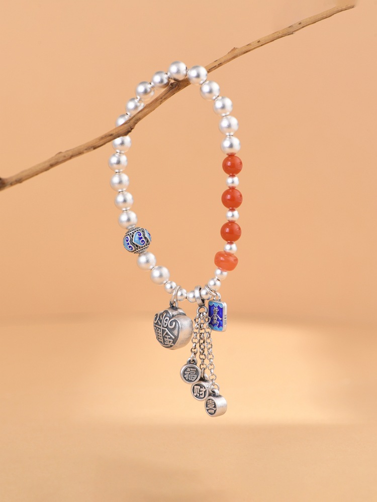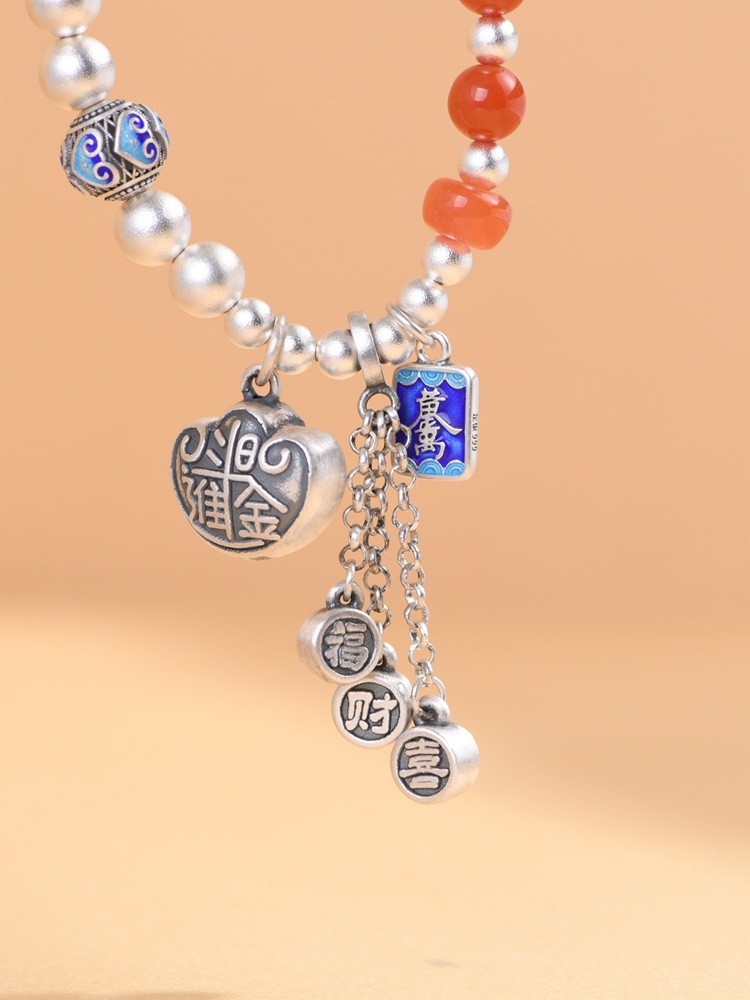 【福喜之财】足银盘缠景泰蓝南红福喜财元宝锁手链手串【SCH-CK40179-6】