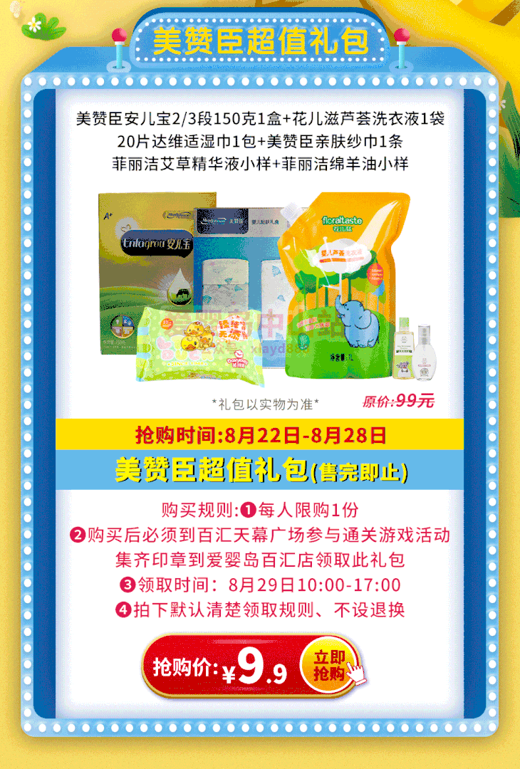 1.价值99元美赞臣大礼包:美赞臣安儿宝2/3段150克1盒+1袋花儿滋芦荟洗衣液+1包20片达维适湿巾+美赞臣亲肤纱巾1条+菲丽洁艾草精华液小样+菲丽洁绵羊油小样;