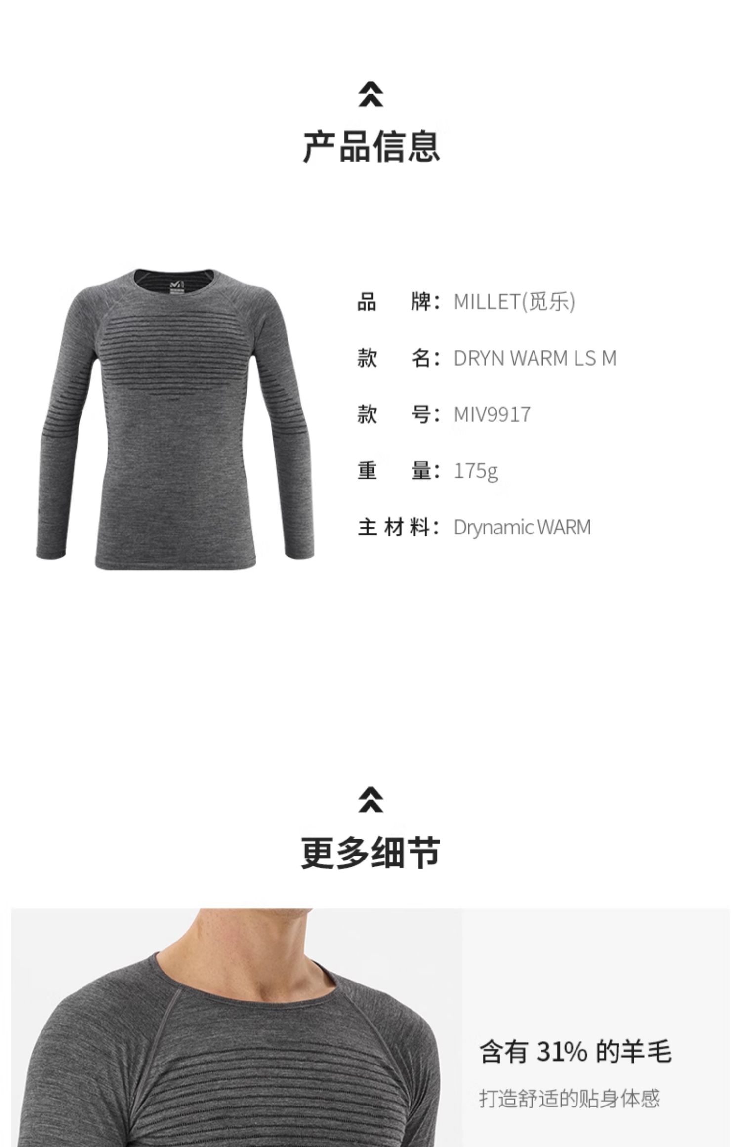 MILLET男式排汗保暖内衣 MIV9917 DRYN WARM LS M