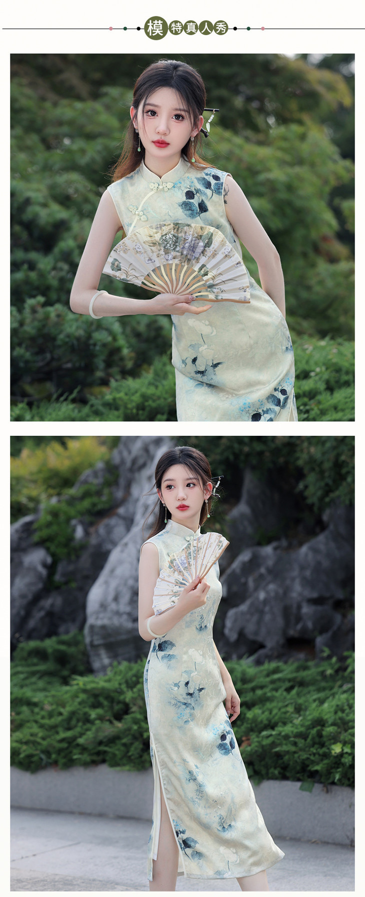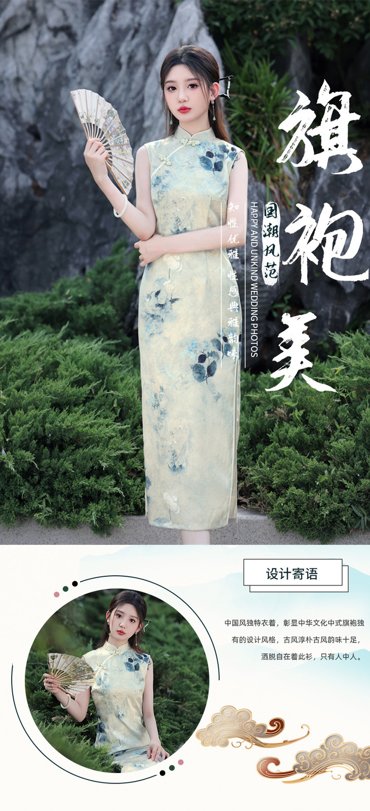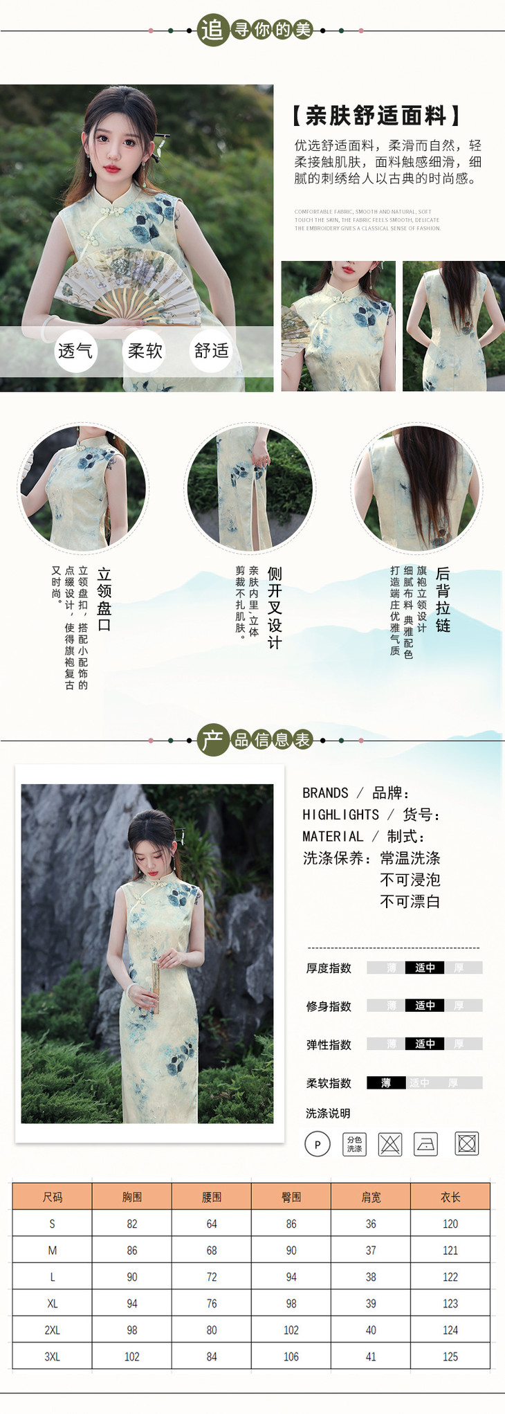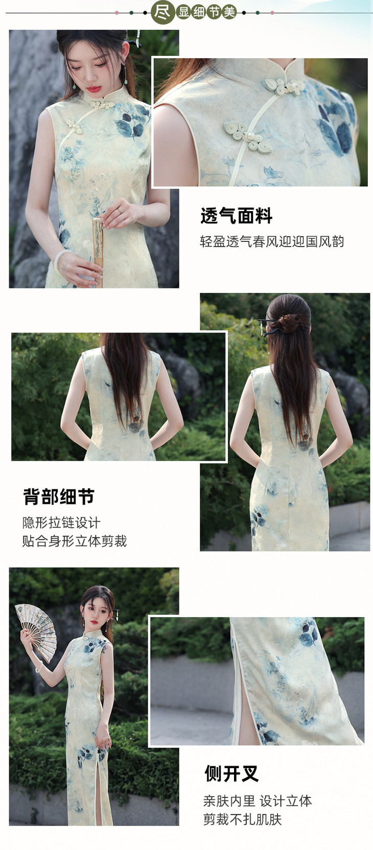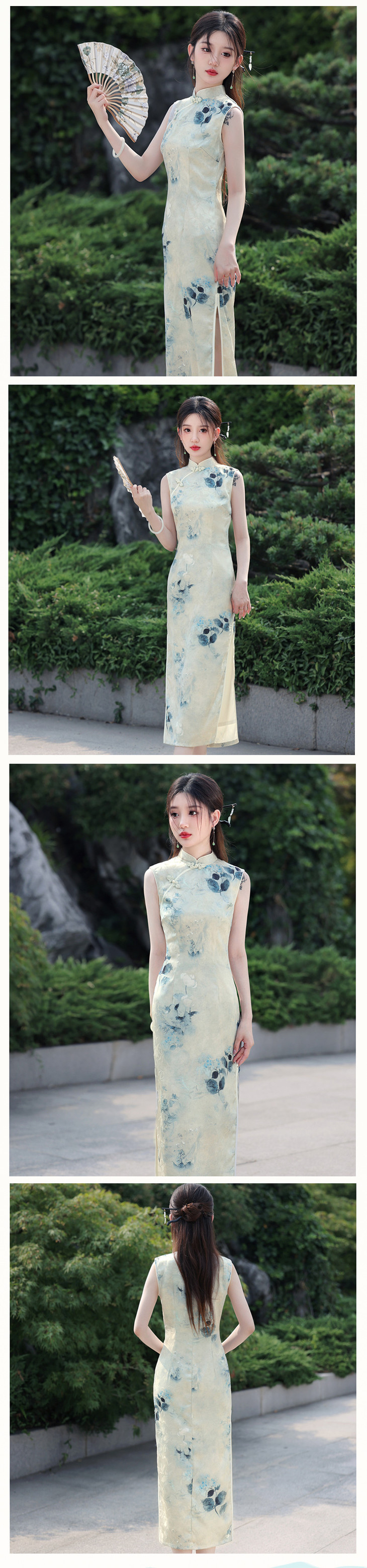 夏款无袖长款浅色国风水墨画修身旗袍SJT675