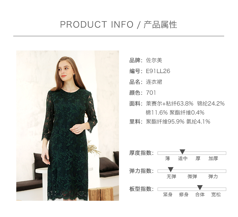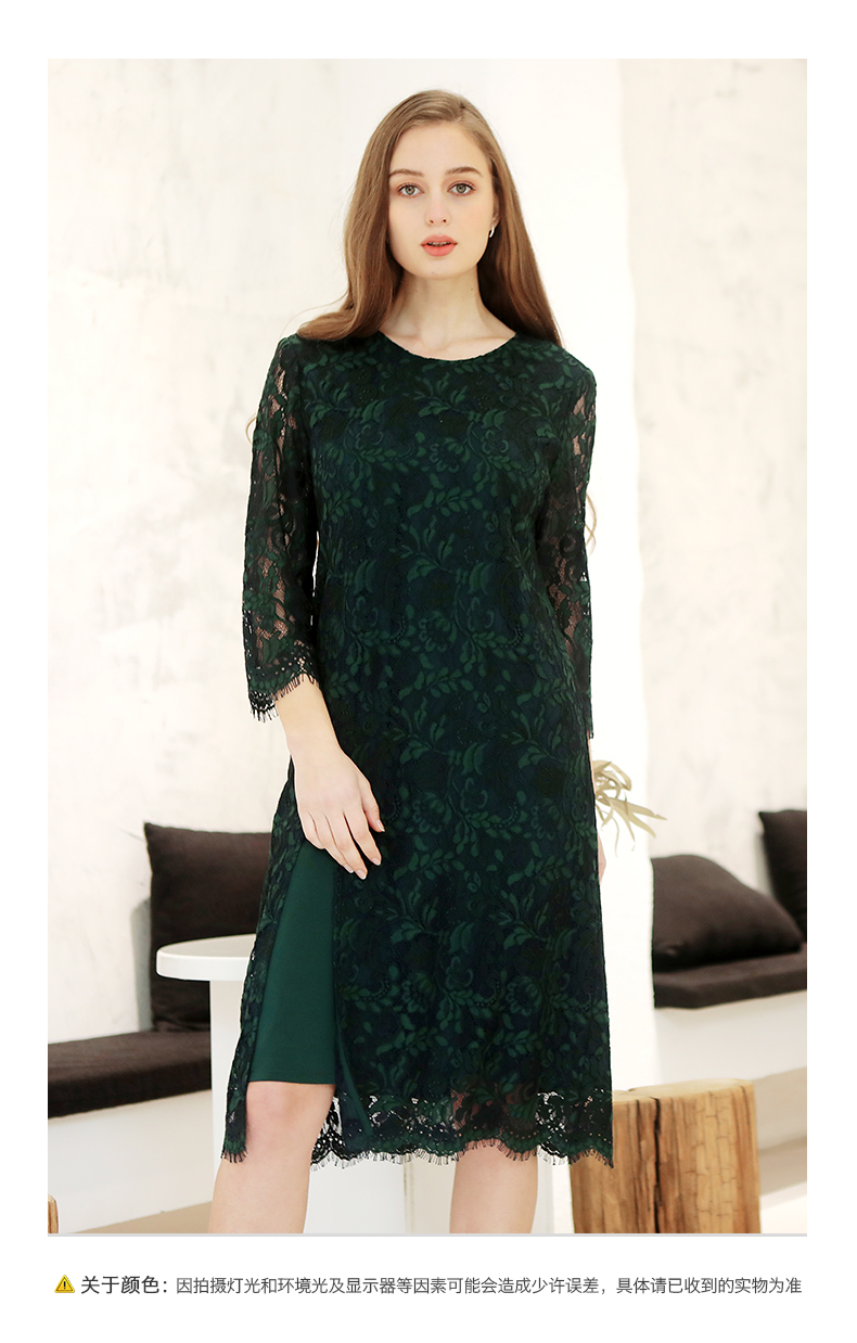 佐尔美春季新款气质蕾丝圆领9分袖修身中长连衣裙女E91LL26