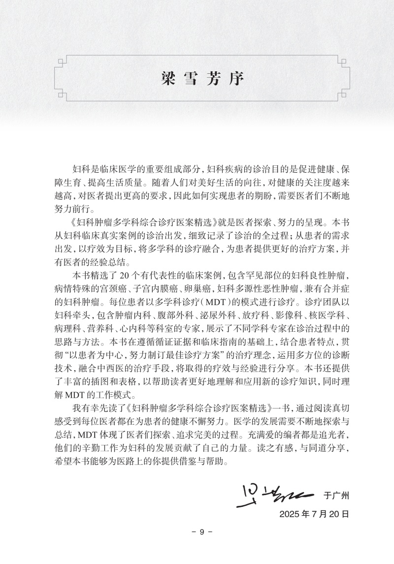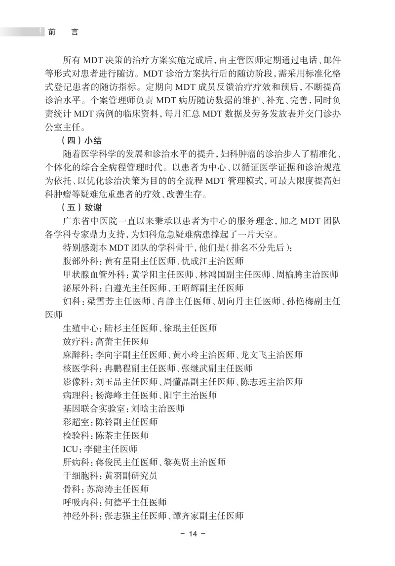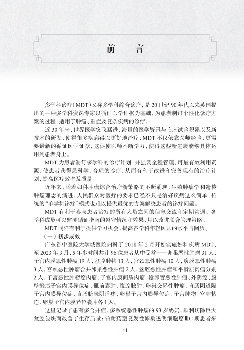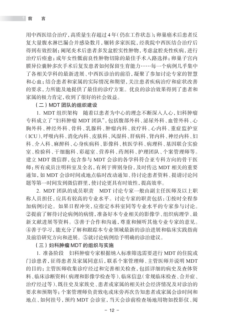 本书以多学科诊疗(multi-disciplinary treatment,MDT)为核心,精心筛选了20个临床有代表性的案例,每个病案均详细记录临床诊治过程、存在的诊治难点以及多学科团队为患者制订个体化治疗策略、后续治疗方案实施和追踪随访等,展示了不同学科专家在诊断和治疗过程中的角色和贡献,结合各专科的诊疗指南和新进展对于临床常见困惑展开思考与讨论,其中还记录了在妇科肿瘤合适的节点使用中医药的治疗让患者重获健康。虽然都是很专业的临床案例,但每一个案例专家们的分析丝丝入扣,诊疗过程循序渐进,跌宕起伏,病例分析总结有理有据,是一本阅读起来觉得十分有趣的专业书。