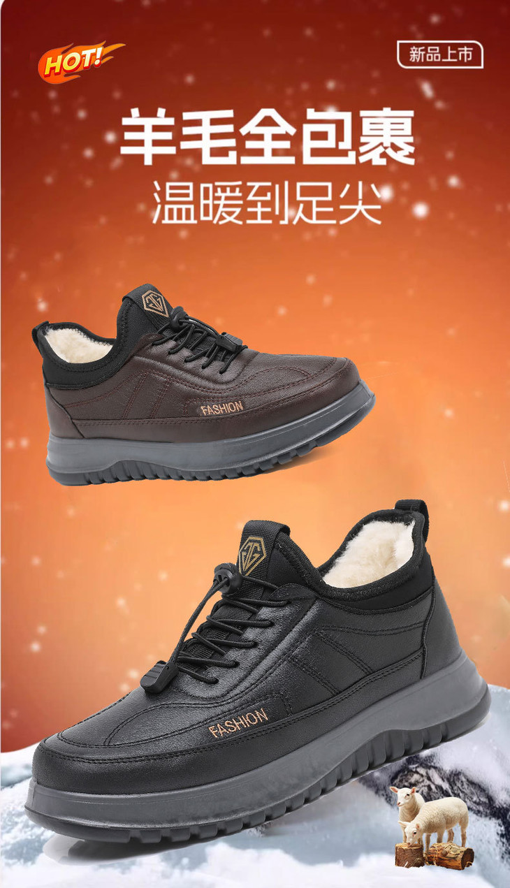 【冬季加绒加厚棉鞋男】一脚蹬防滑防水绵羊毛爸爸保暖棉靴老人运动鞋