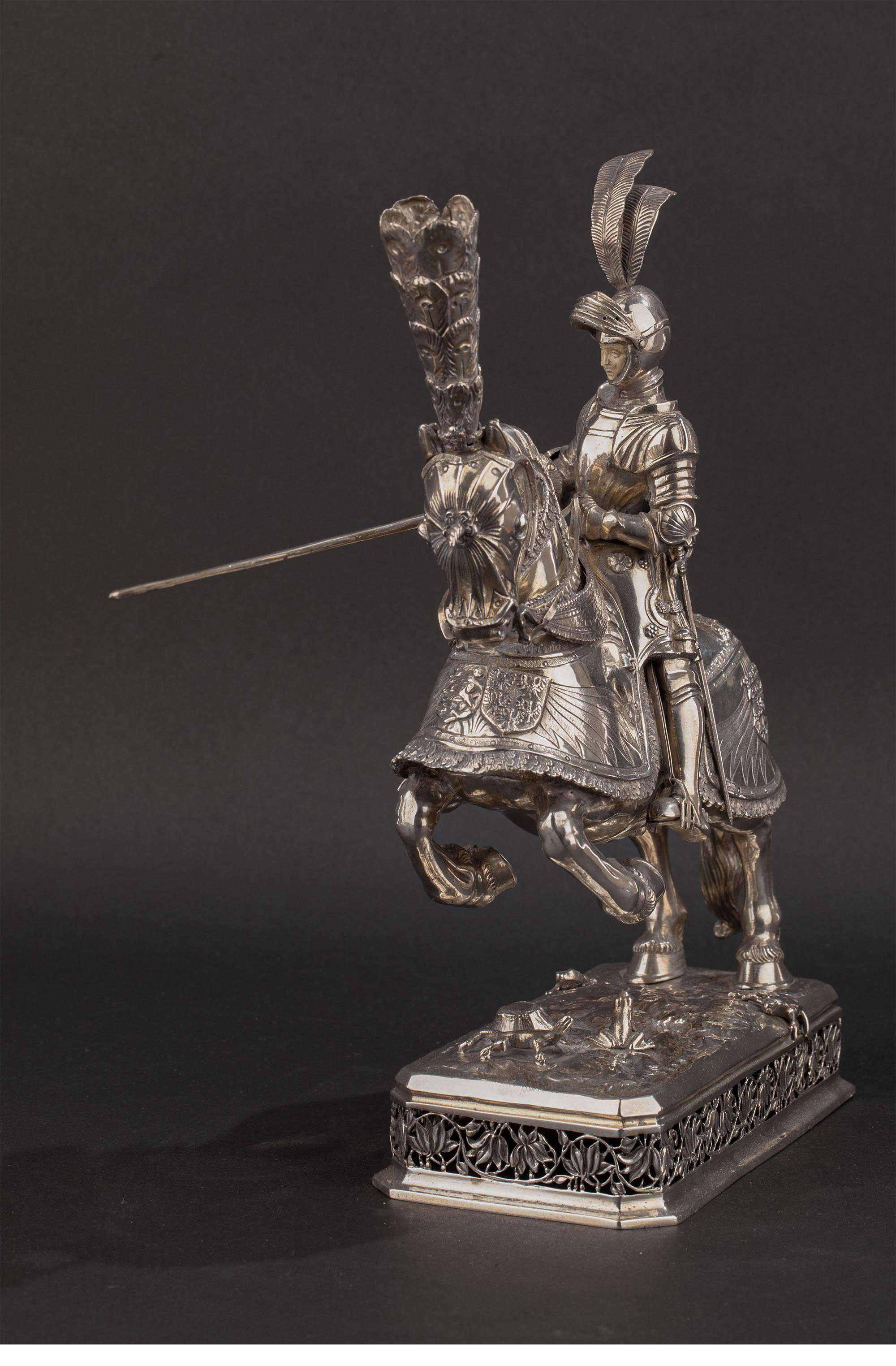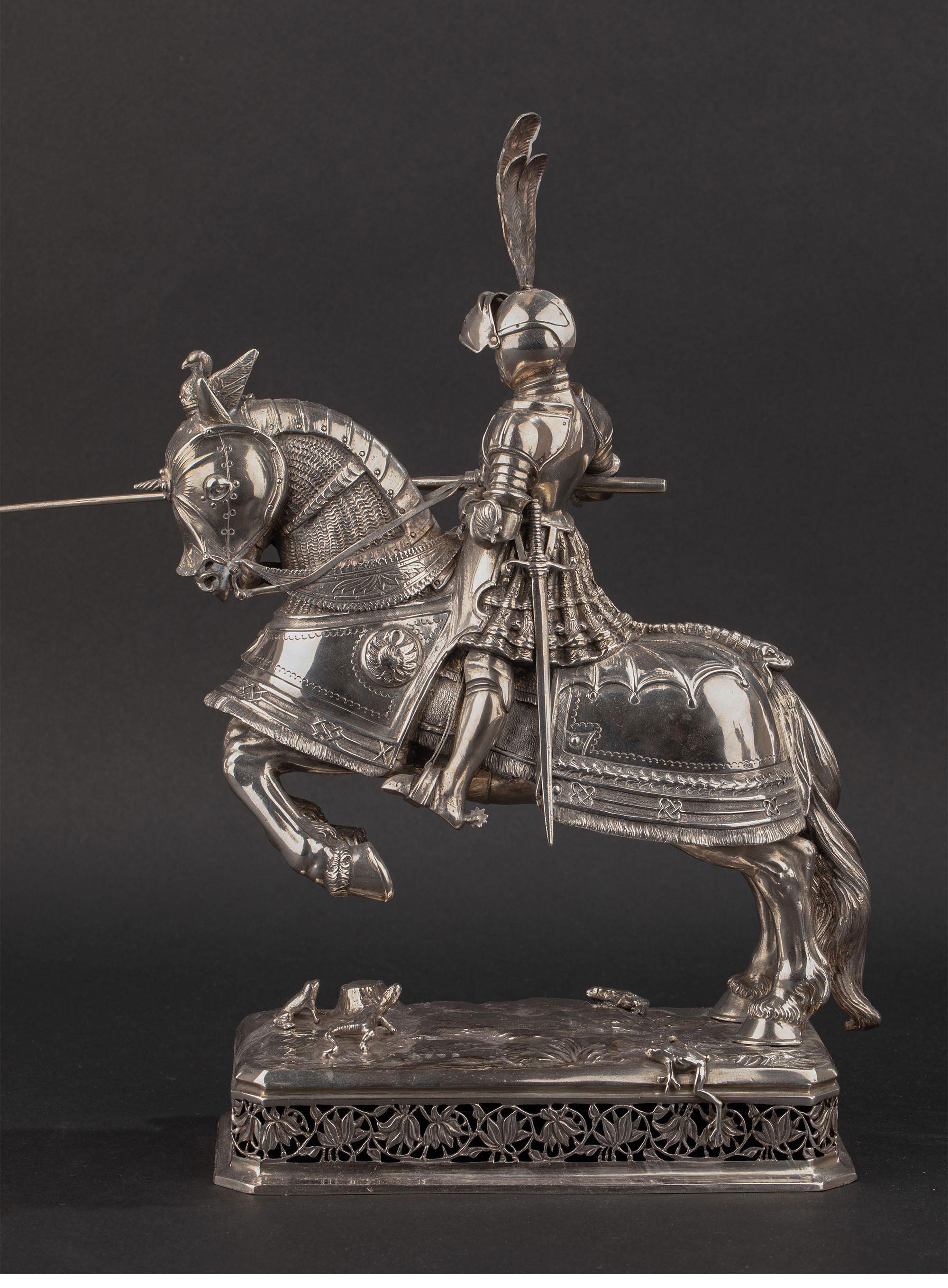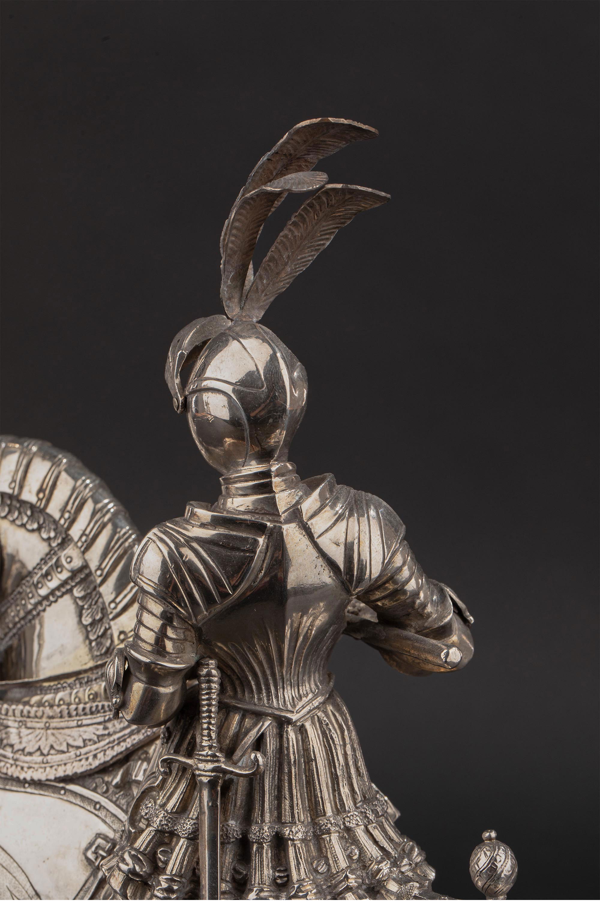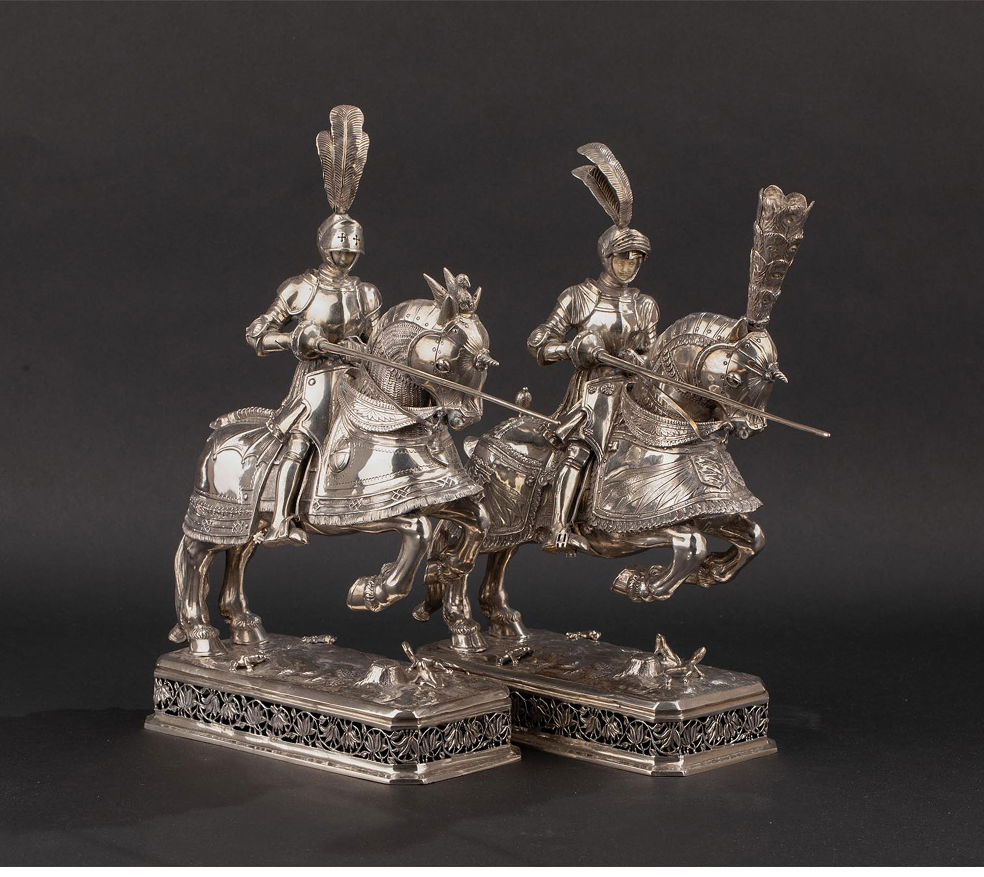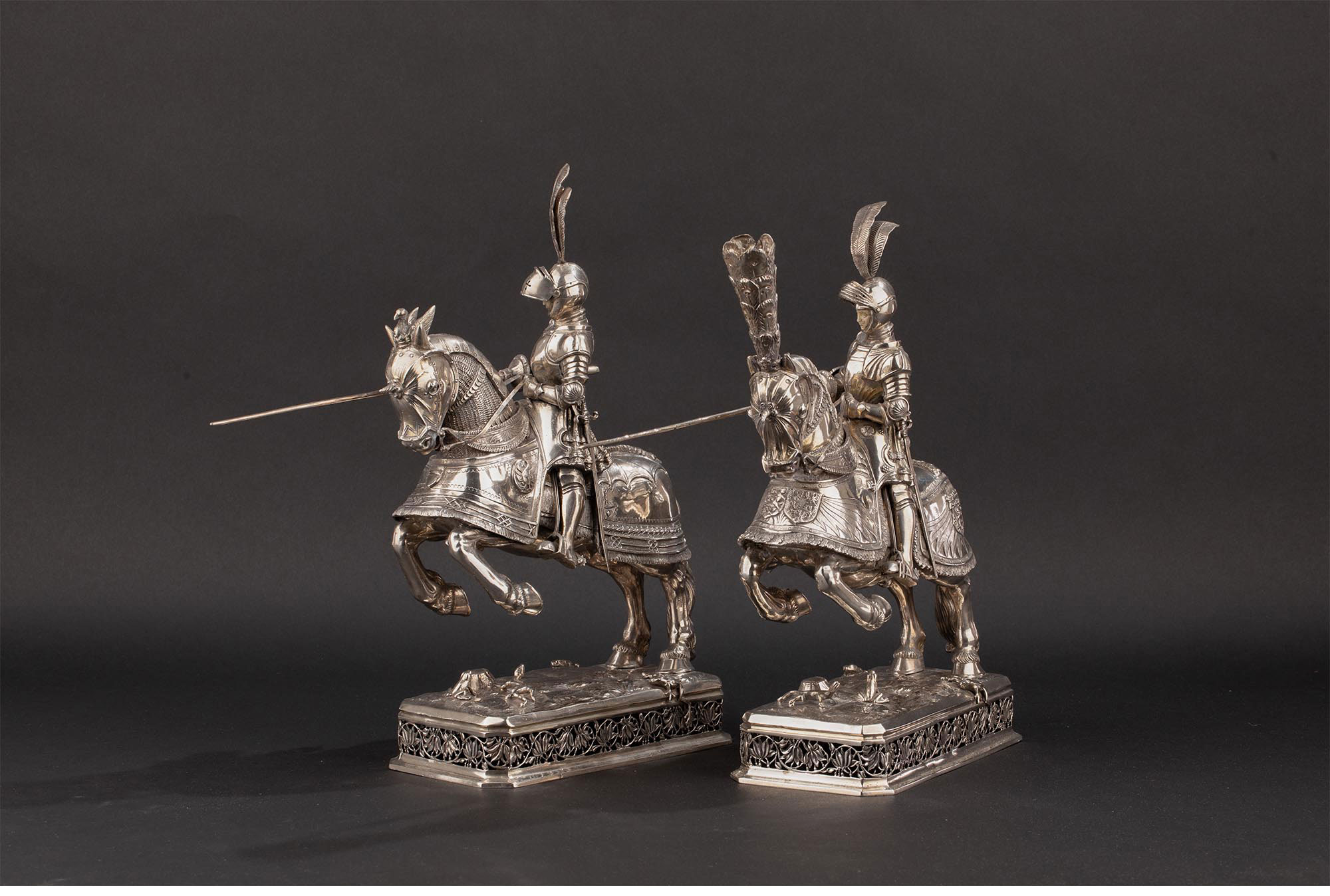 1927年英国伦敦出品纯银精雕「长矛骑士」主题雕像摆件一对