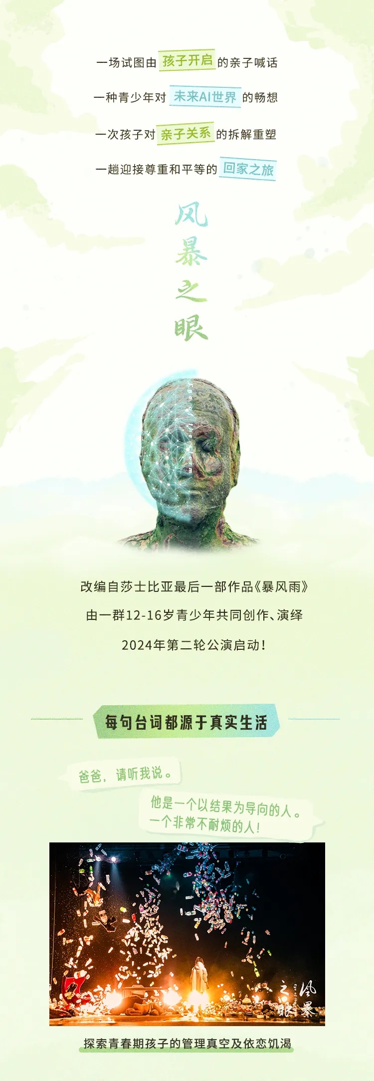该剧改编自莎士比亚最后一部戏剧作品《暴风雨》,由直面鸿沟青年剧团的青年演员们集体参与创编。众所周知,《暴风雨》是被改编过最多的一部莎翁戏剧。那么,在AI时代大面积来临之际,这部由青春期孩子参与创编及表演的莎剧经典会有怎样不同以往的呈现?