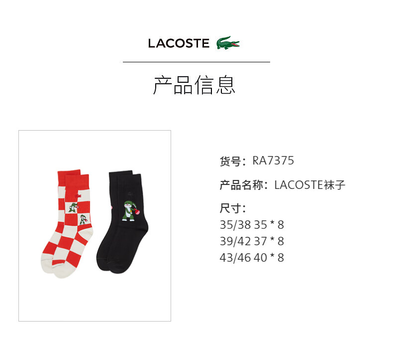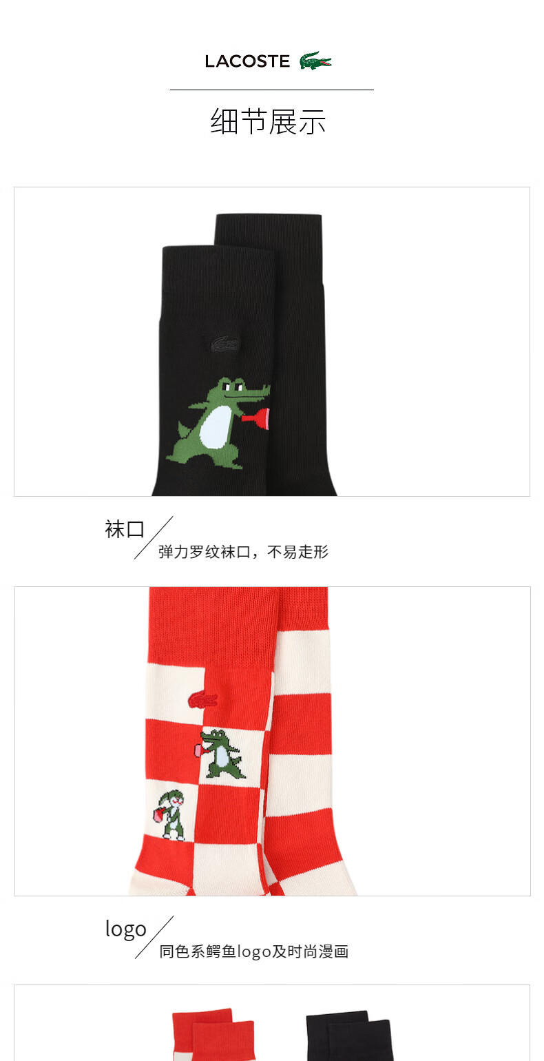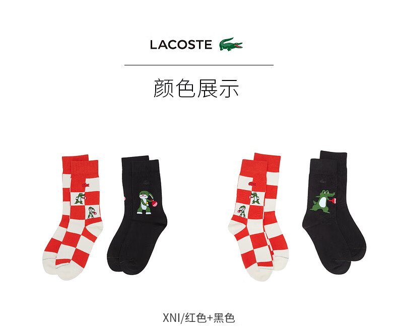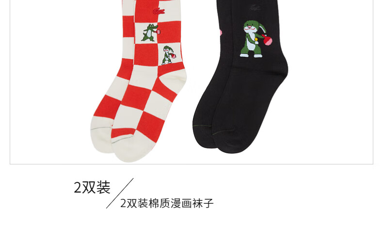 Lacoste法国鳄鱼配件舒适休闲潮流格纹黑色2对装袜子男RA7375-98