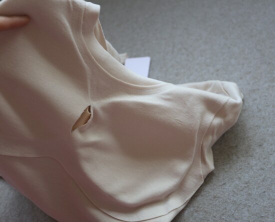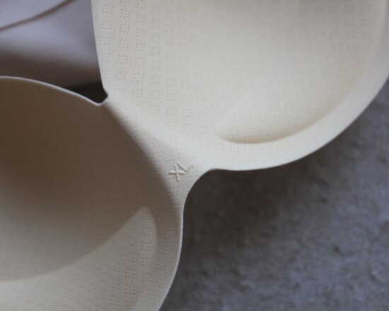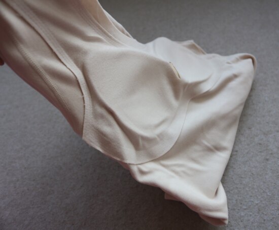胸垫的这块布料 连接至肩头 周圈是用超声波热压粘合的点胶工艺 没有缝线