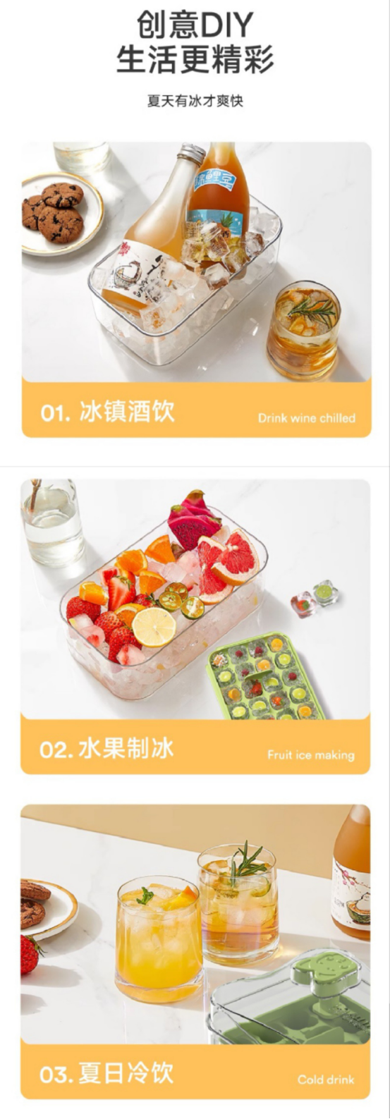 🔺快速制冰,冰爽即刻 一键按压设计 让你在短时间内就能拥有晶莹剔透的冰块 无论是冷饮、果汁还是啤酒 只需轻轻一按,冰块即刻呈现 让你的饮品迅速降温,享受冰爽滋味~ 🔺环保材质,安全无忧 确保冰块的安全与卫生 材质耐用,不易变形或破裂 让你在使用过程中更加放心