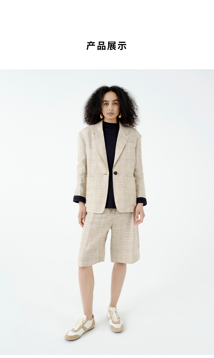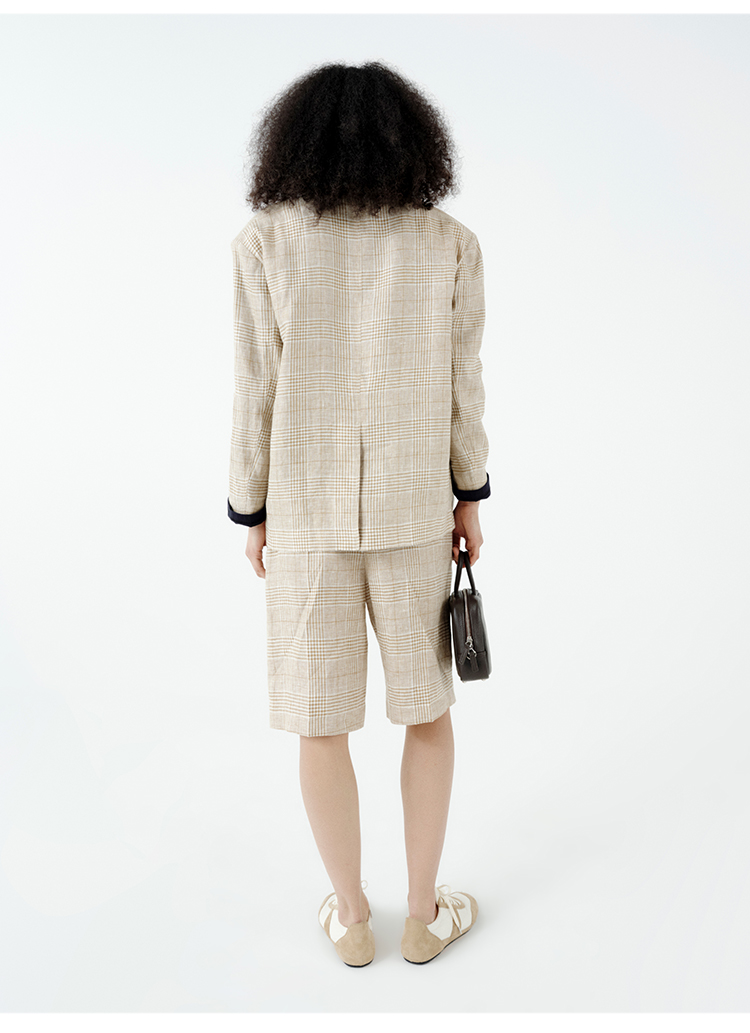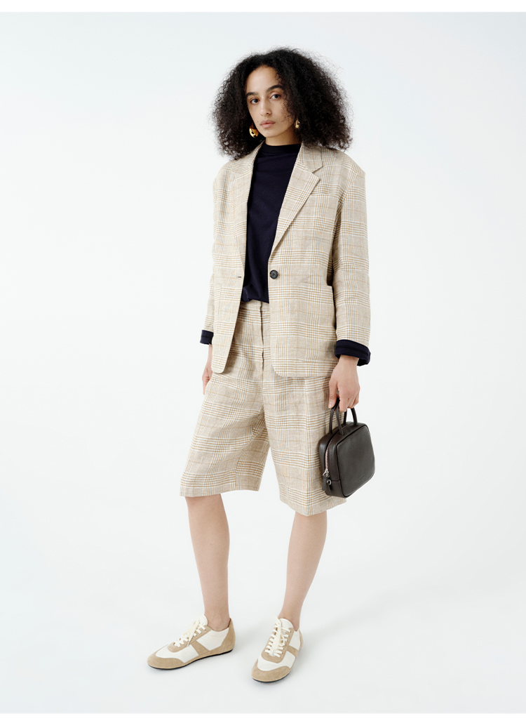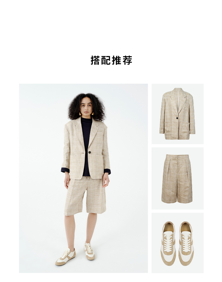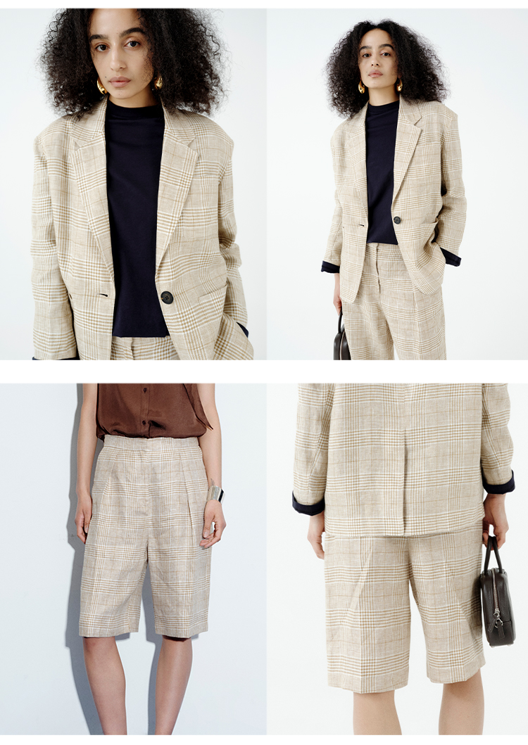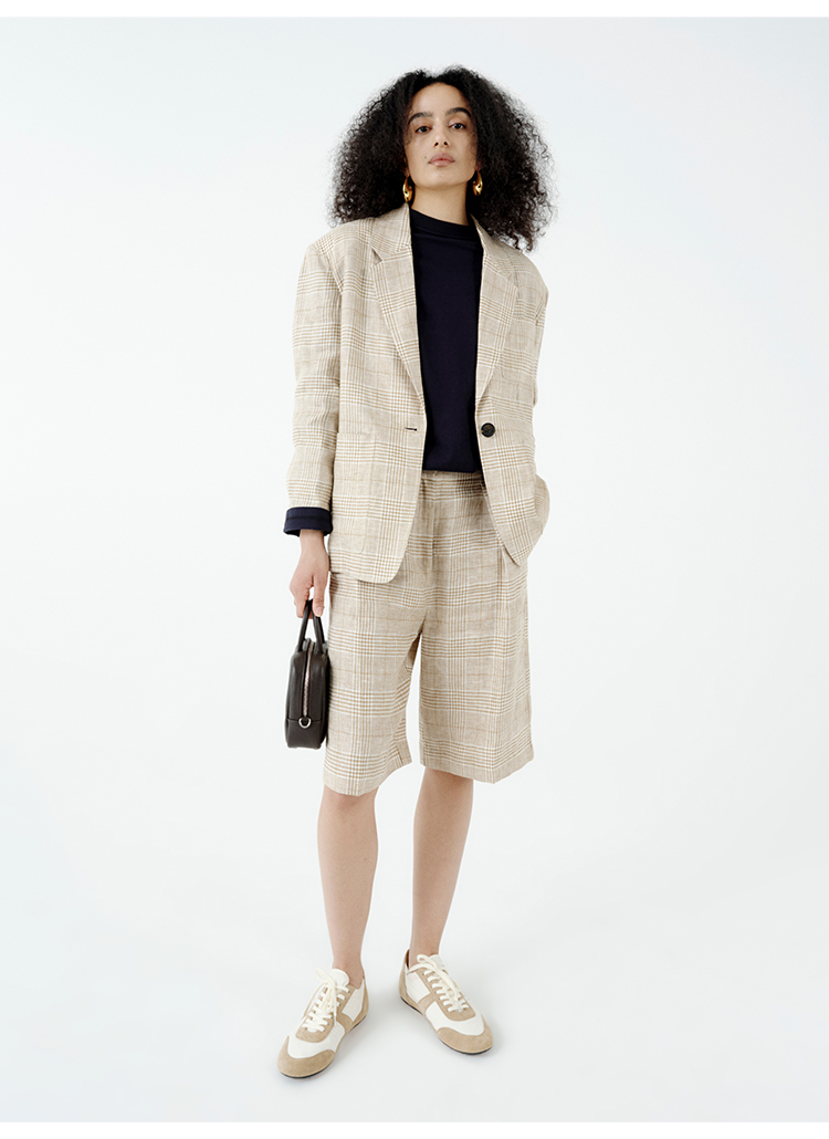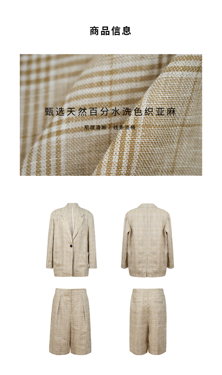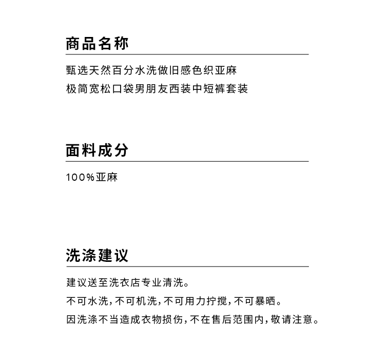 HIDEMI 甄选天然百分水洗做旧感色织亚麻极简宽松口袋男朋友西装中短裤套装