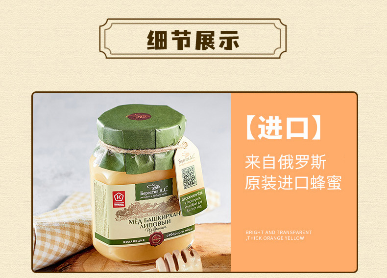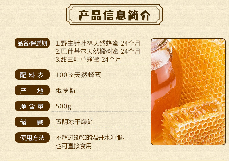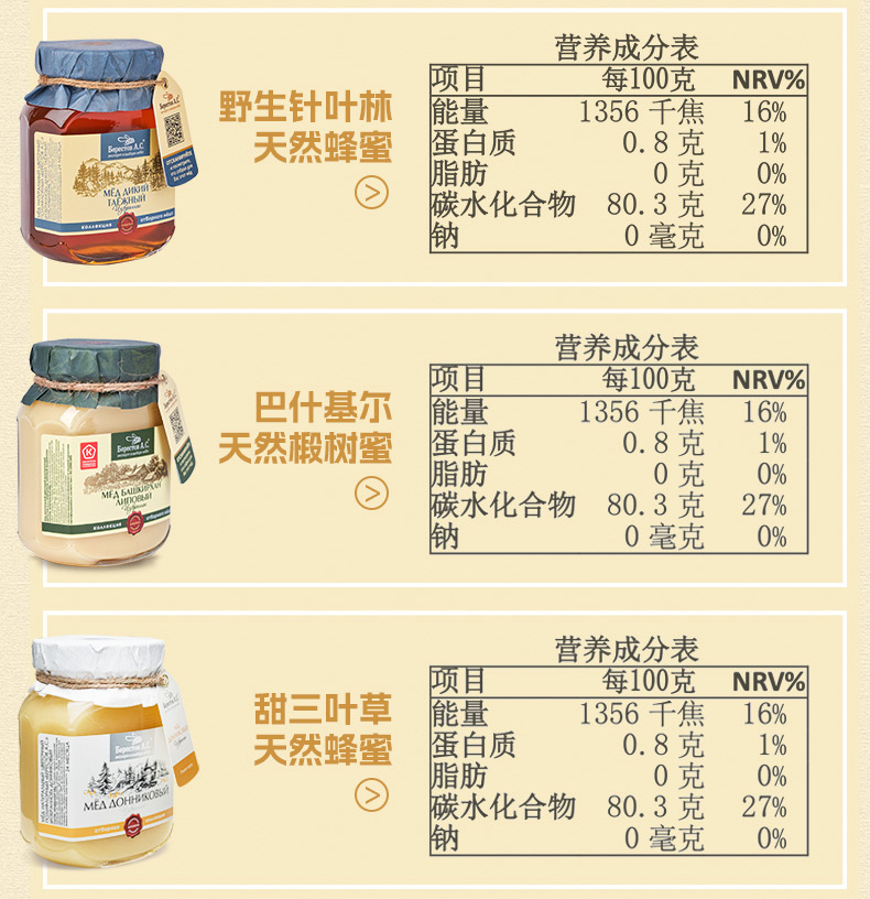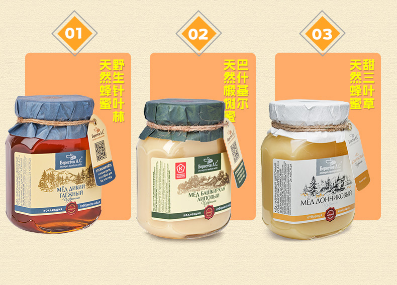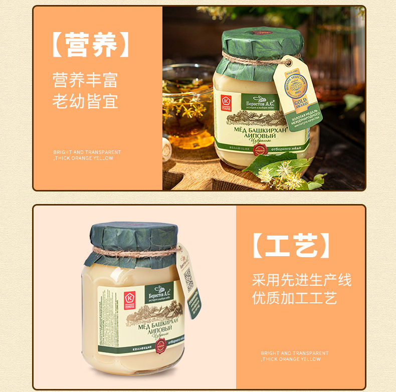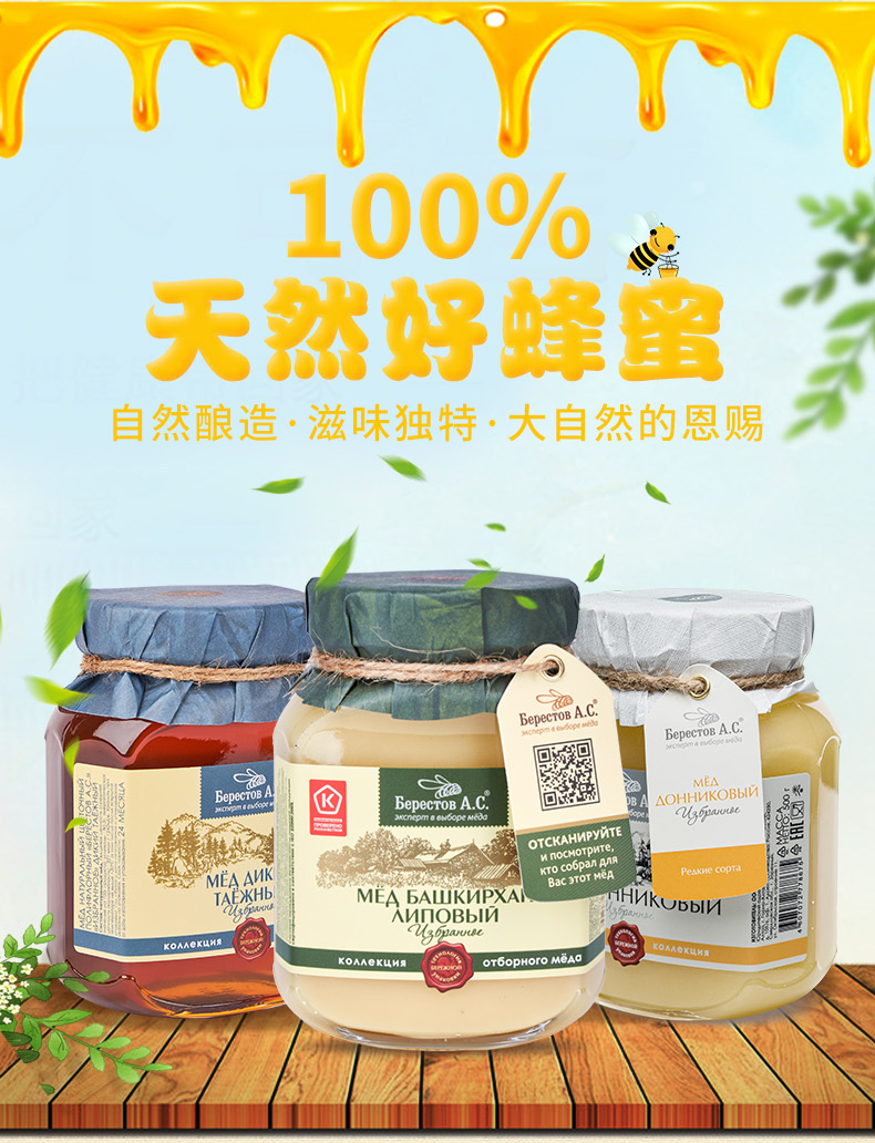 俄罗斯天然蜂蜜甜三叶草/巴什基尔椴树/野生针叶林500g/瓶