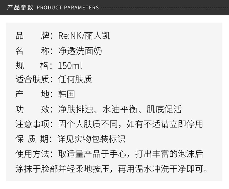 【韩国直邮】 韩国 Re:NK/丽人凯 净透洗面奶 150mlJPY带授权招加盟代理