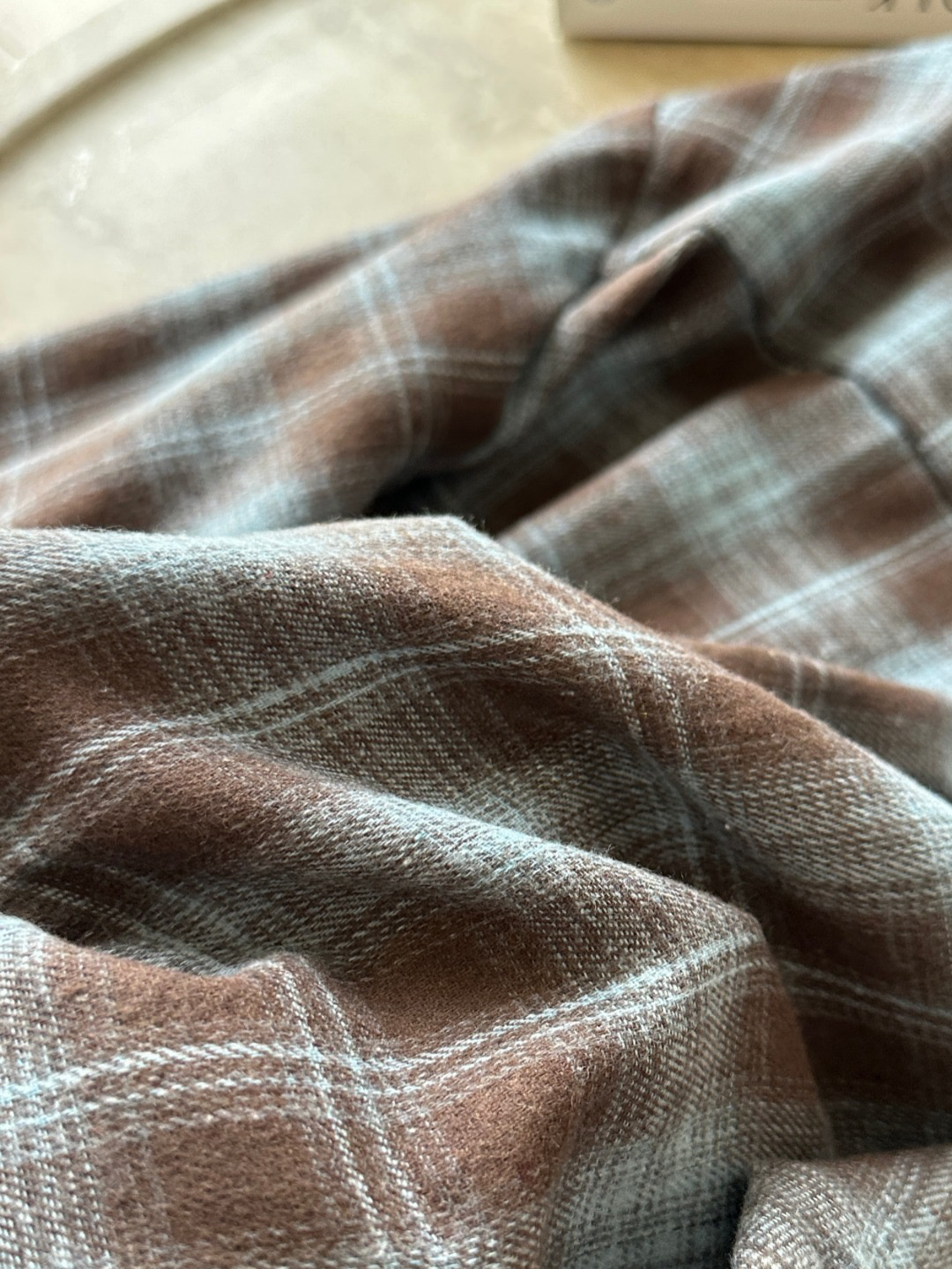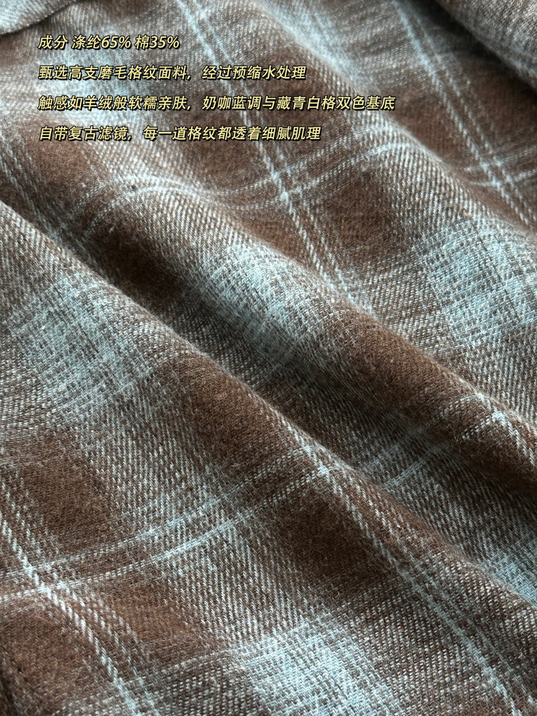 成分 涤纶65% 棉35%甄选高支磨毛格纹面料,经过预缩水处理,触感如羊绒般软糯亲肤,奶咖蓝调与藏青白格双色基底,自带复古滤镜,每一道格纹都透着细腻肌理。