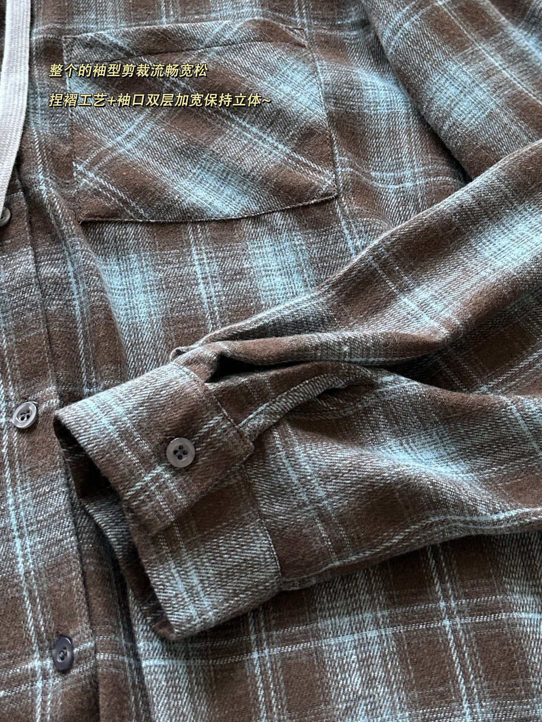 浅灰连帽设计,搭配同色系抽绳,让你在“美式复古”与“休闲运动”之间自由切换,前襟单排纽扣与双贴袋设计,既保留了衬衫的利落感,又增添了随性氛围。整个的袖型剪裁流畅宽松,捏褶工艺+袖口双层加宽保持立体~