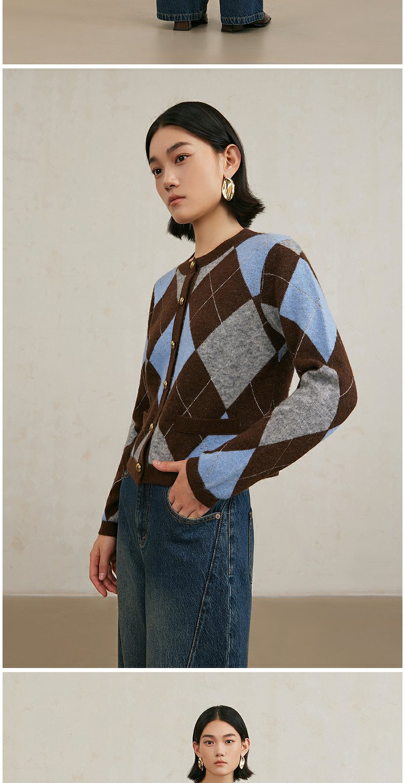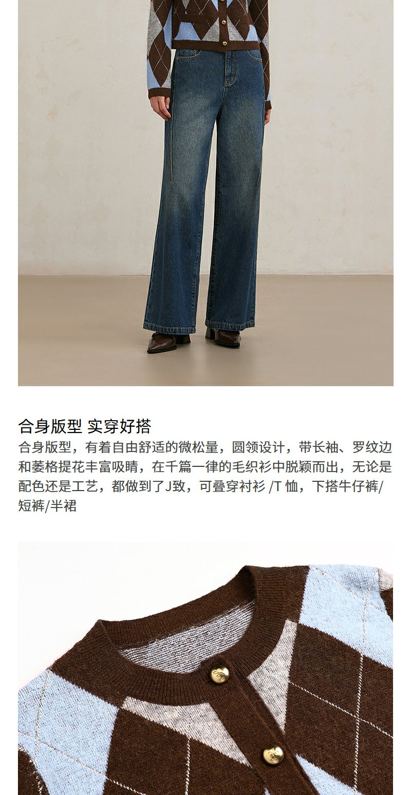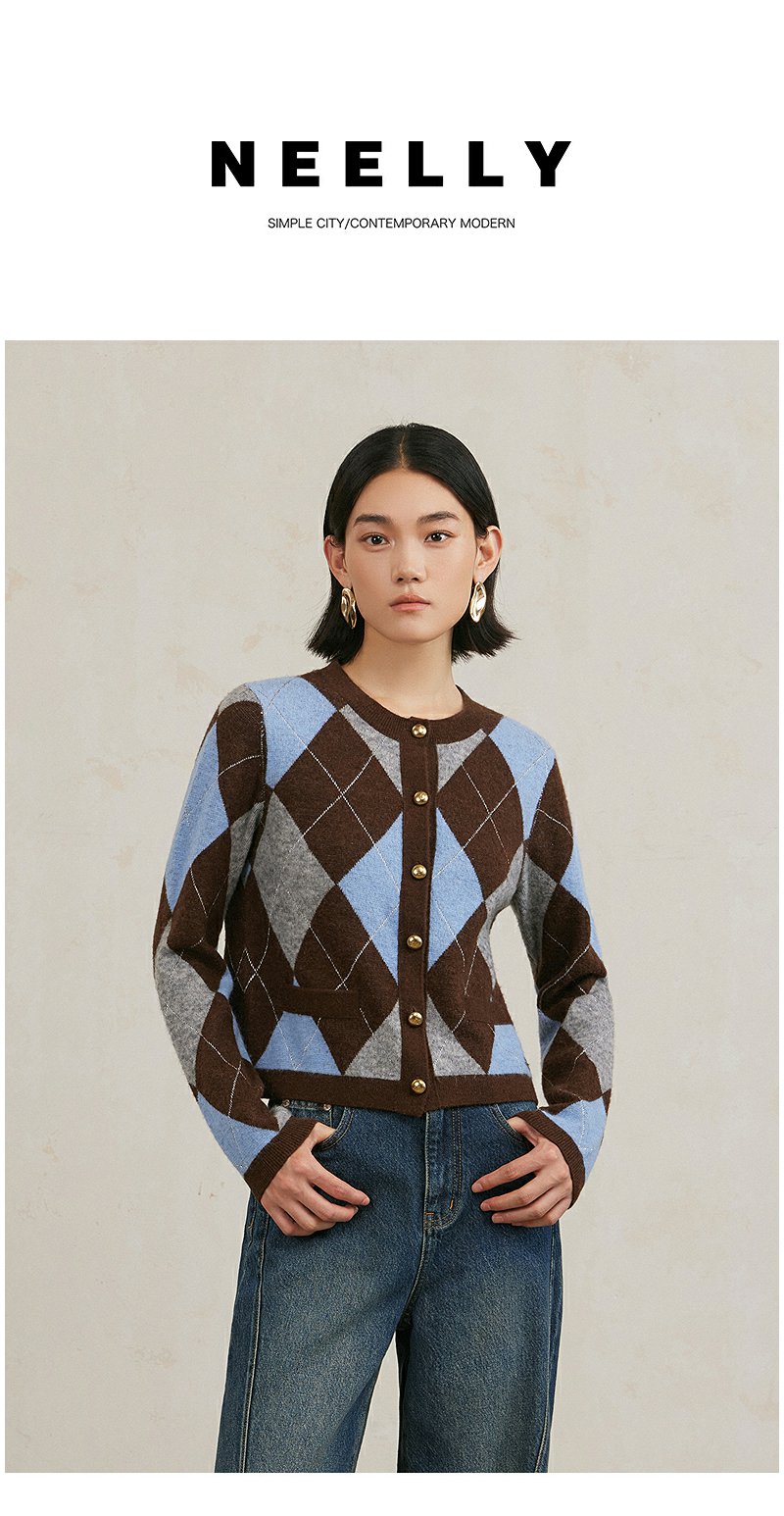 NEELLY纳俪商场同款冬季新款复古菱格圆领针织开衫女羊毛混纺毛衣N25104A04432