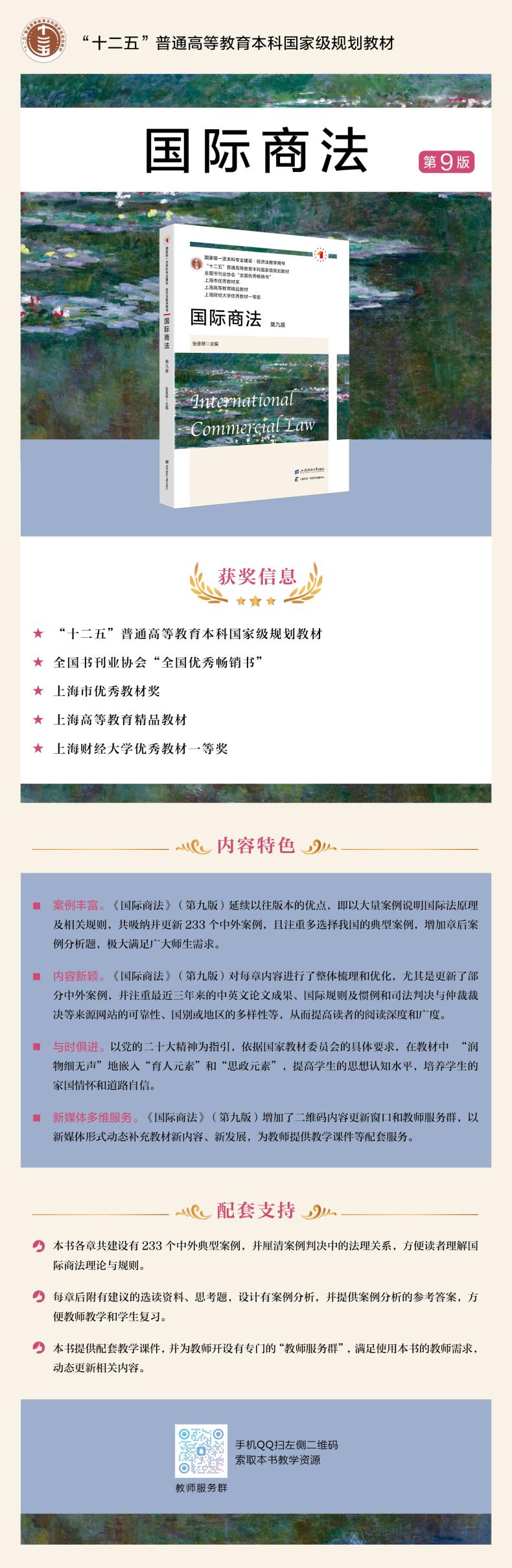 新媒体多维服务。《国际商法》(第九版)增加了二维码内容更新窗口和教师服务群,以新媒体形式动态补充教材新内容、新发展,为教师提供教学课件等配套服务。