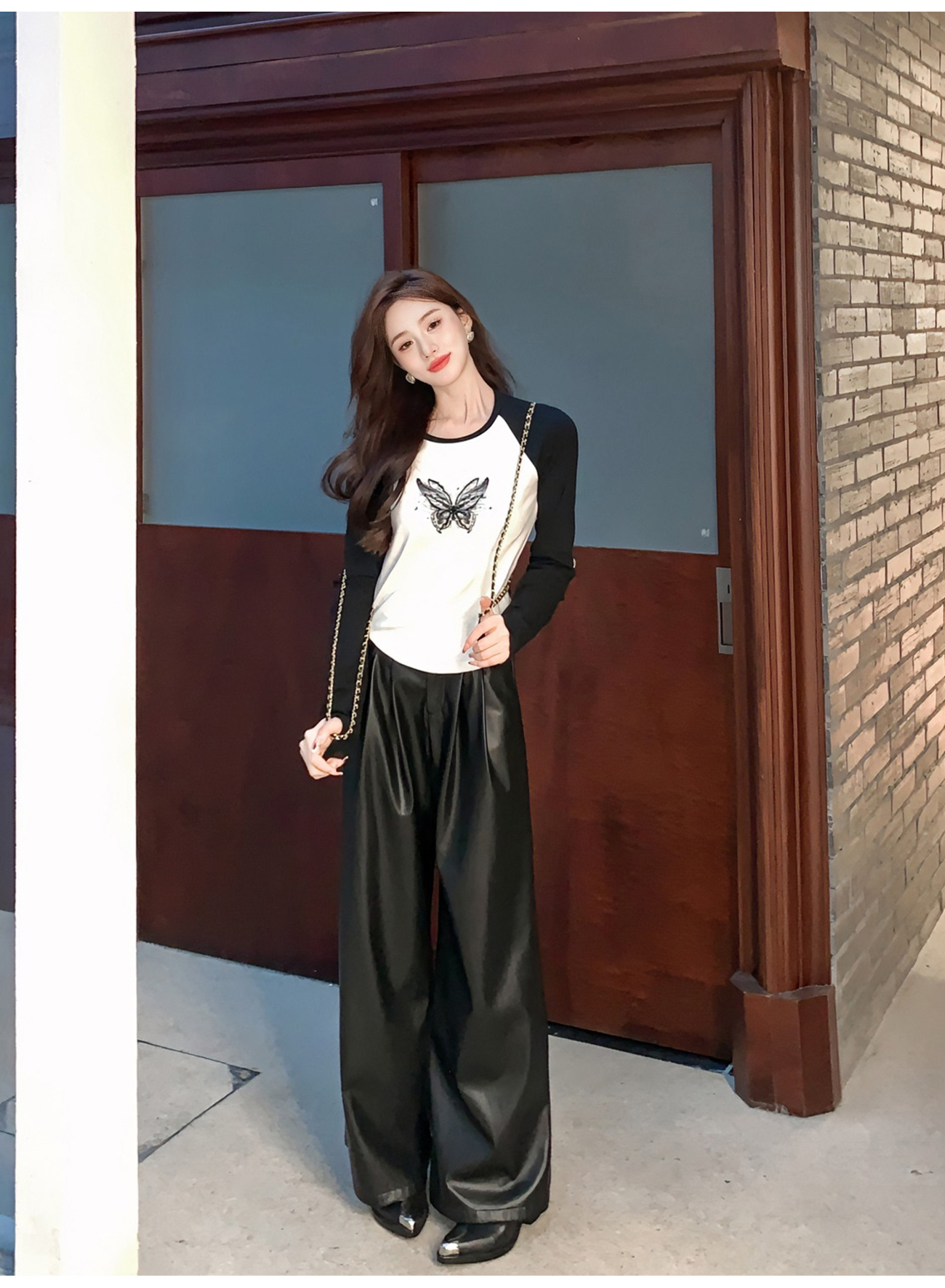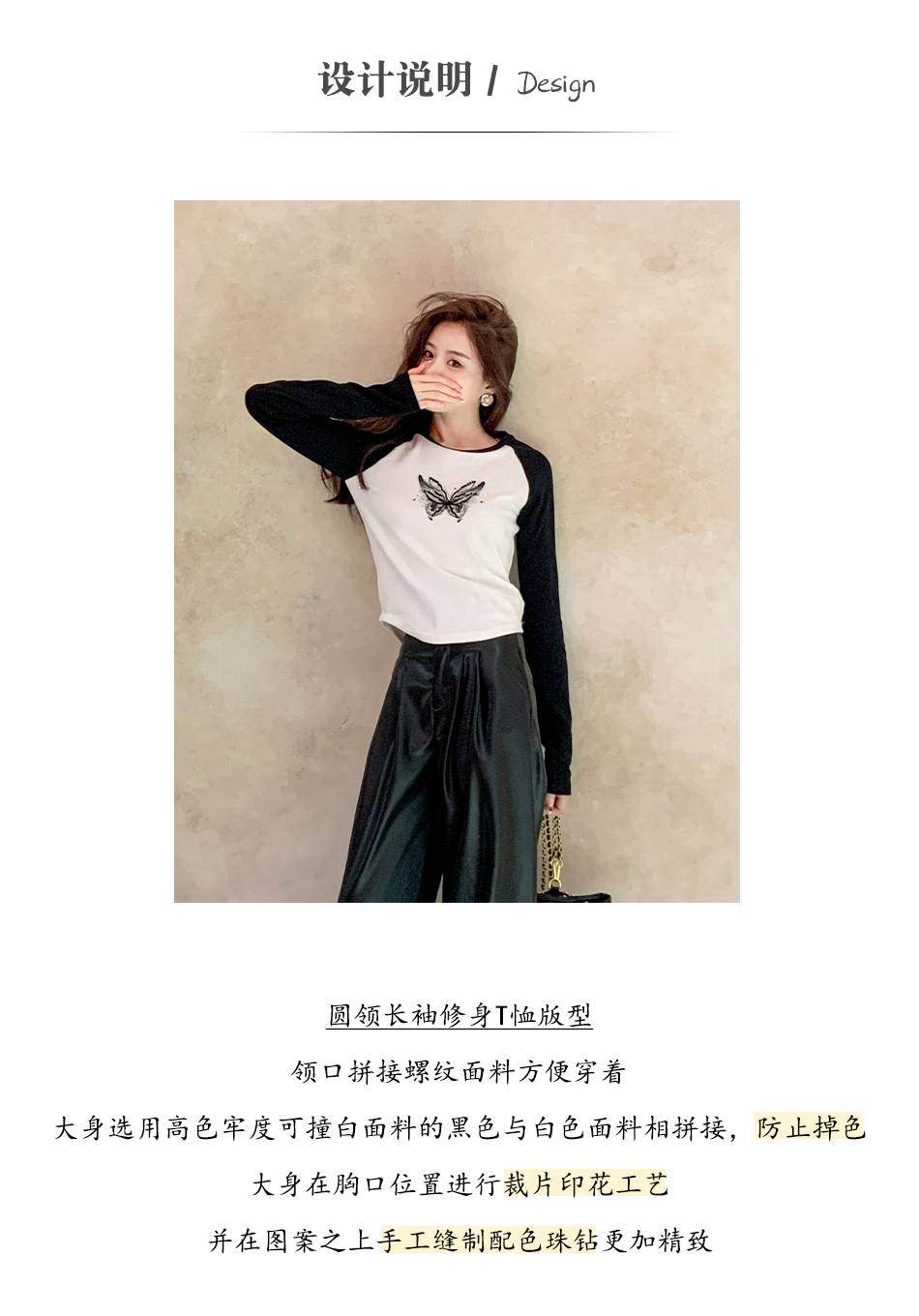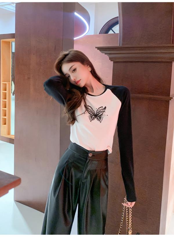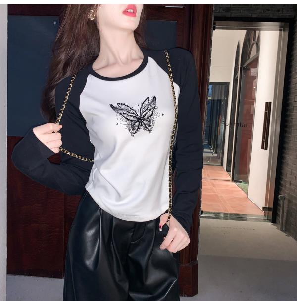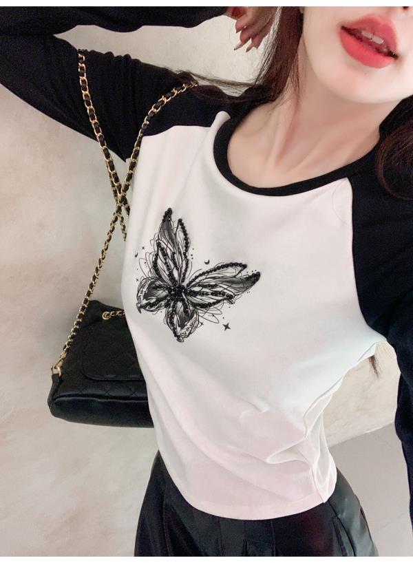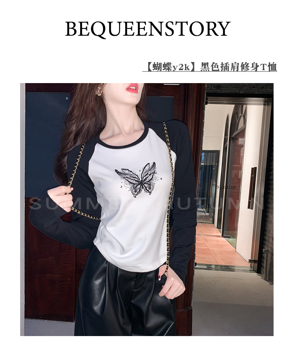 BeQueenStory 【蝴蝶y2k】街头辣妹黑色插肩修身长袖t恤打底上衣