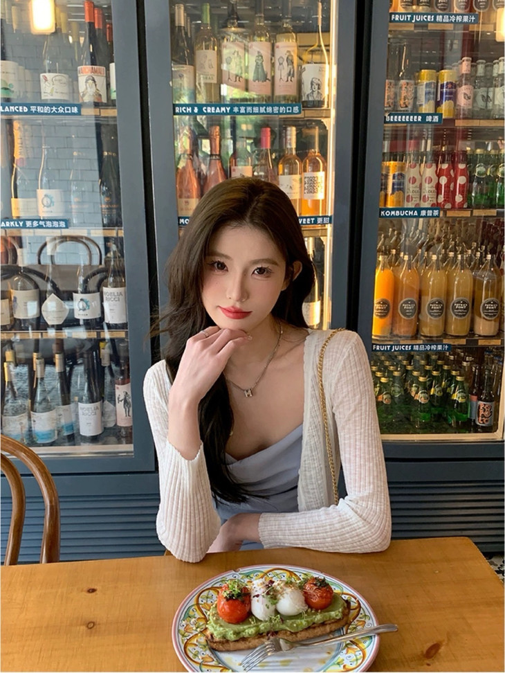 V领设计与大身相连 没有多余套口缝给予蕞舒适的穿搭体验 还很完美的修饰住了肩颈线条 适当的漏肤度上身更好看