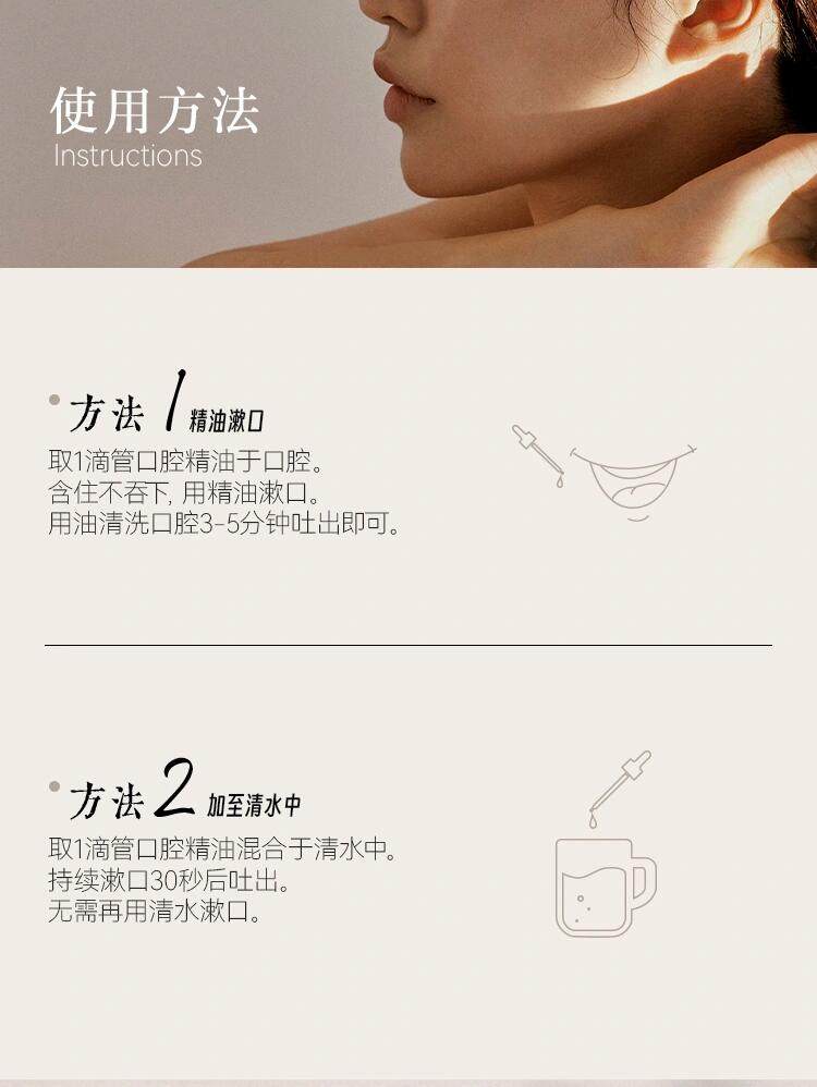 1.取1滴管口腔精油滴入口腔 漱口 3-5分钟吐出就可以