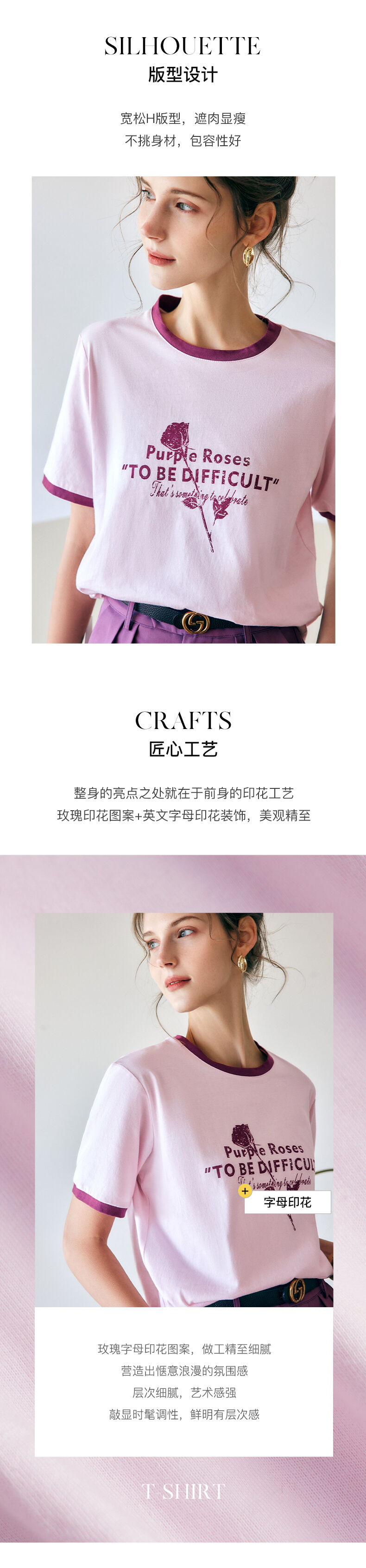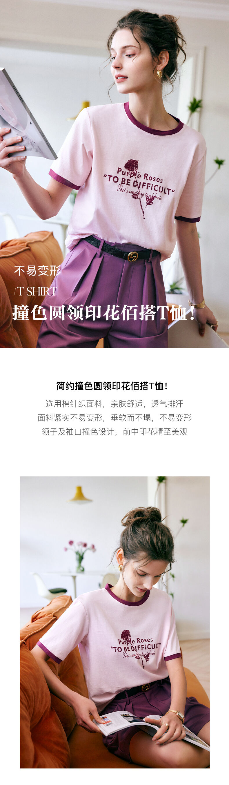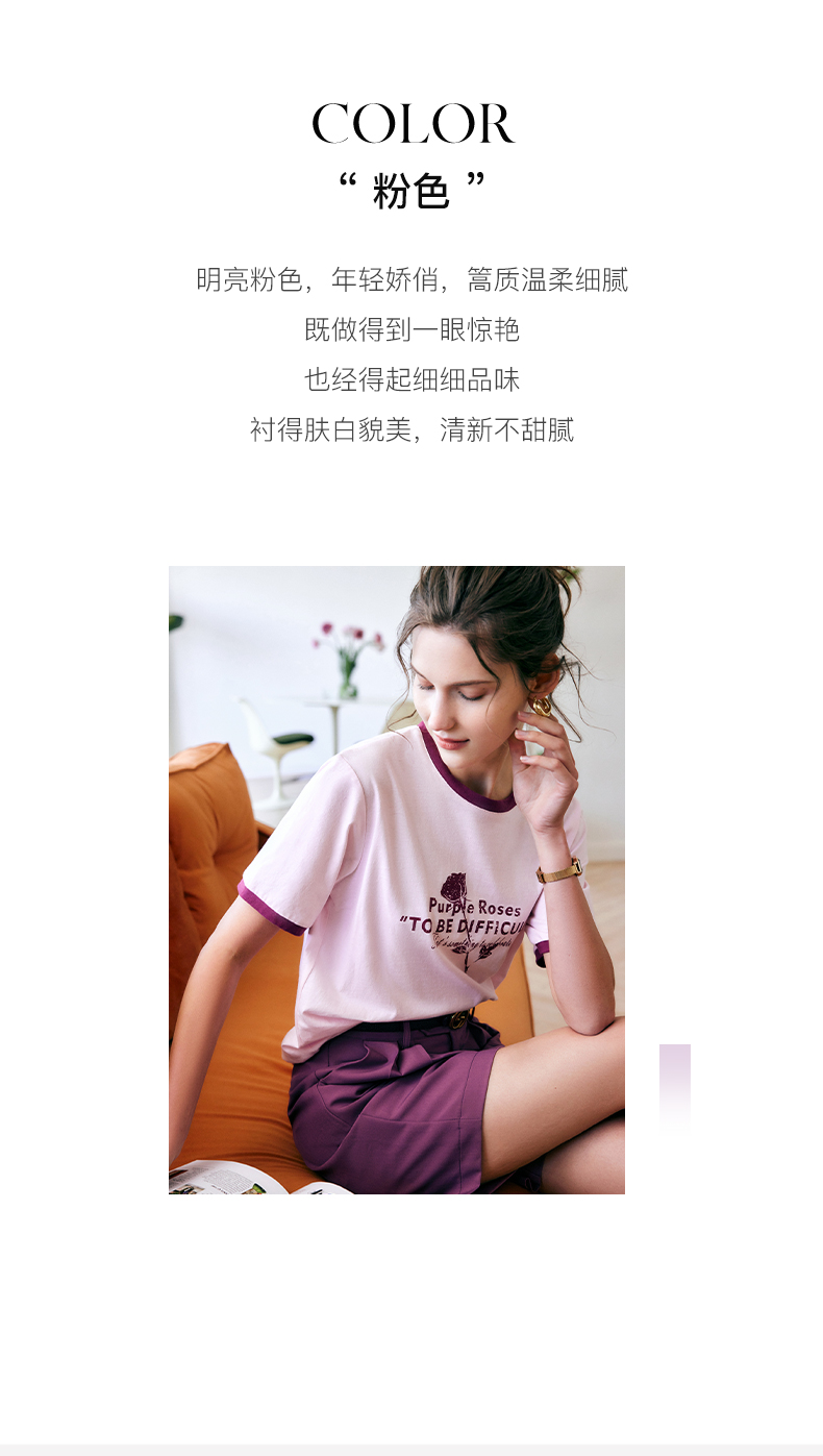 欧芮儿OLrain法式印花短袖t恤女夏季2022新款宽松圆领针织上衣