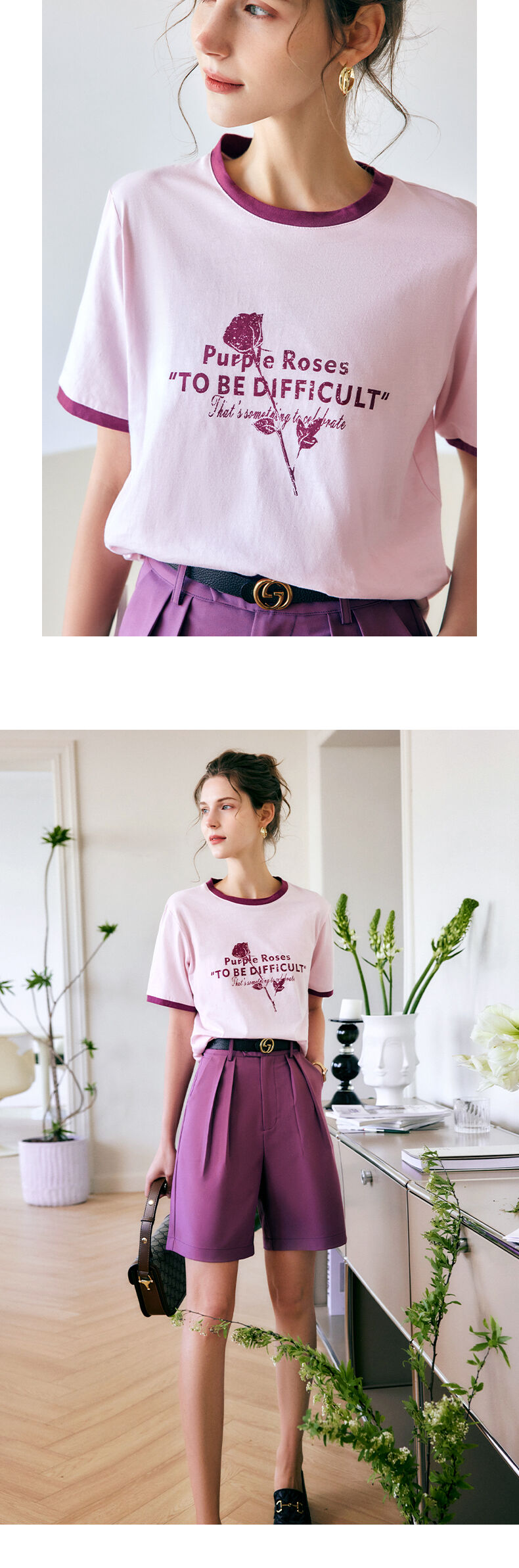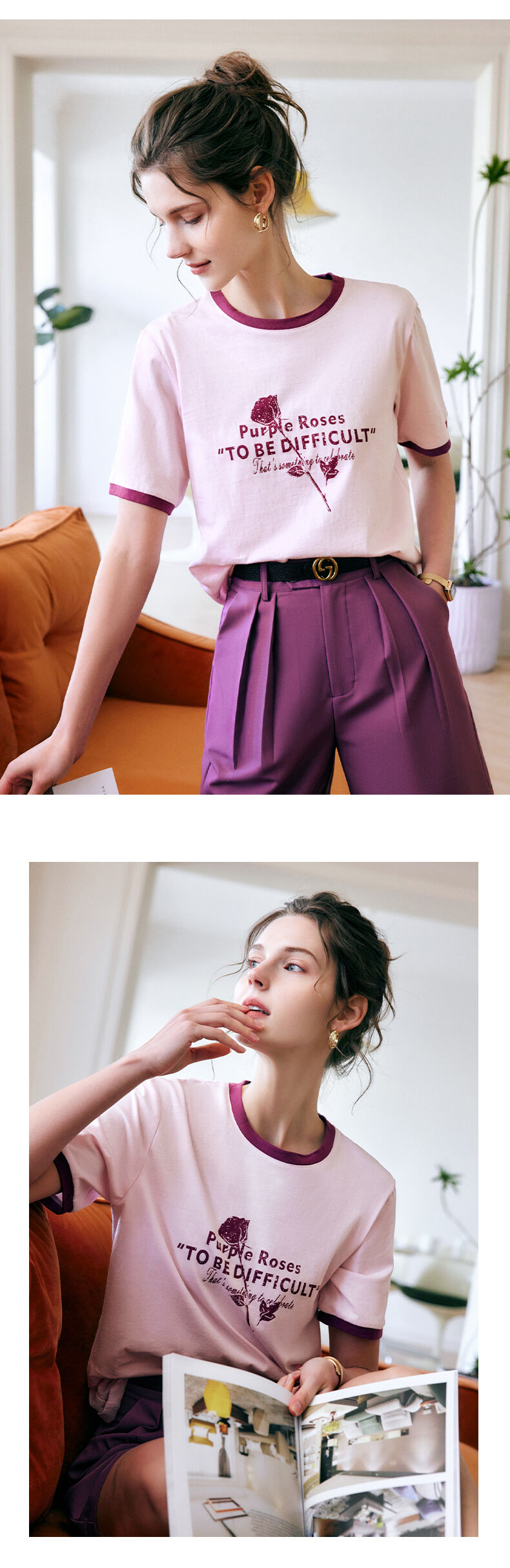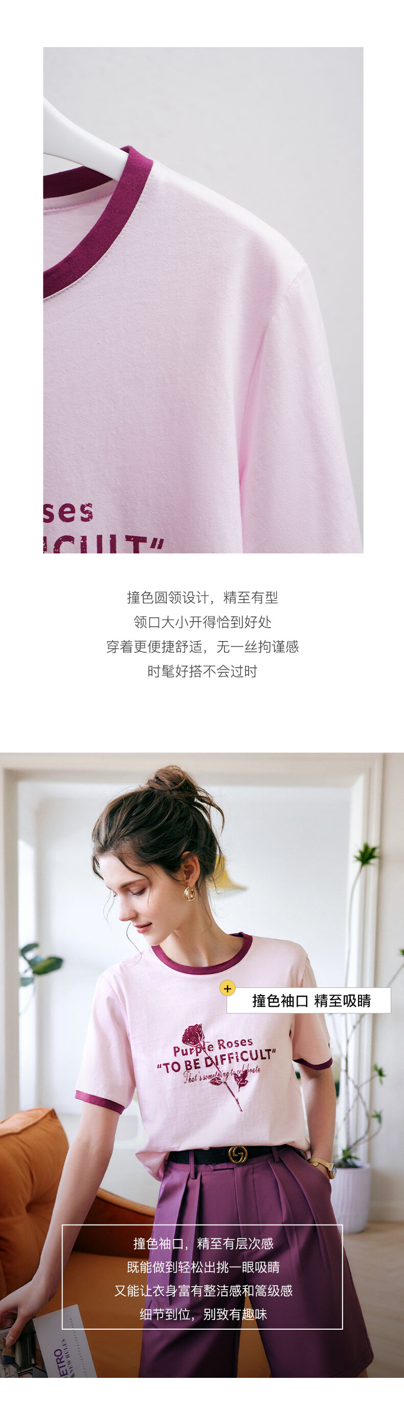 欧芮儿OLrain法式印花短袖t恤女夏季2022新款宽松圆领针织上衣