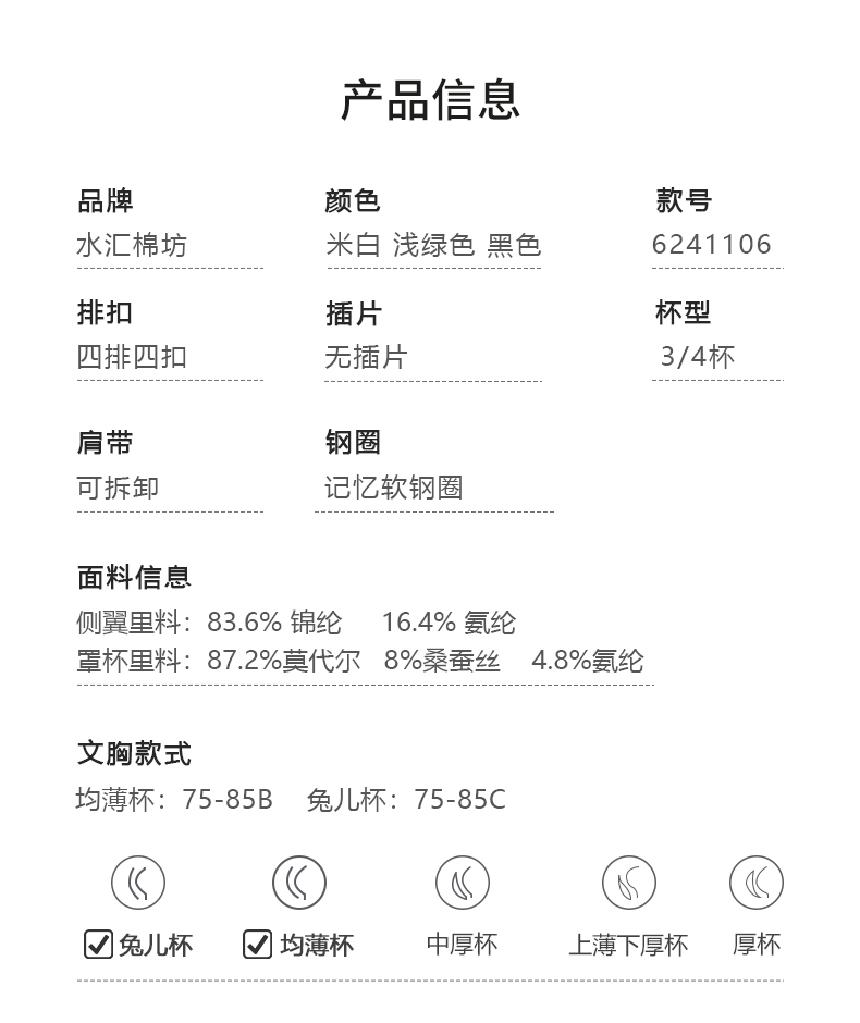 - 做一线的品质,卖二线的价格,让大家都买得起高品质的贴身衣物是我成立品牌的初衷。亲研贴心衣物十余年,用心筛选每一款面料。