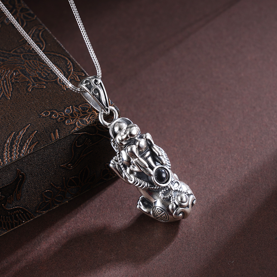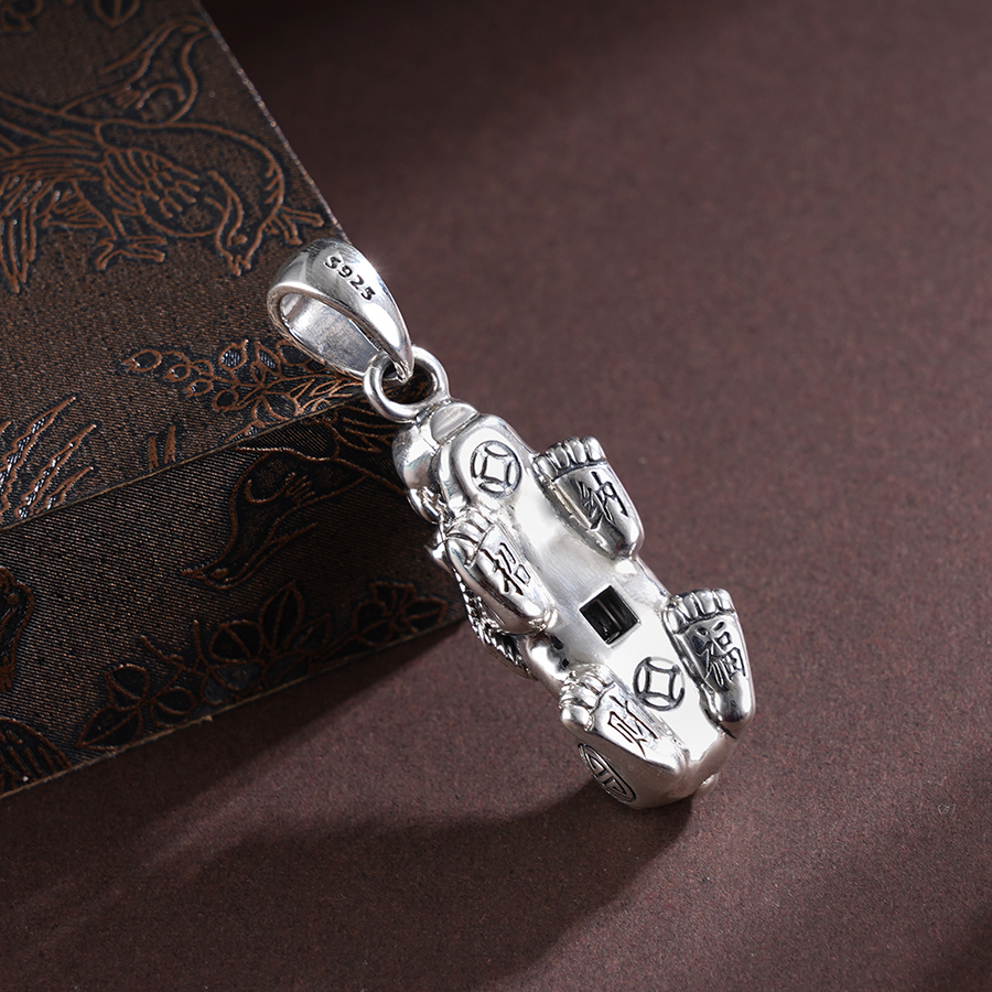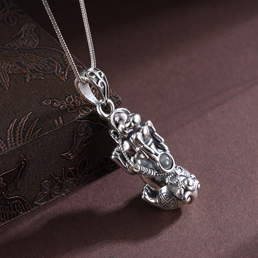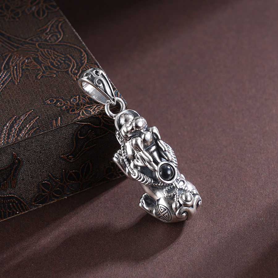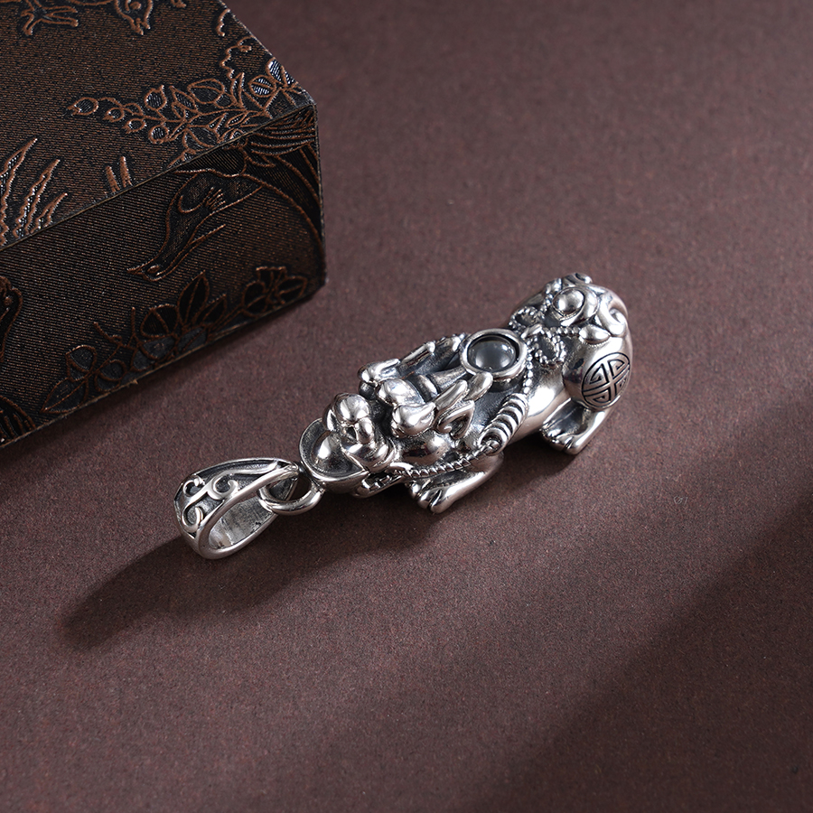 【寓意】:吊坠足银材质,设计灵感源自祥瑞神兽貔貅。貔貅呈匍匐姿姿势,口含元宝,寓意着财运附体,为佩戴者增添祥瑞与福气。