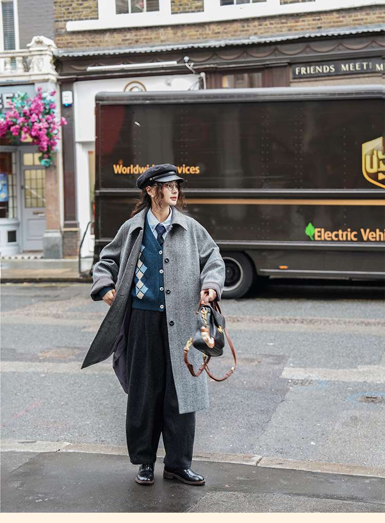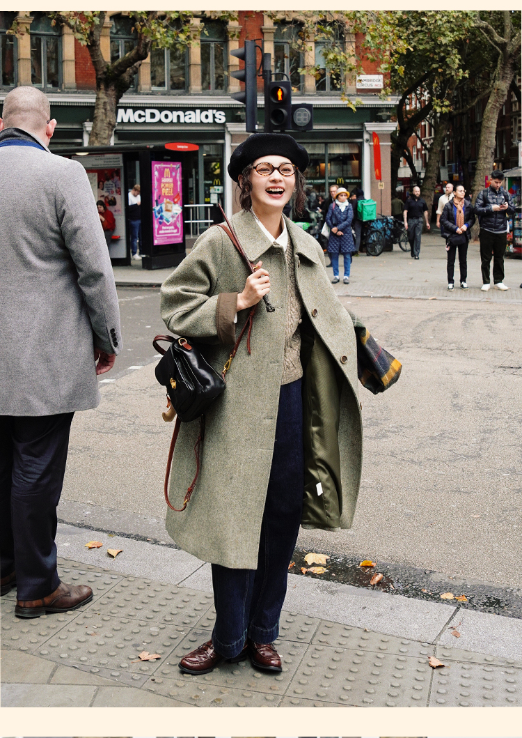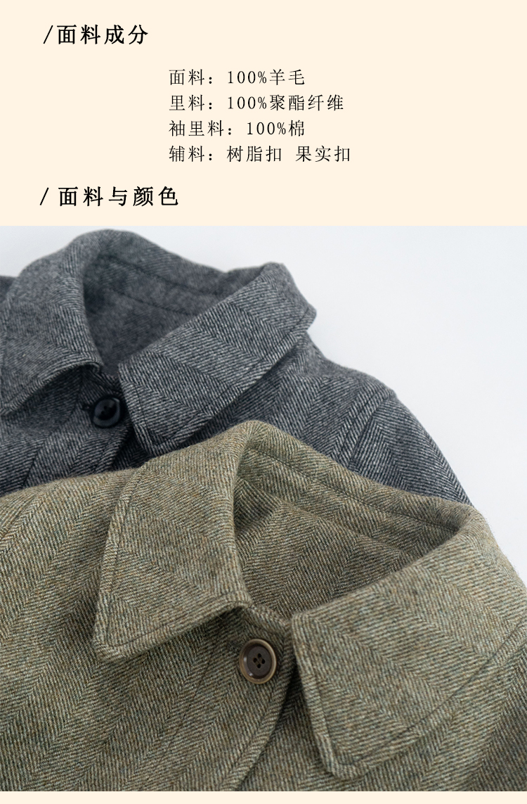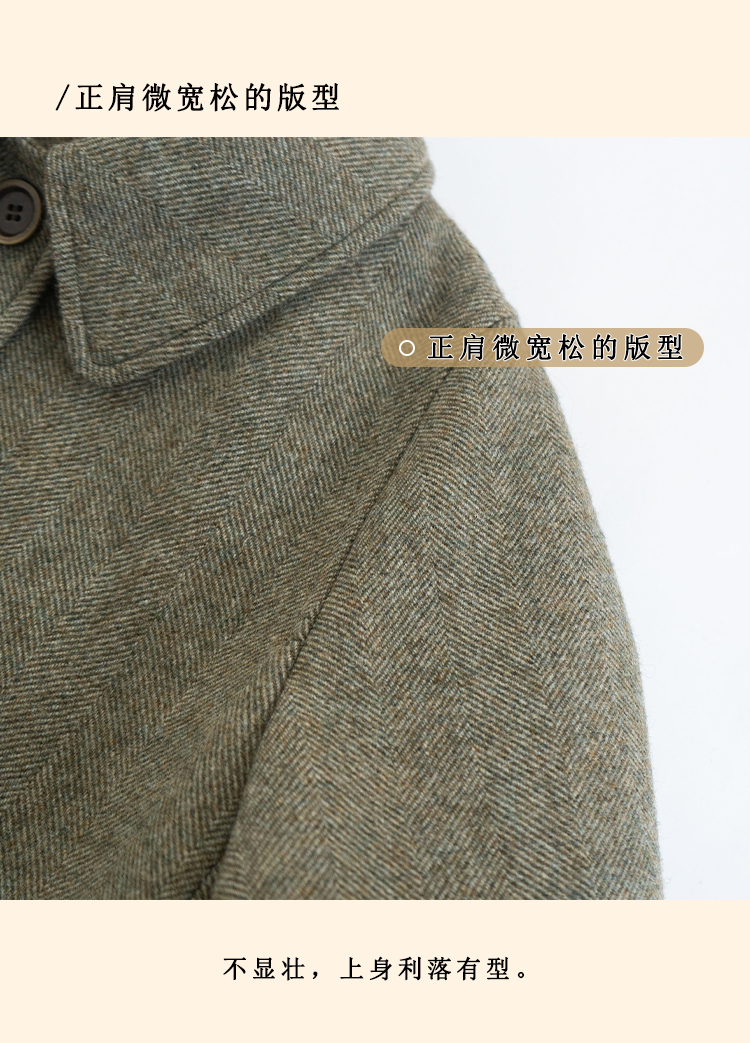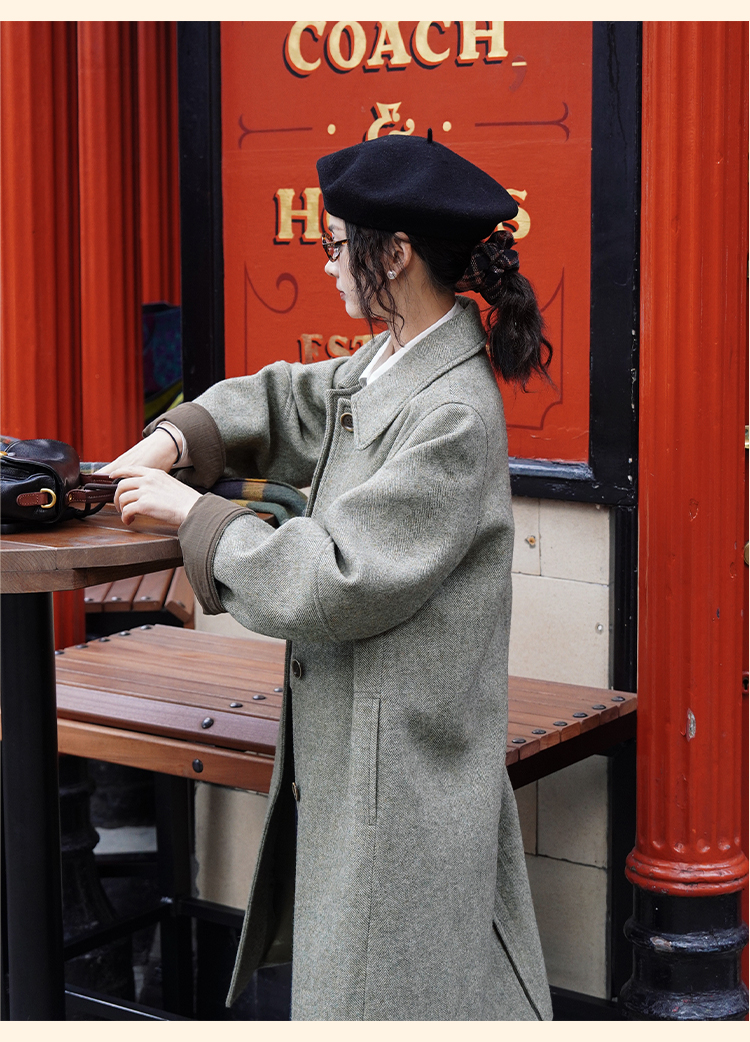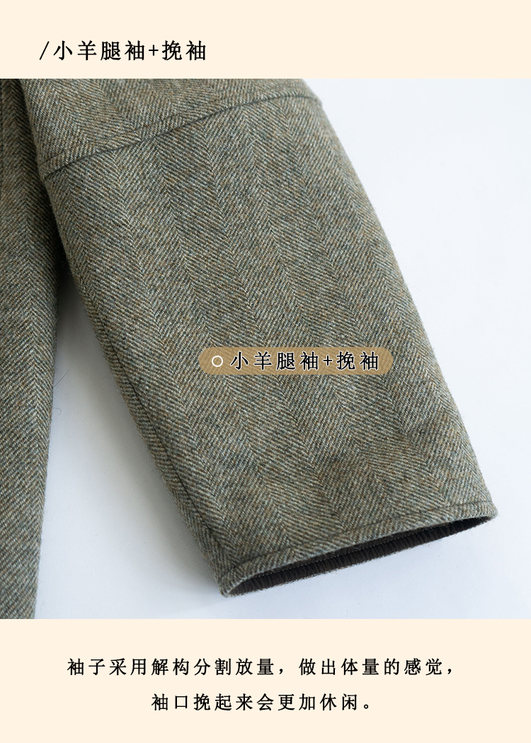 浮生八记/24C114/复古全羊毛人字纹羊腿袖卷袖口大衣