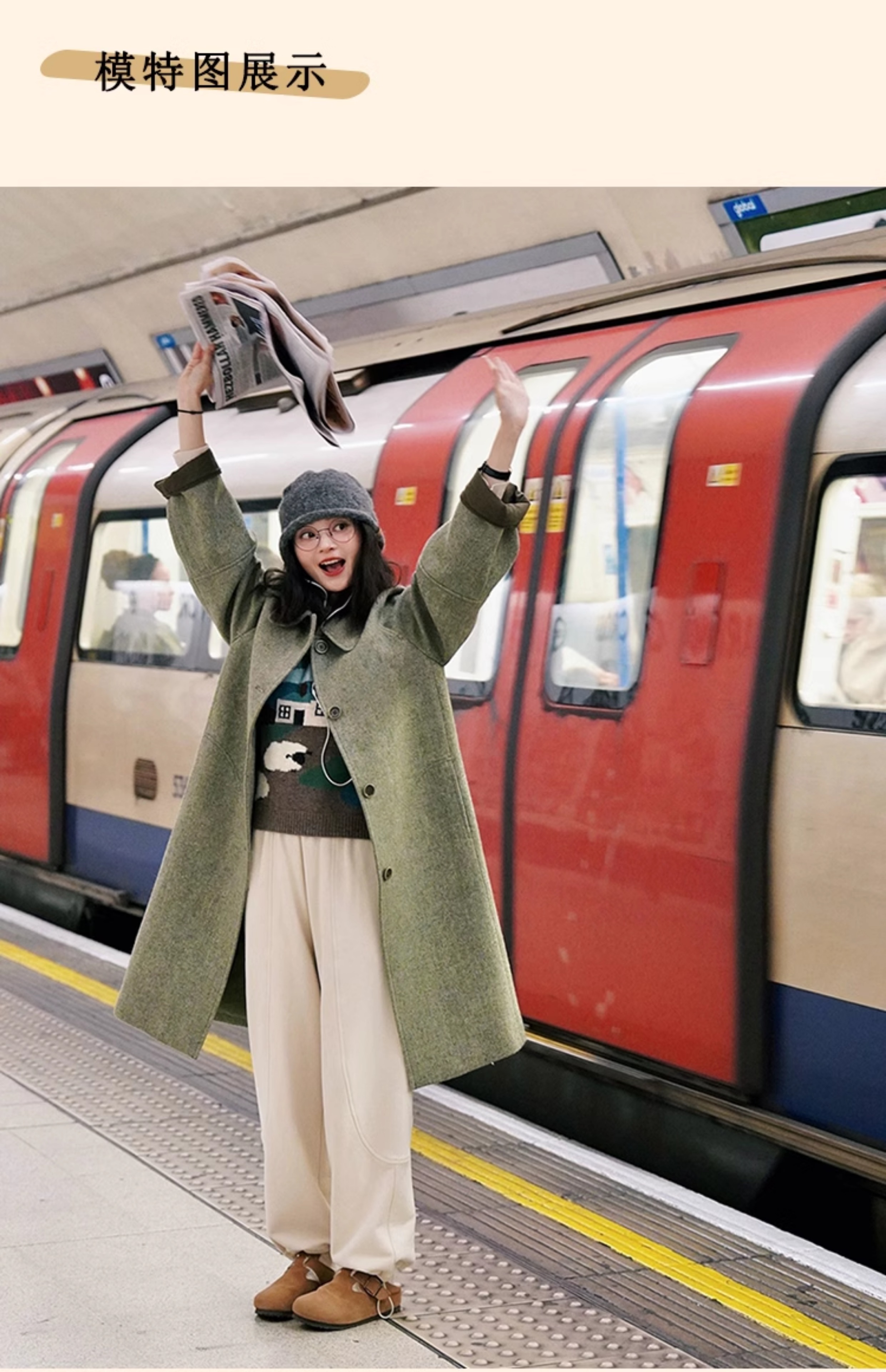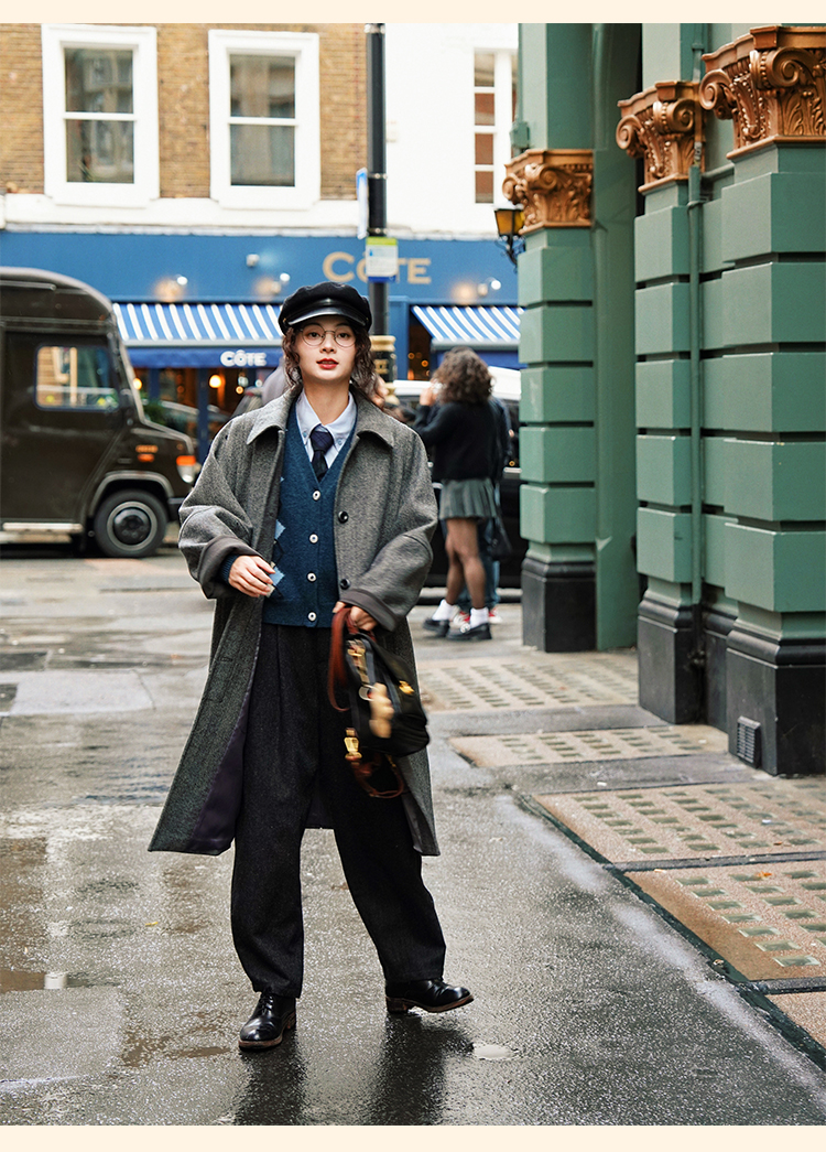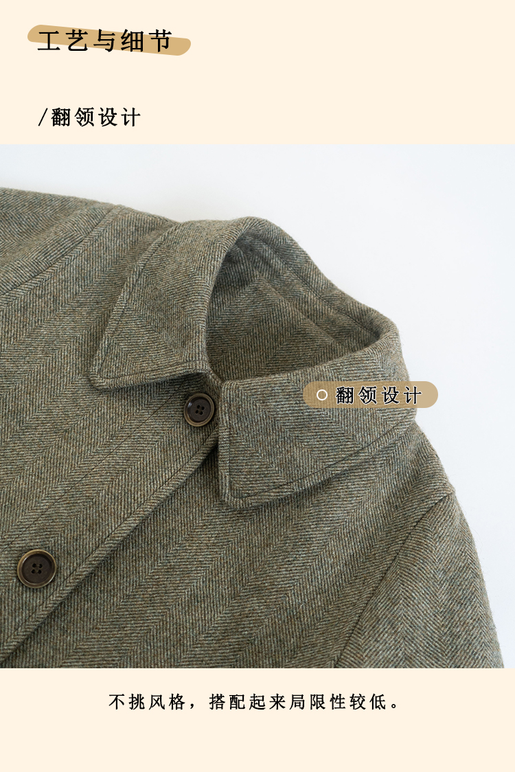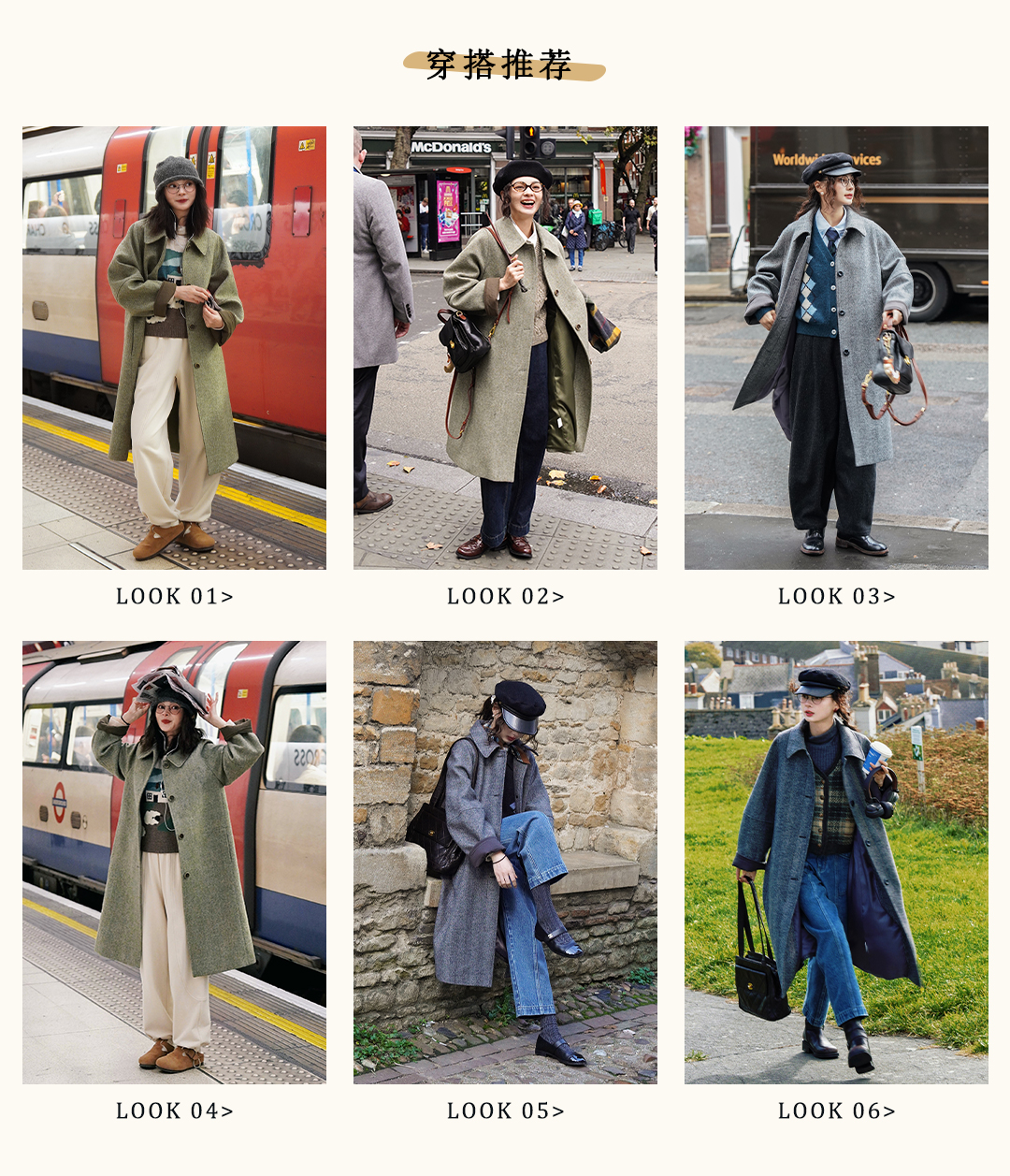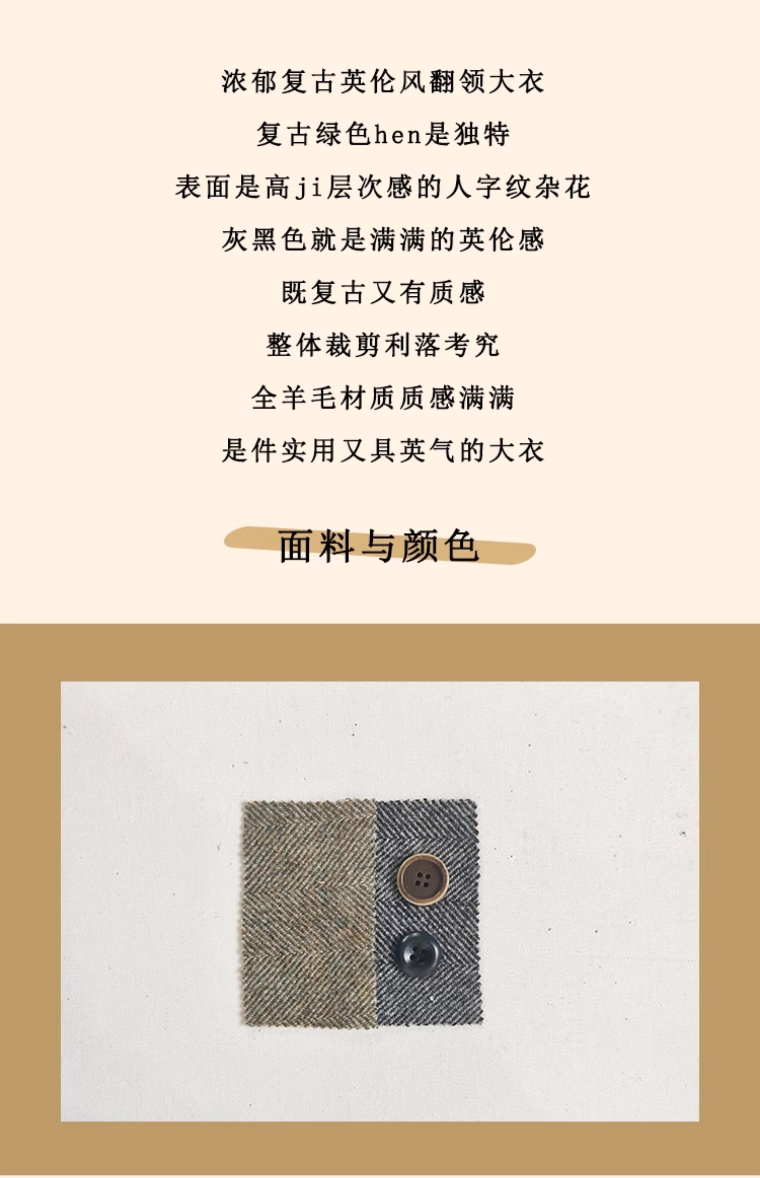 浮生八记/24C114/复古全羊毛人字纹羊腿袖卷袖口大衣