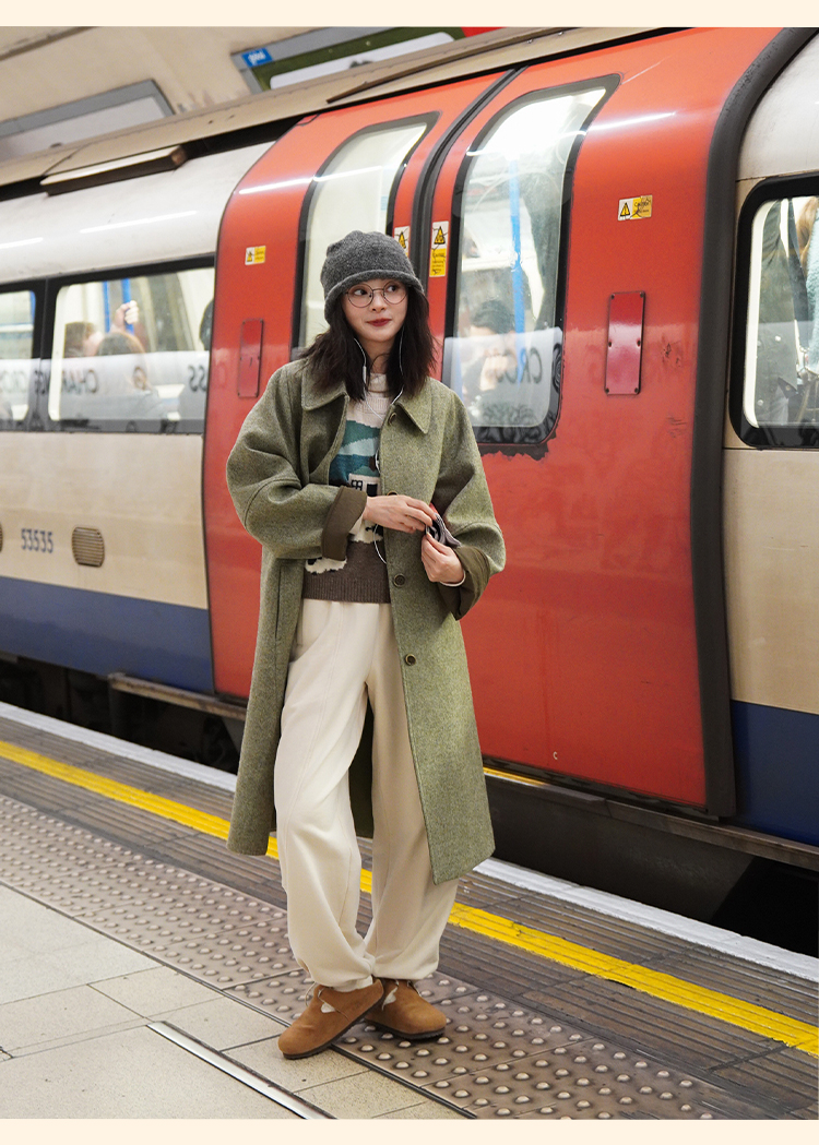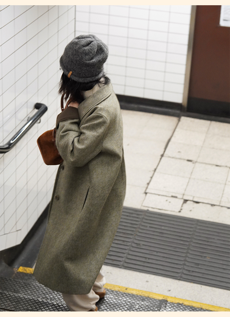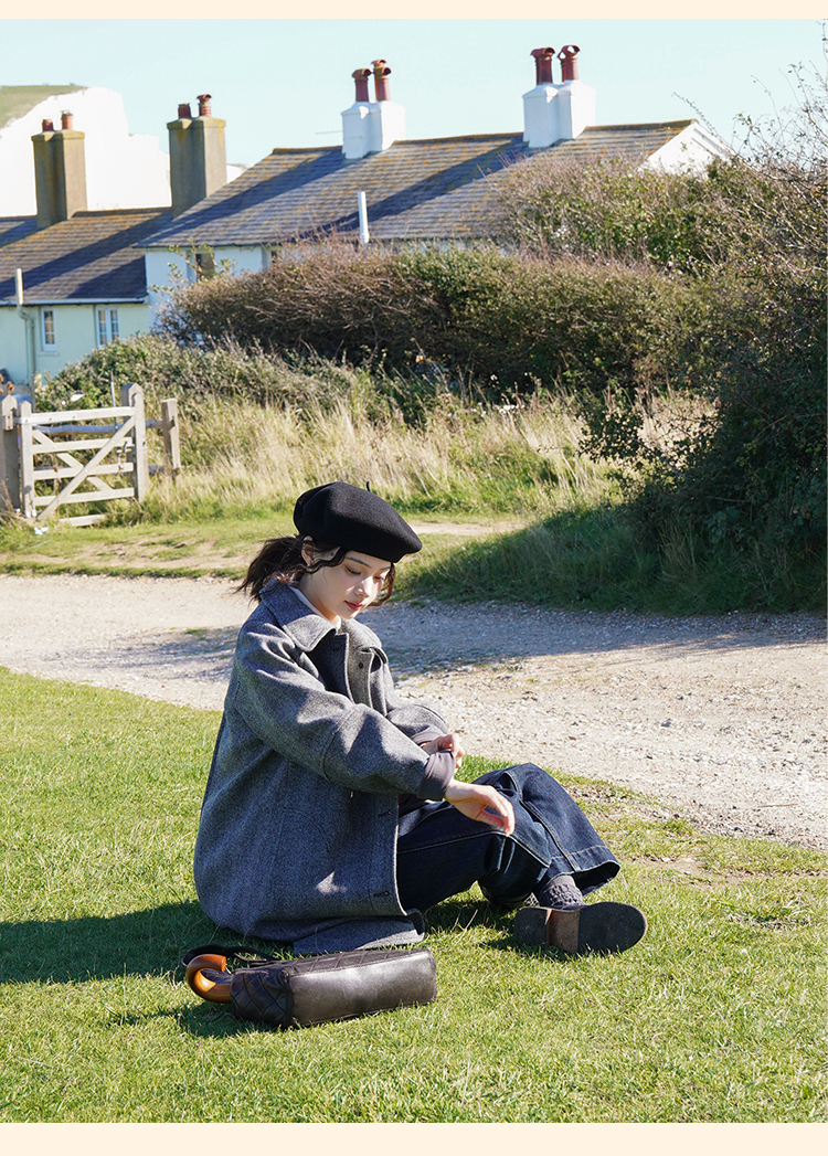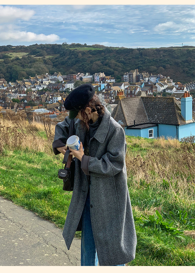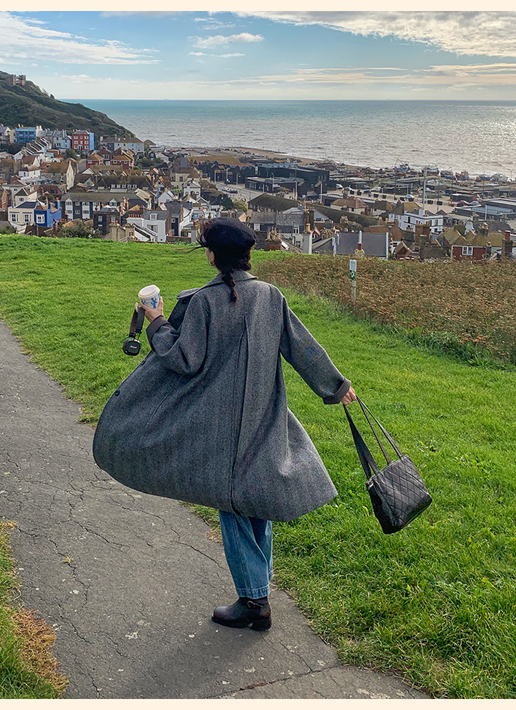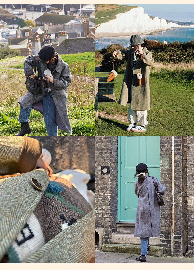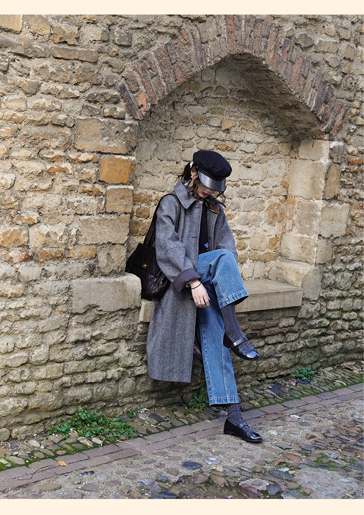 浮生八记/24C114/复古全羊毛人字纹羊腿袖卷袖口大衣