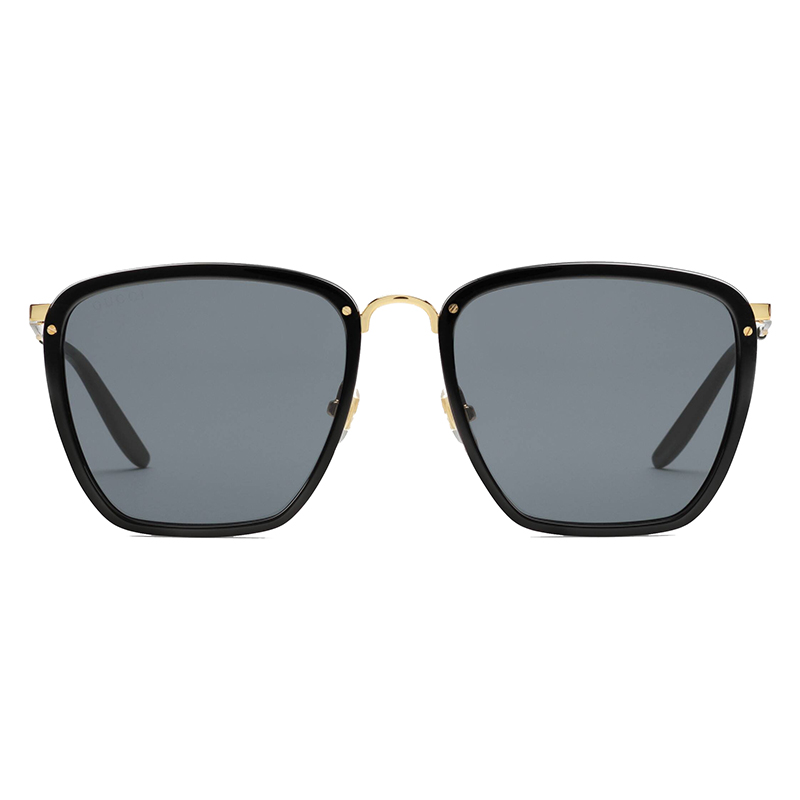在各种材料的折衷中,方形的黑色醋酸纤维镜框由金色金属镜框增强,围绕着灰色镜片。Gucci铭文增强了金色金属镜腿。