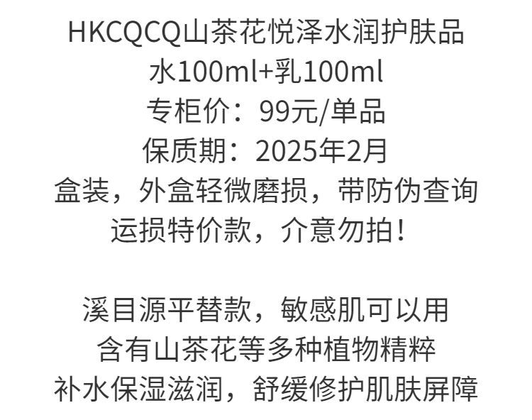 【爆款超低价预售 急单慎拍】大牌平替 HKCQCQ山茶花水乳补水保湿控油护肤品敏感肌可以 运损款