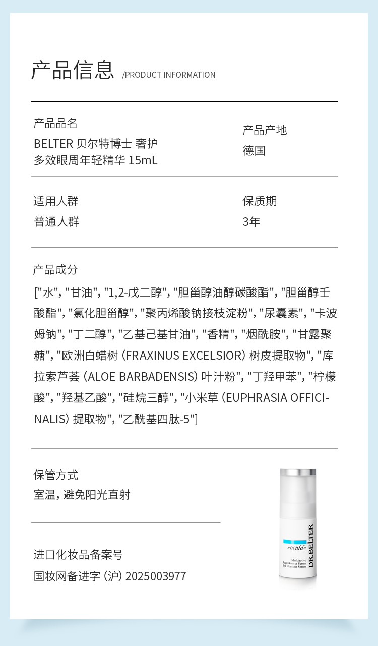 【特卖】DR.BELTER 贝尔特博士 奢护多效眼周年轻精华 15mL 德国进口 28年到期全新