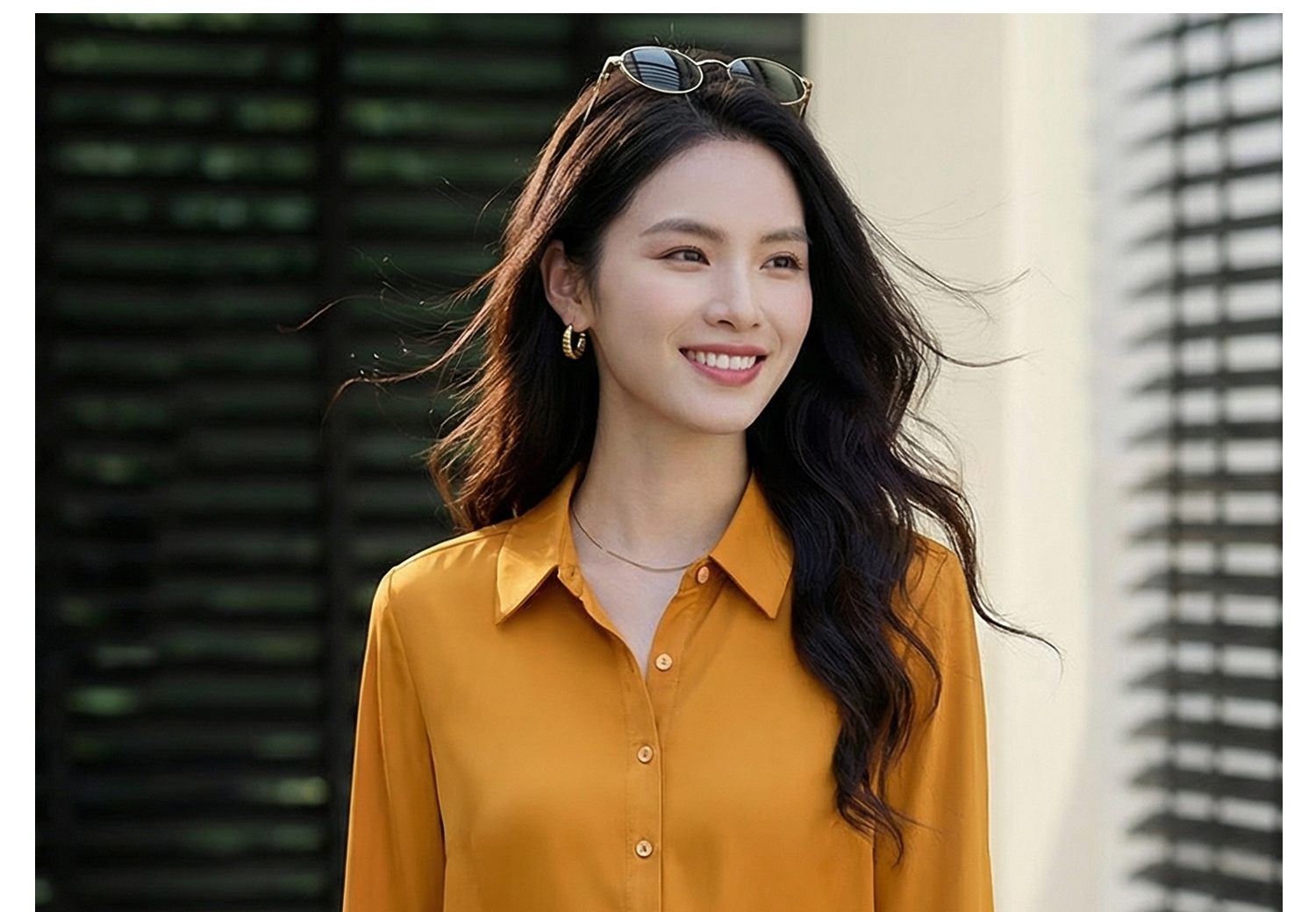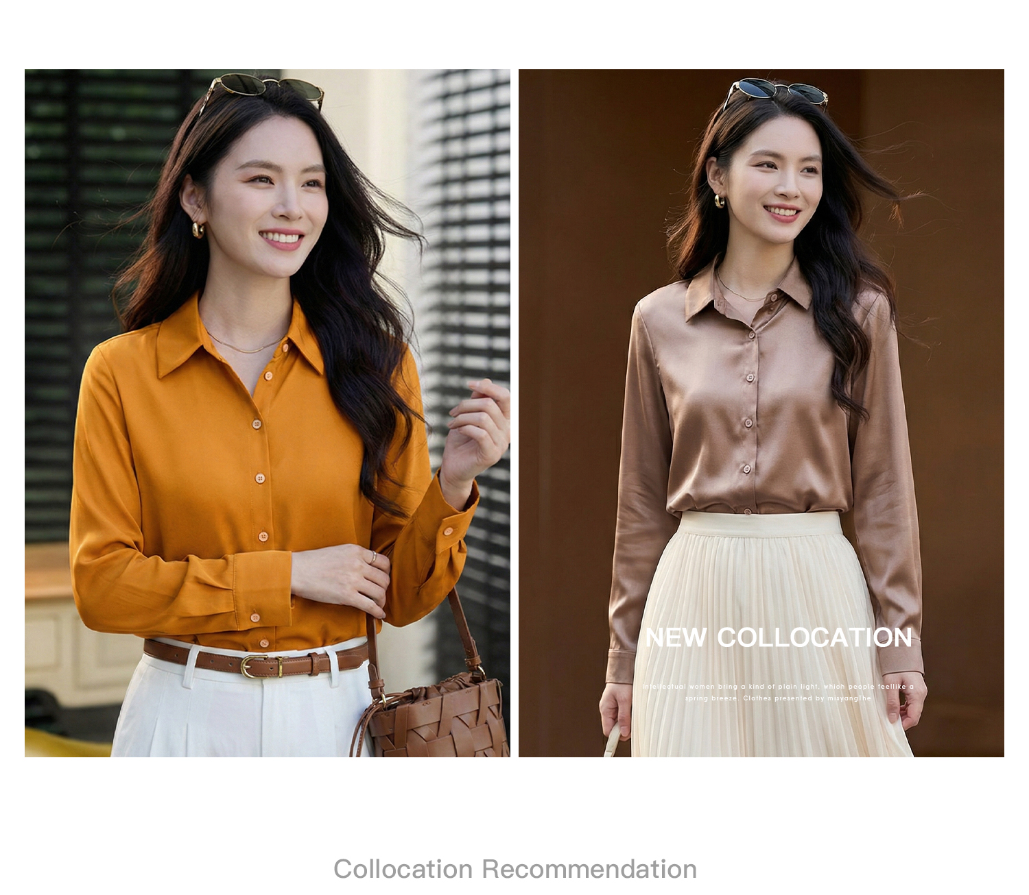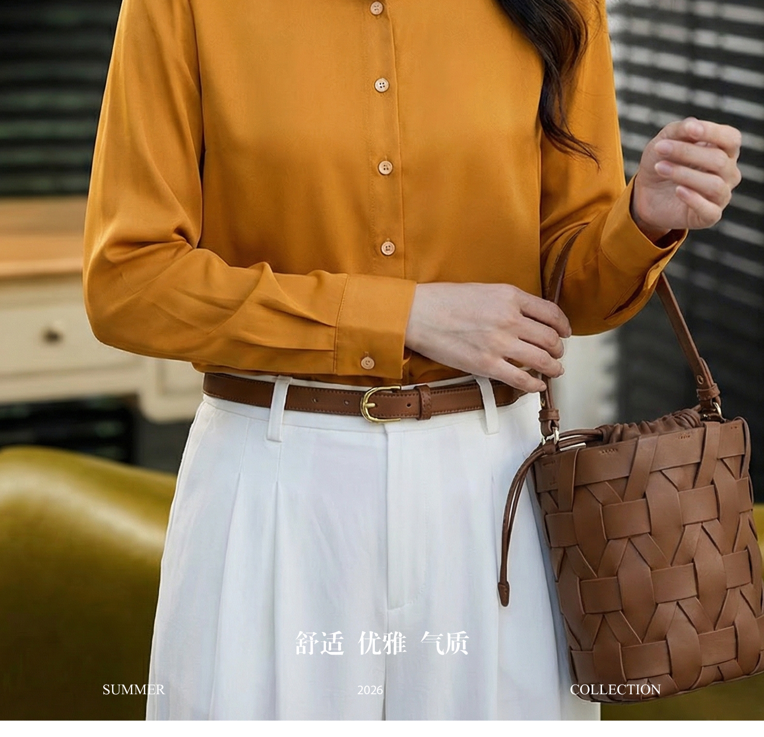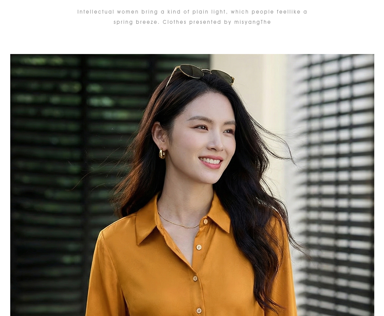 「琥珀光感桑蚕丝衬衫」暖润缎感 优质桑蚕 亲肤养肤 米思阳2026春季新款舒适真丝衬衫 简约通勤风职业翻领单排扣衬衫长袖上衣1419