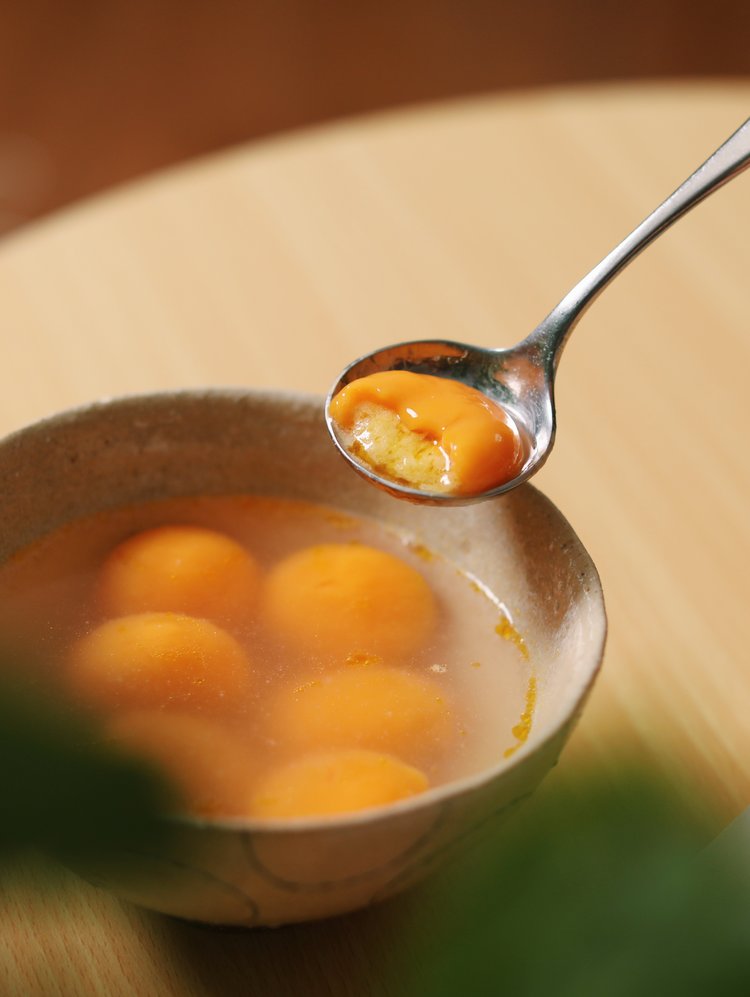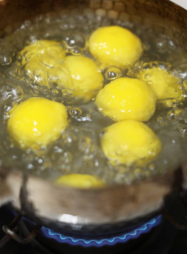 大黄米汤圆外形滑润,细腻如玉,个大料足,淡米色的外皮,煮熟后呈亮眼的金黄色,一颗就能填满一整个大勺,非常萌萌哒。