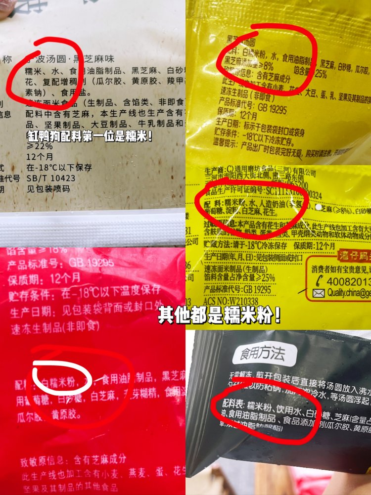 我们选择了市面上几个常见的品牌,看他们配料表,第一项都是糯米粉,唯有缸鸭狗是糯米。