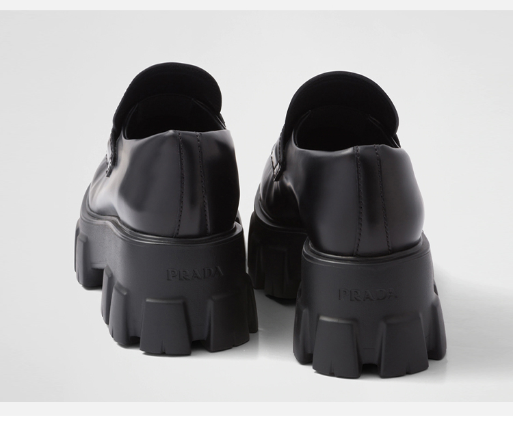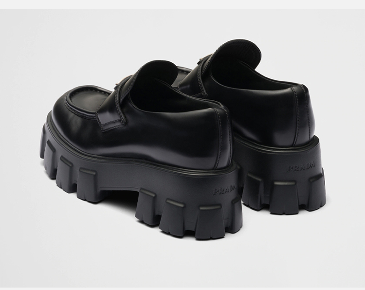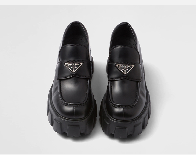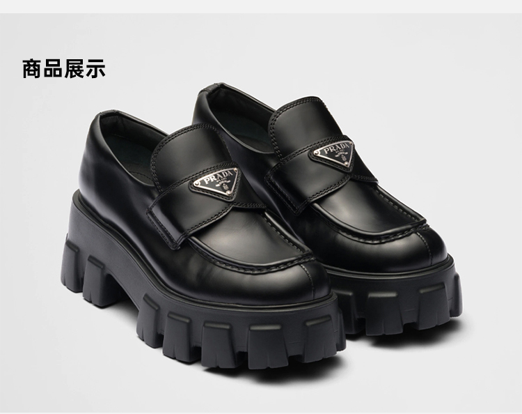 【二】PRADA 普拉达 女士 Monolith 拉绒皮革金属三角徽标乐福鞋 黑色 1D649M B4L F0002