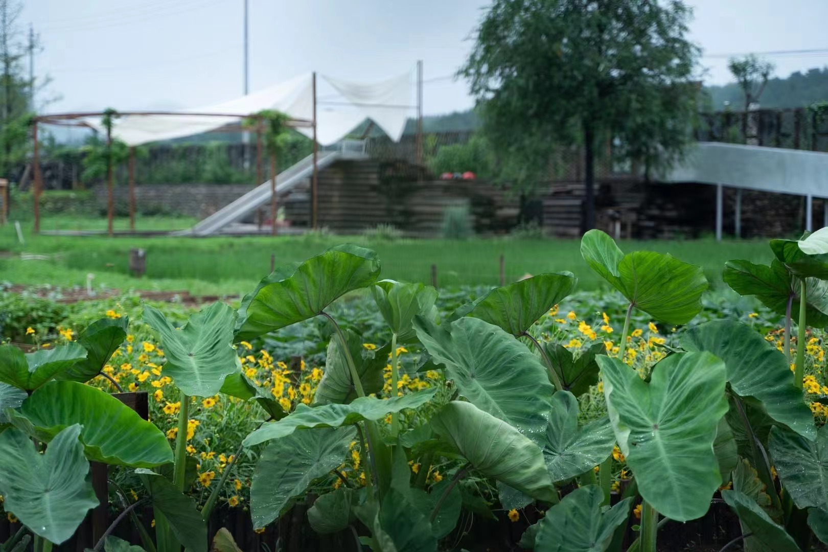 芋头的大叶子让人总觉得下面应该站着宫崎骏的龙猫。每年,芋头田都会让农场像一片世外桃源。