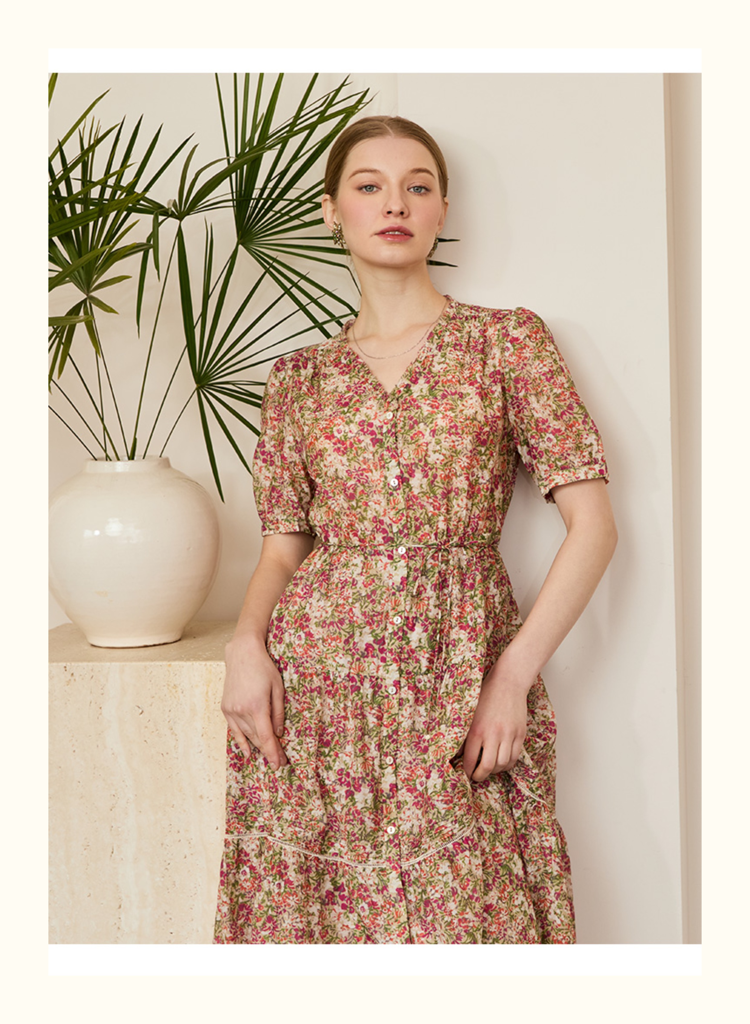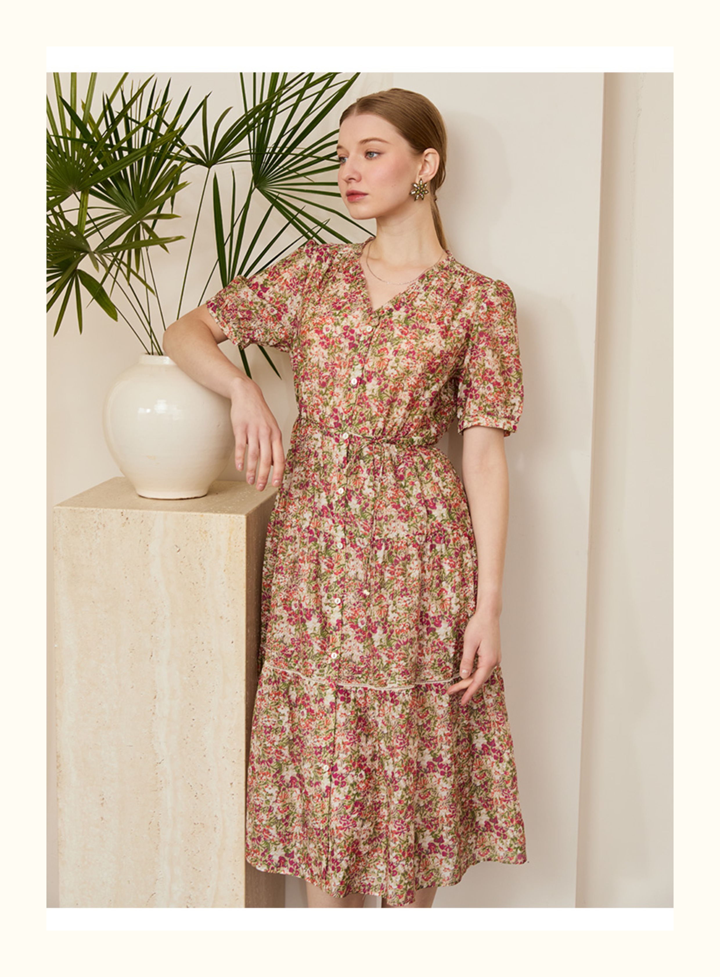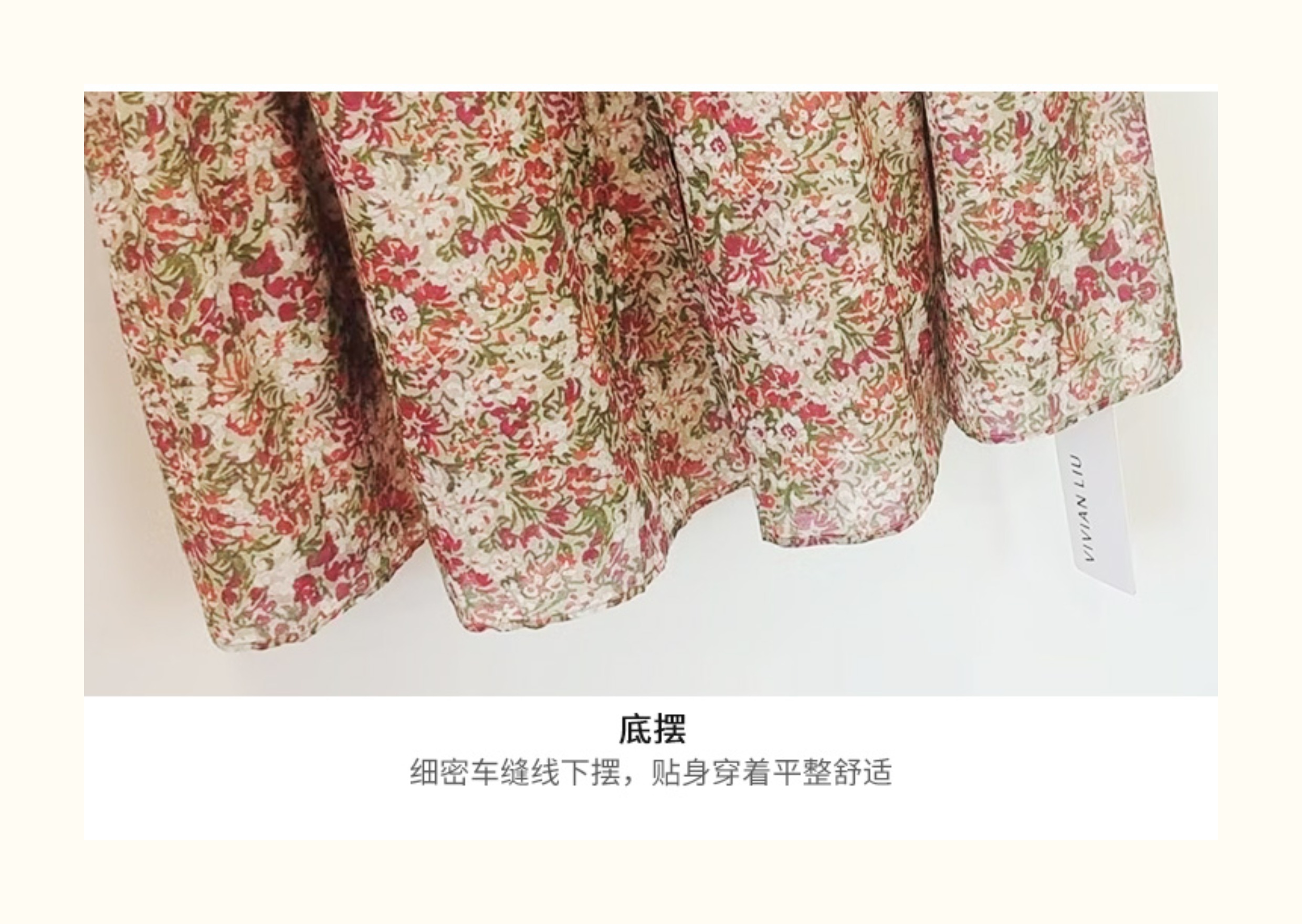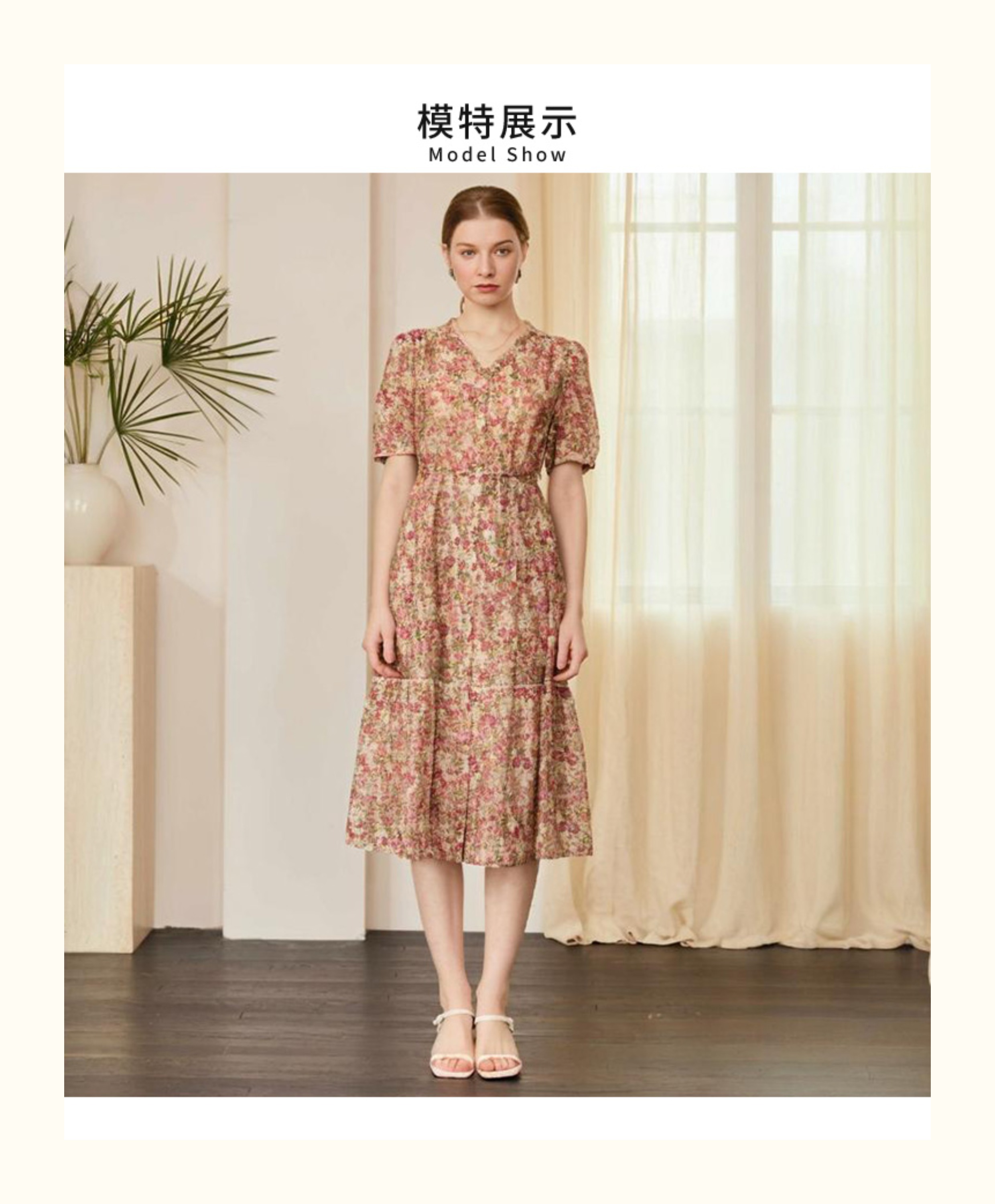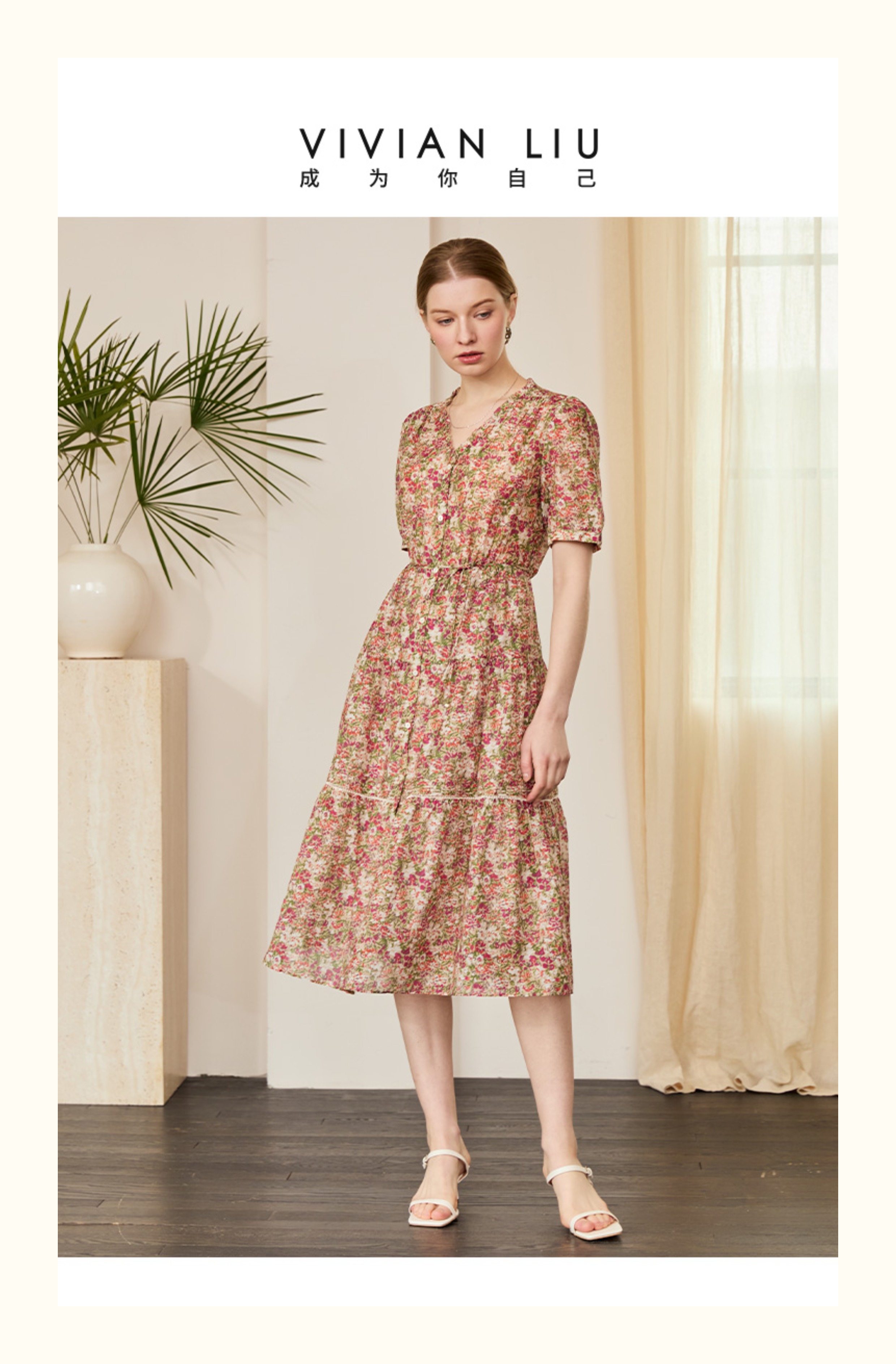 VIVIAN LIU V2524105 春季新款V领花边设计印花收腰短袖连衣裙