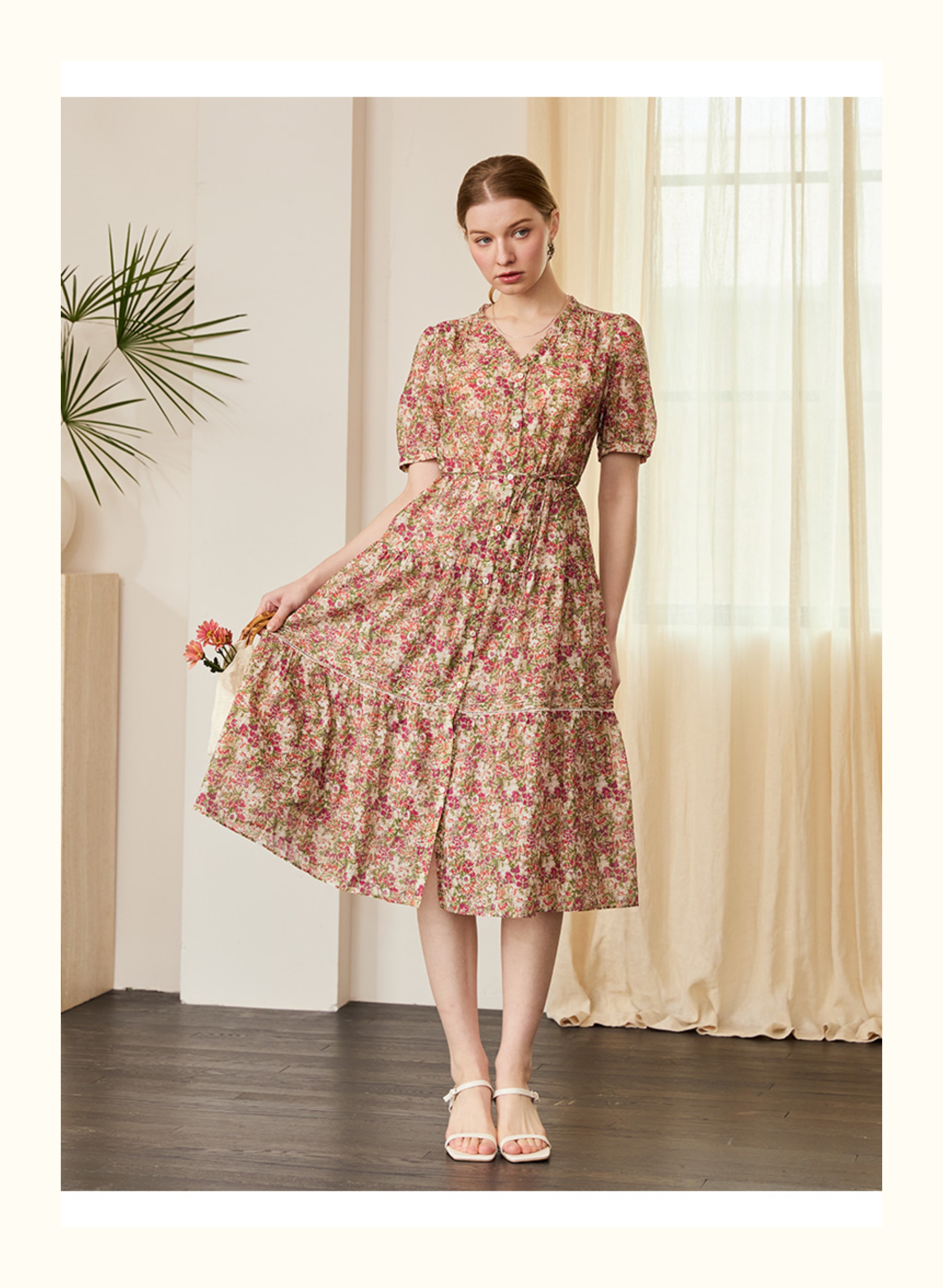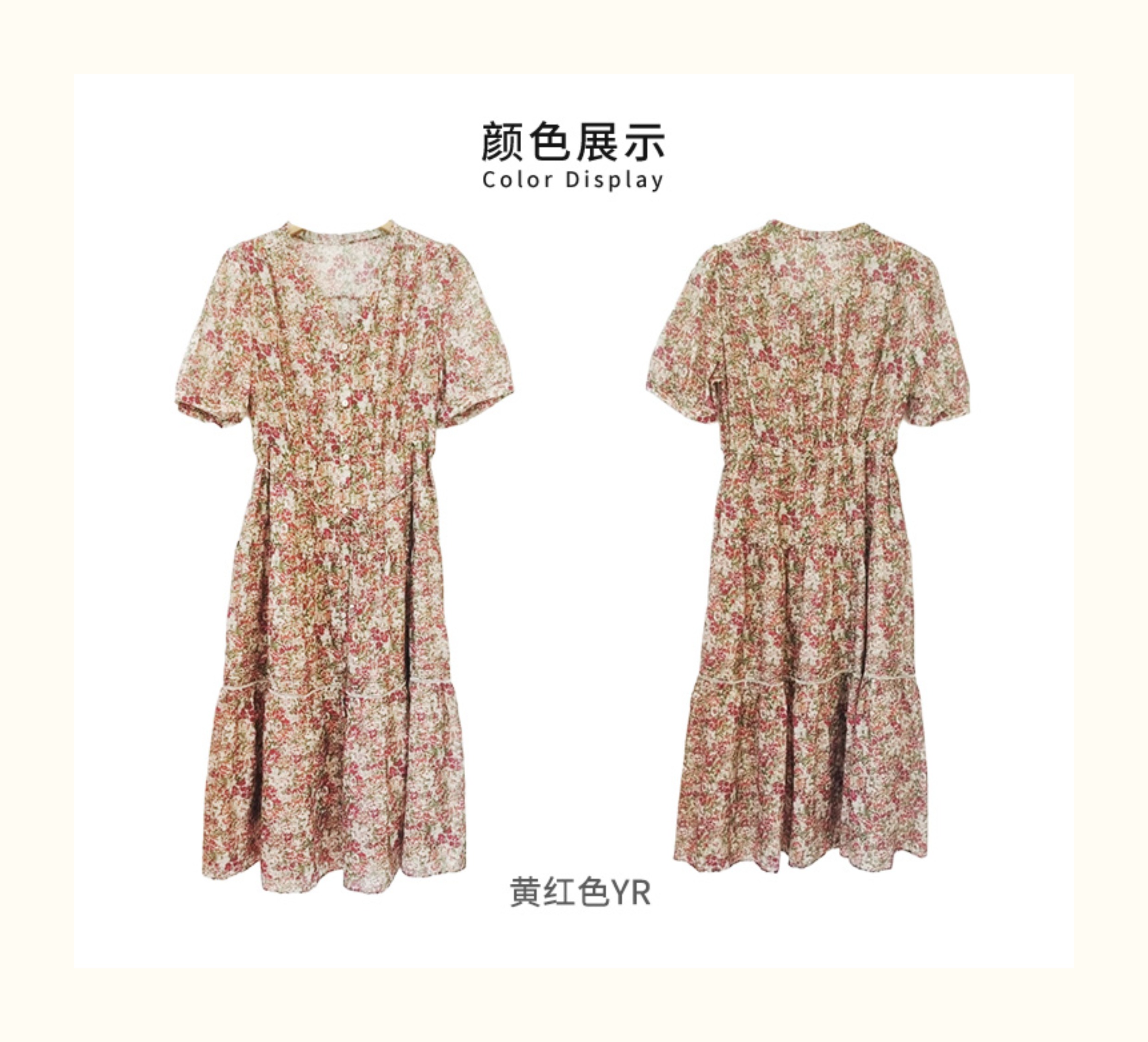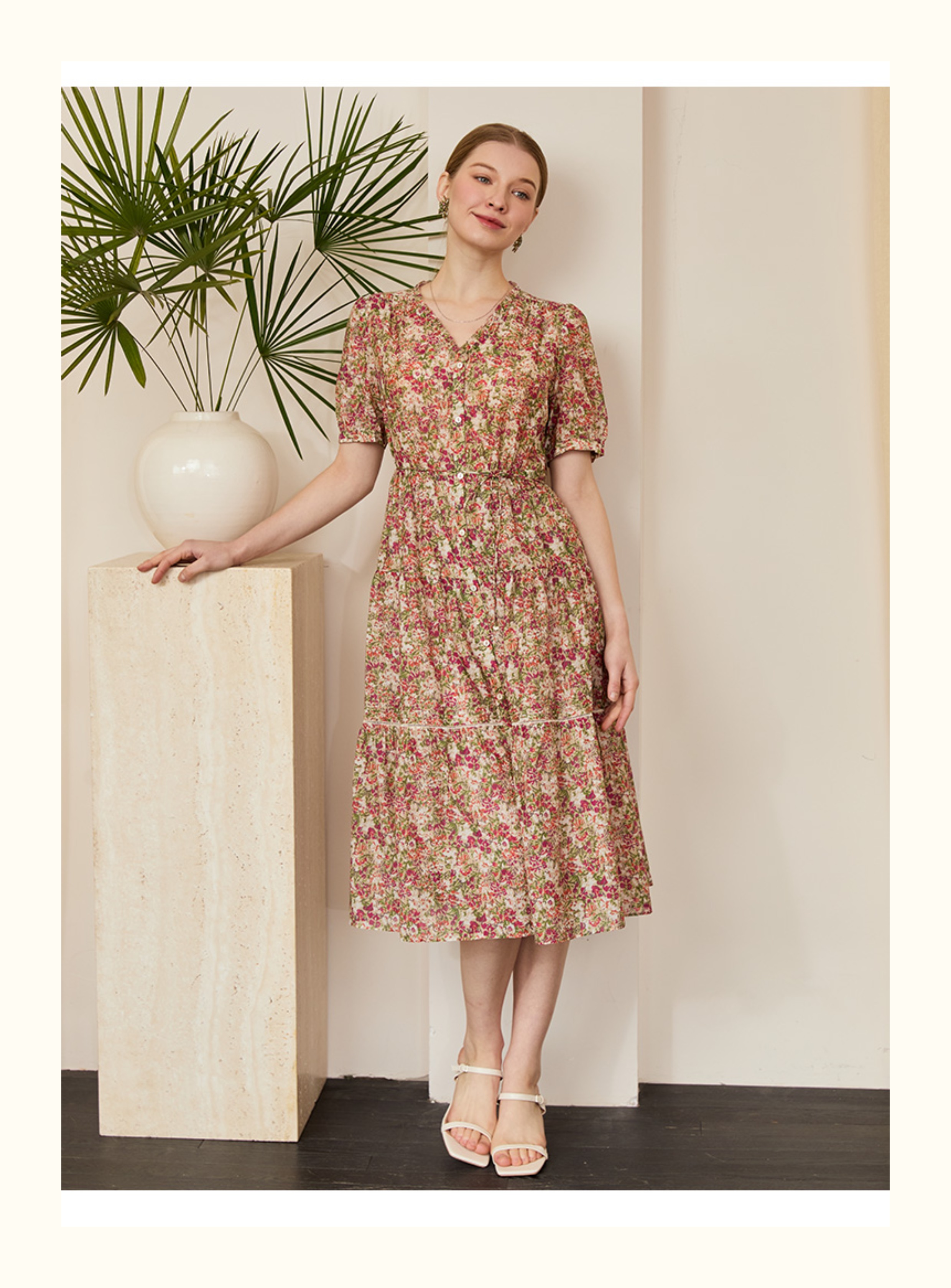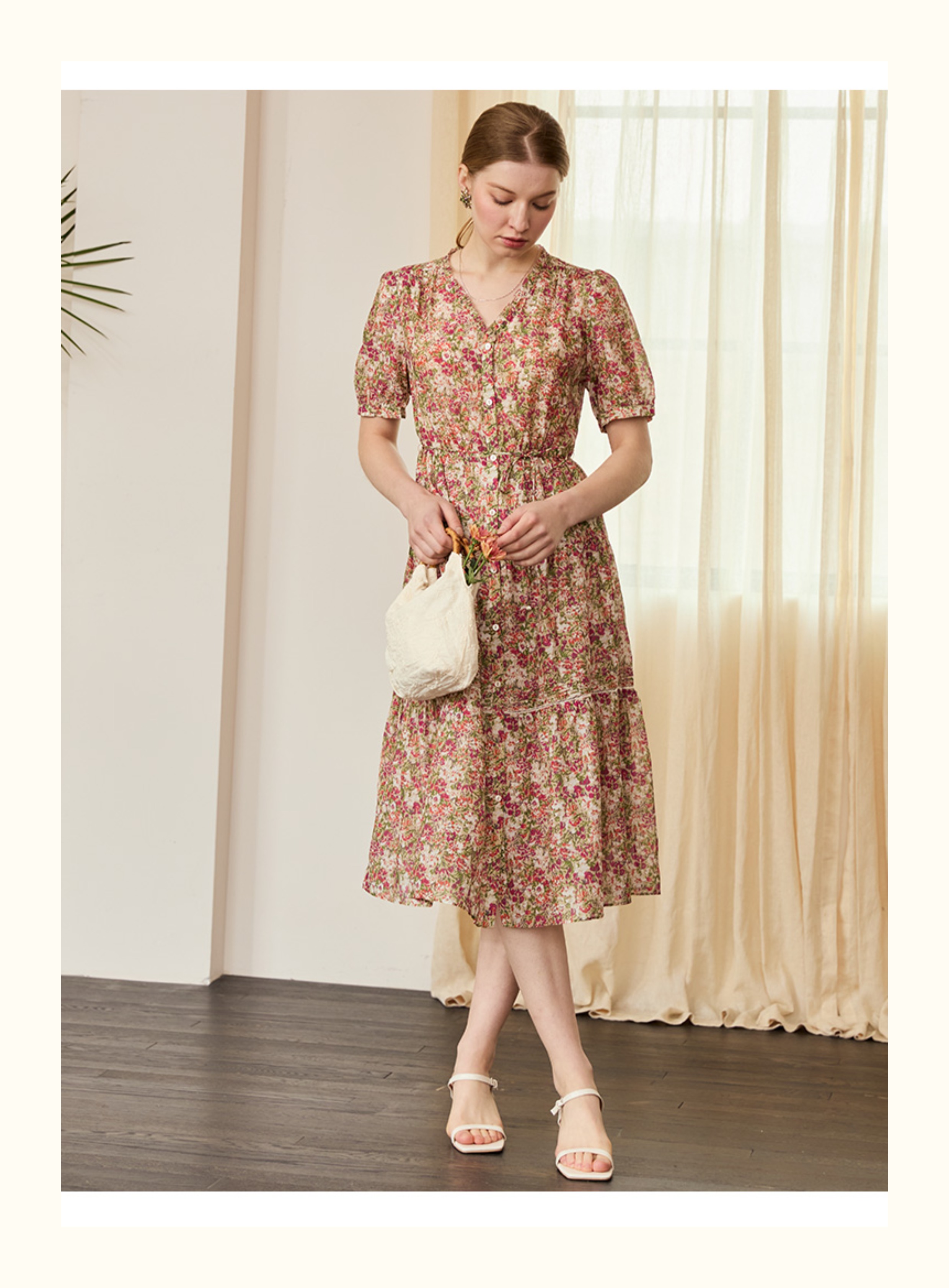 VIVIAN LIU V2524105 春季新款V领花边设计印花收腰短袖连衣裙