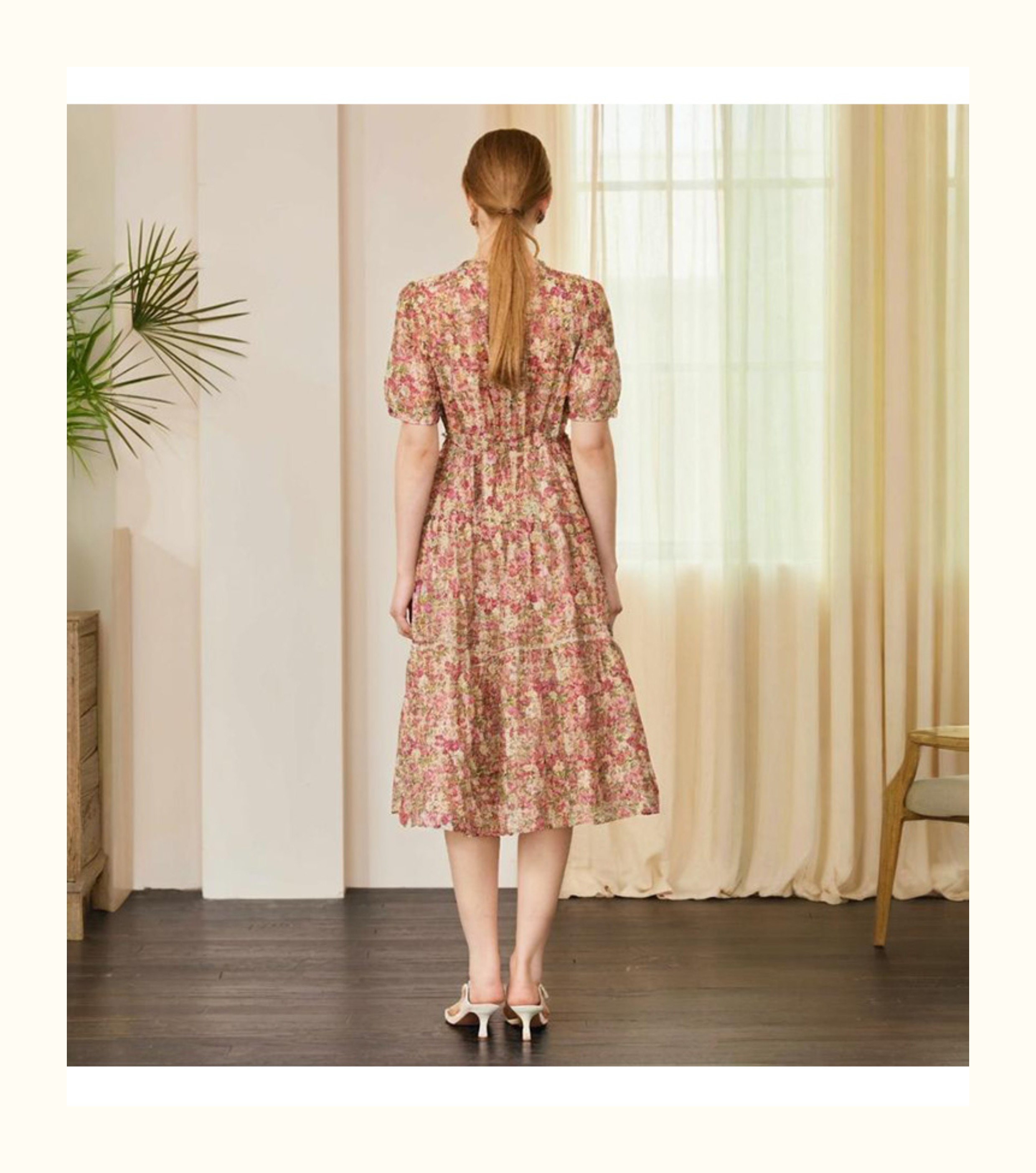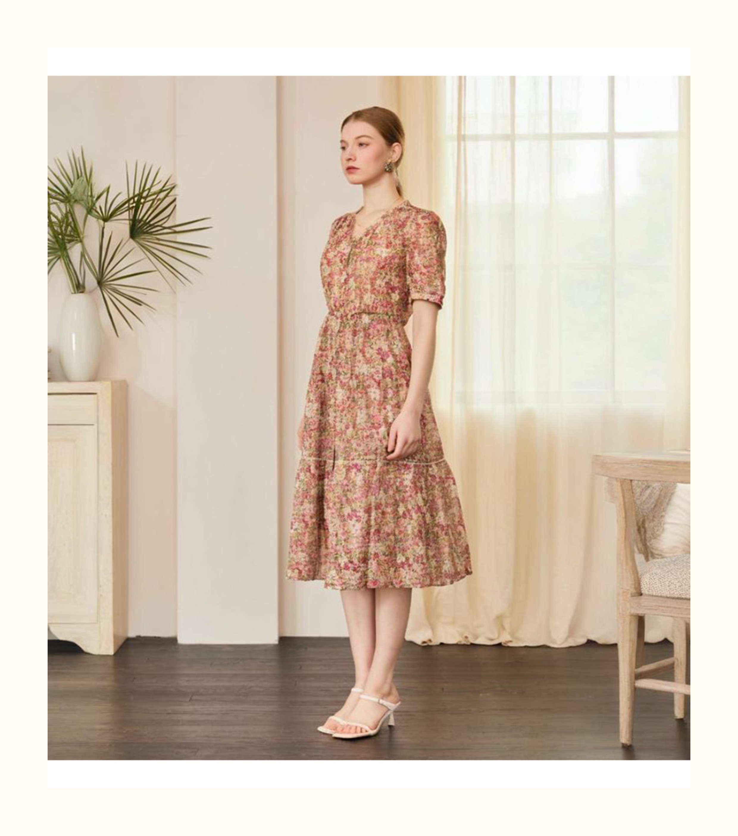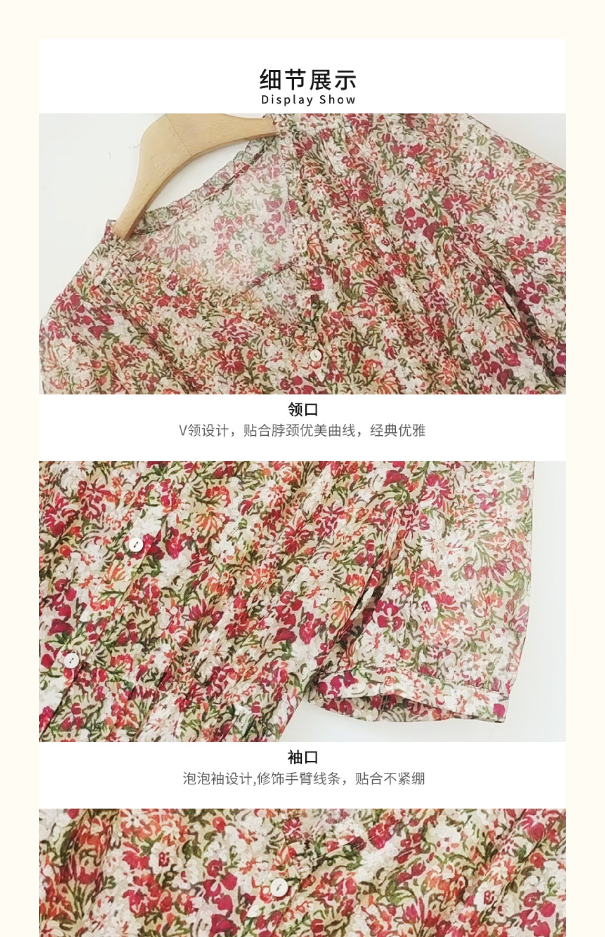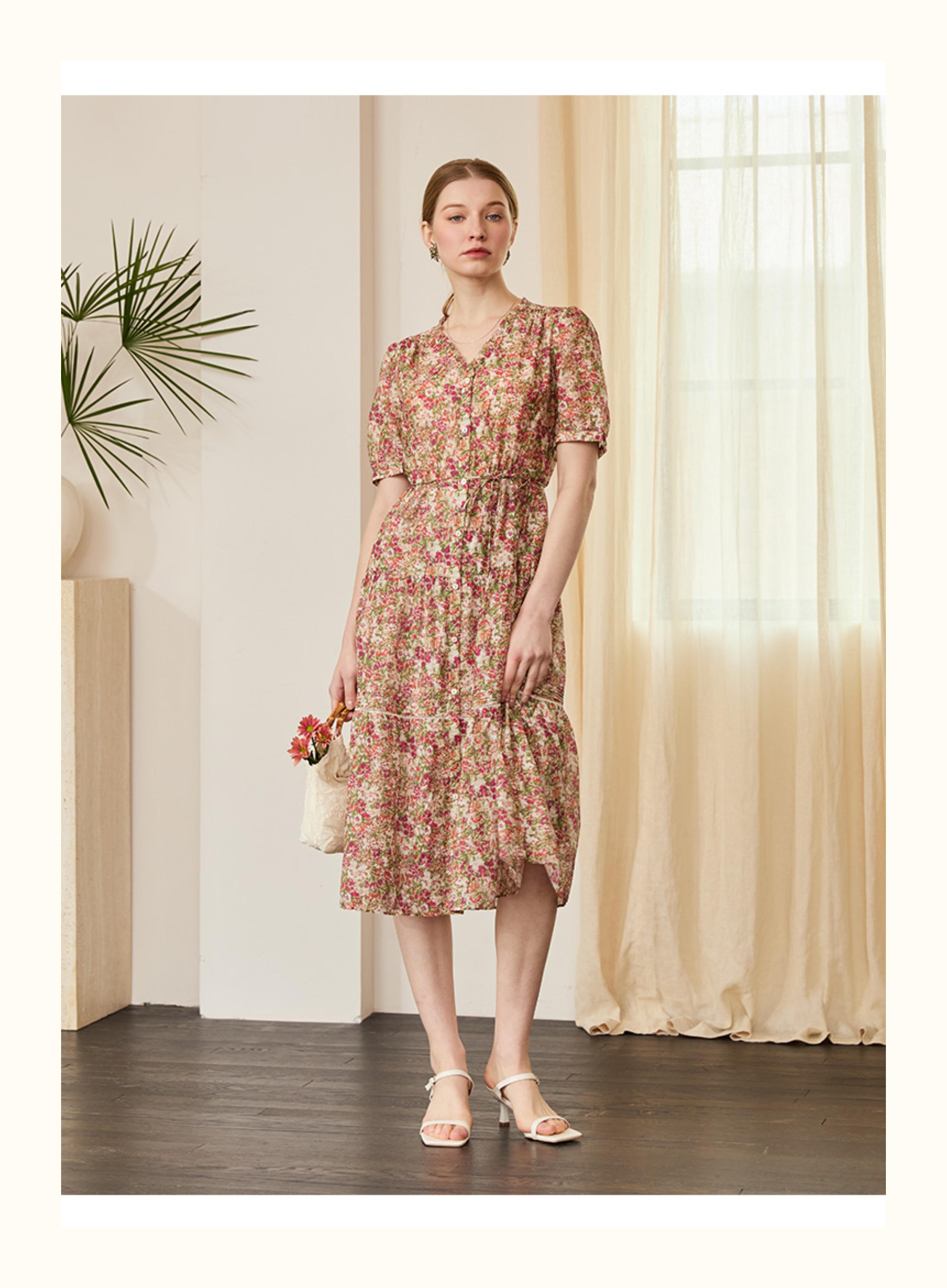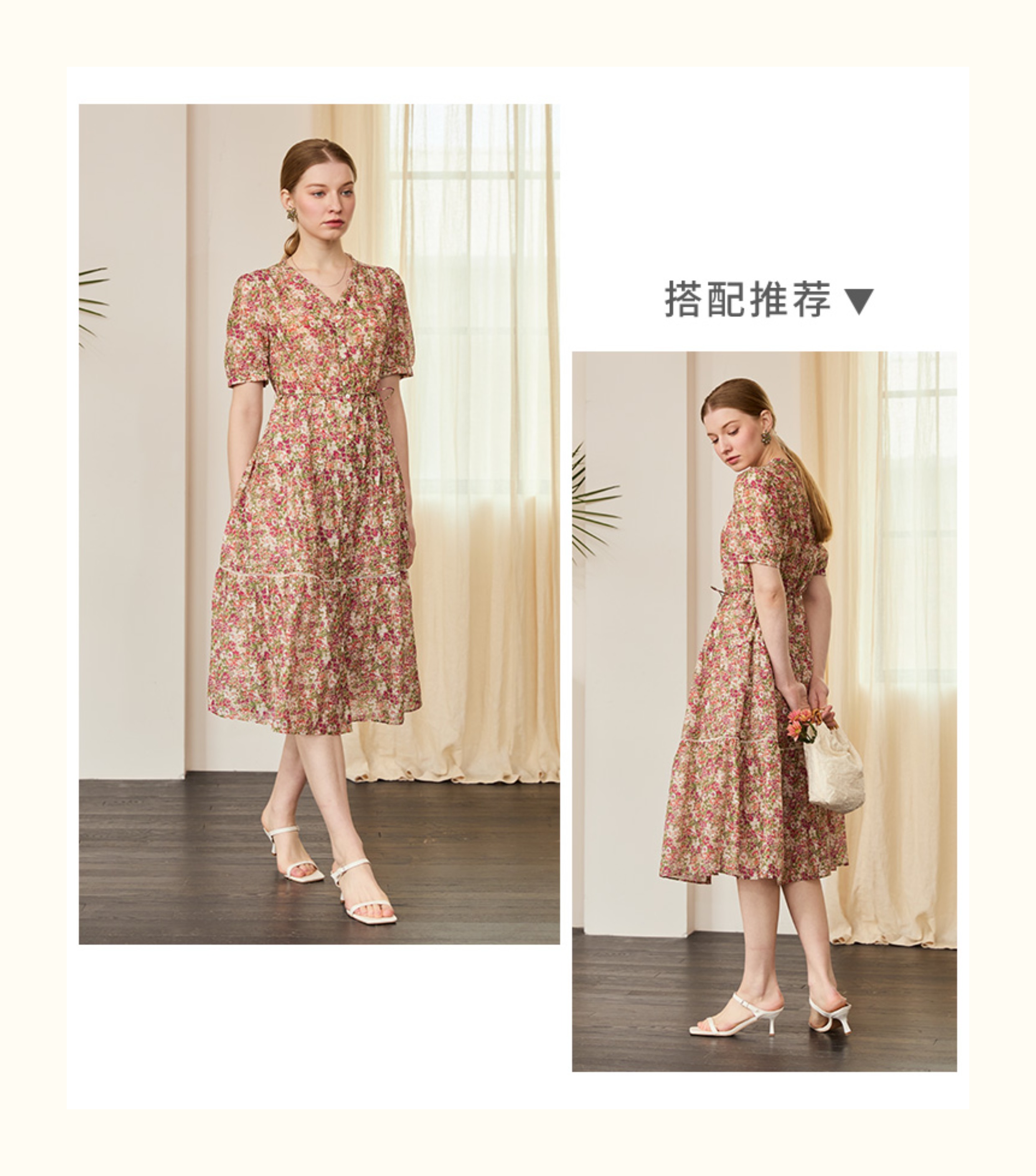 VIVIAN LIU V2524105 春季新款V领花边设计印花收腰短袖连衣裙