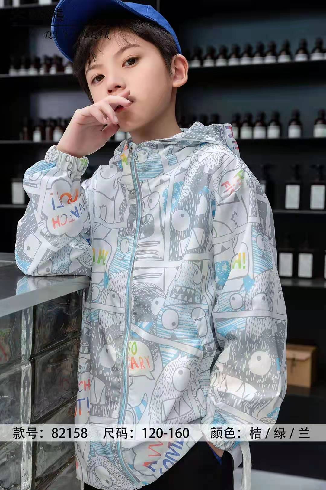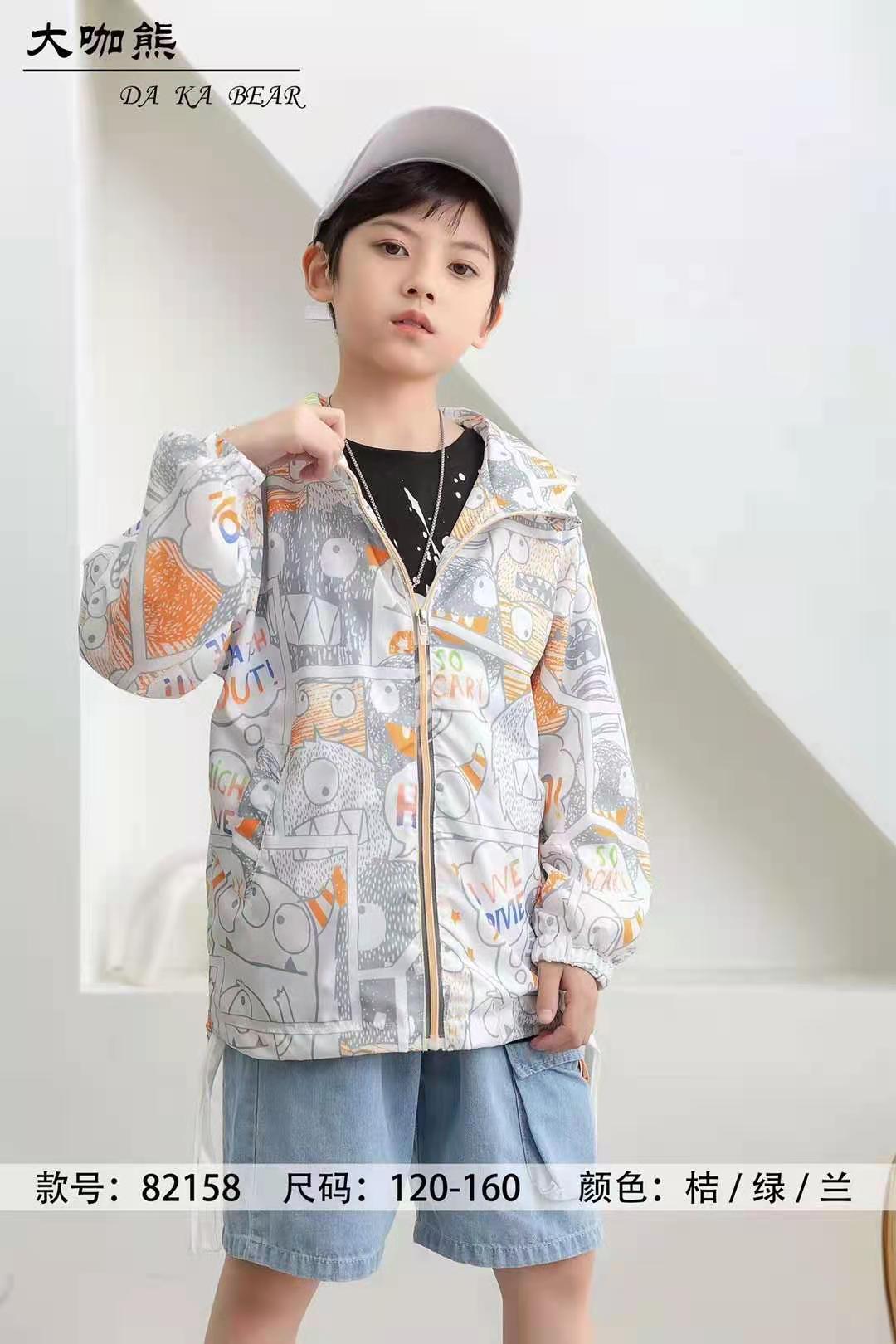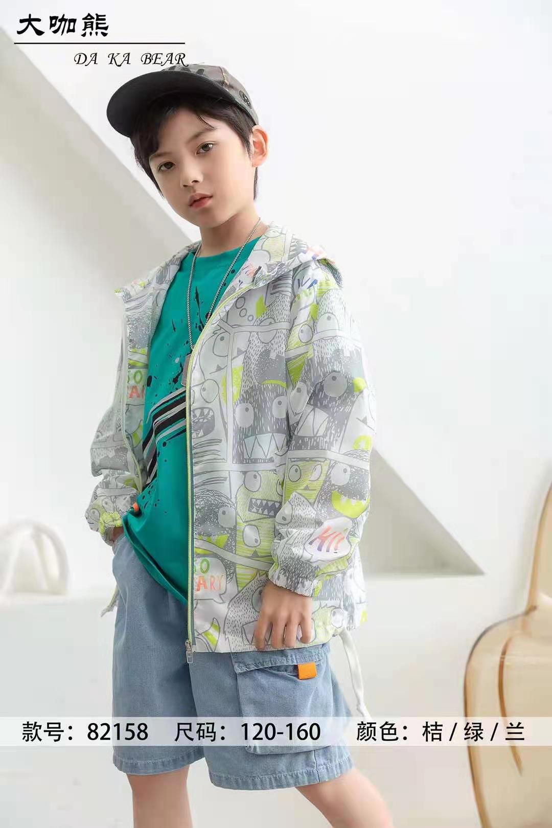 商品描述:大咖熊男童防晒衣,面料,聚酯纤维。里面搭配直色半T,下身搭配牛仔,休闲,运动九分裤,时尚休闲。