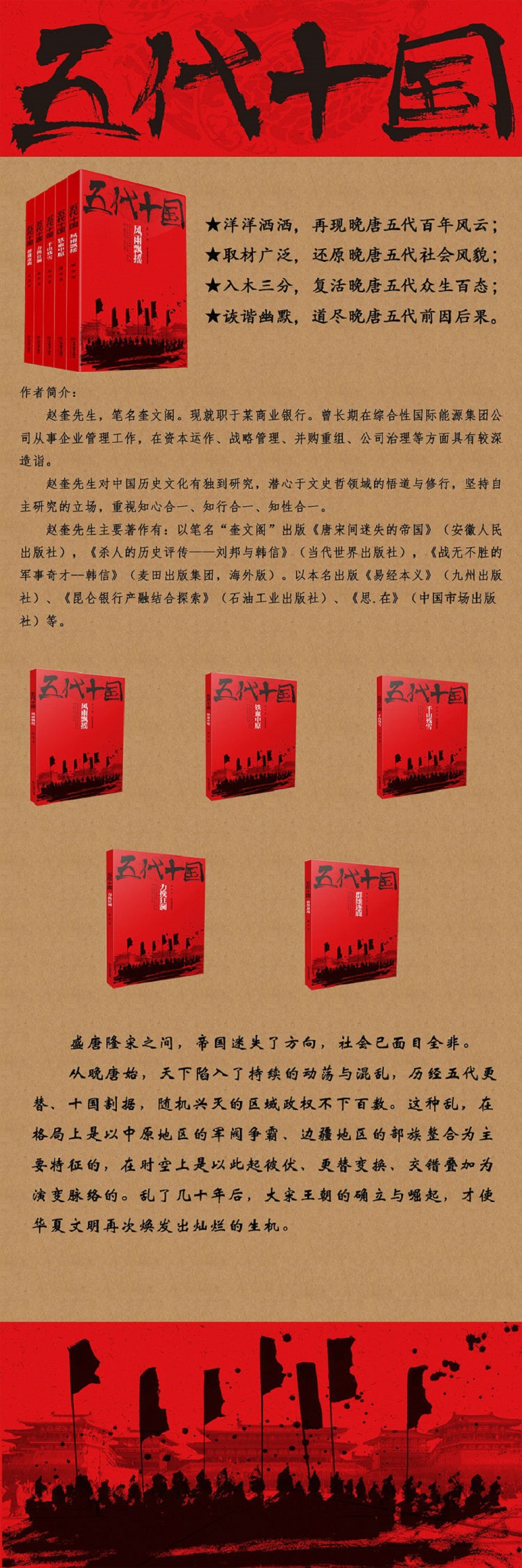 《五代十国(套装共5册)》包括《五代十国:风雨飘摇》《五代十国:群雄逐鹿》《五代十国:铁血中原》《五代十国:千山残血》《五代十国:力挽狂澜》共5册。《五代十国(套装共5册)》:盛唐隆宋之间,帝国迷失了方向,社会已面目全非。从晚唐始,天下陷入了持续的动荡与混乱,历经五代更替、十国割据,随机兴灭的区域政权不下百数。这种乱,在格局上是以中原地区的军阀争霸,边疆地区的部族整合为主要特征的,在时空上是以此起彼伏,更替变换、交错叠加为演变脉络的。乱了几十年后,大宋王朝的确立与崛起,才使华夏文明再起焕发出灿烂的生机。