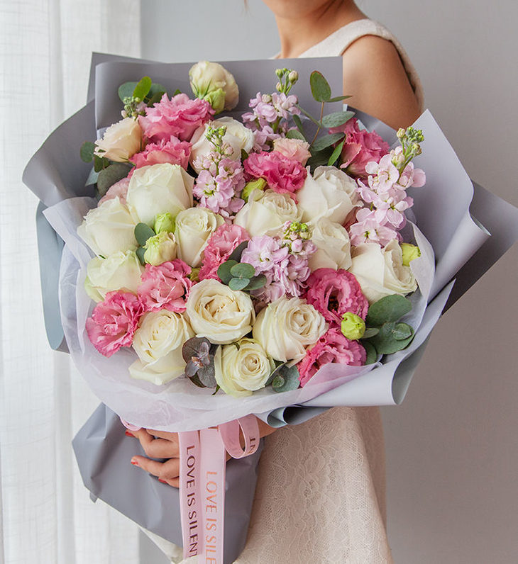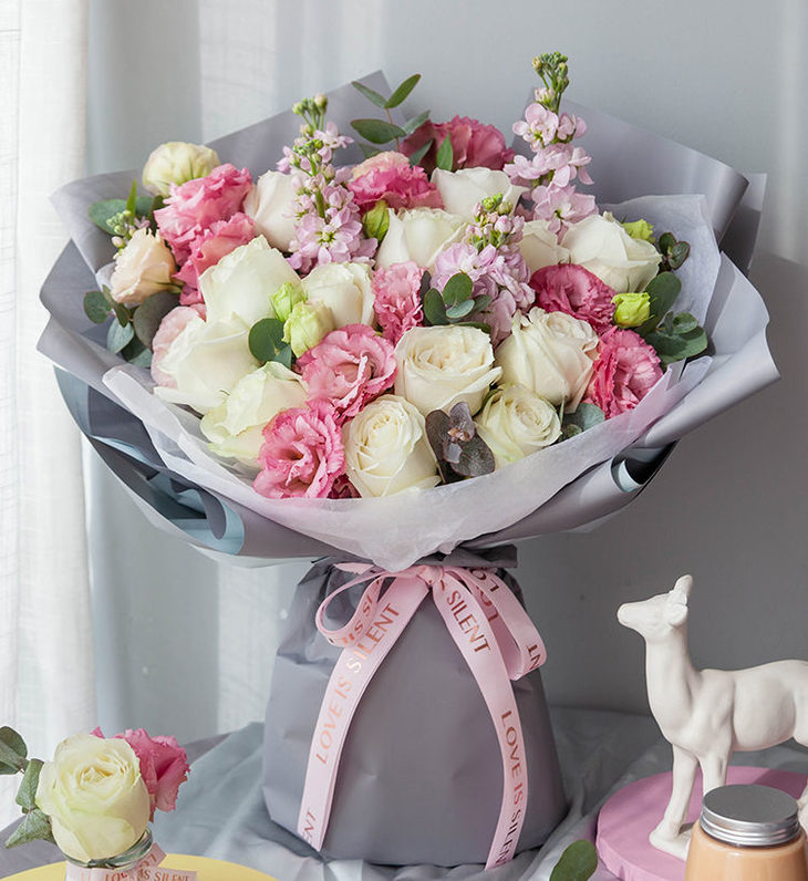 由于鲜花包扎各地的花艺师不同,可能在形式和搭配上与图片不完全一致,但保证主花材的新鲜程度、数量、颜色与说明一致,谢谢。