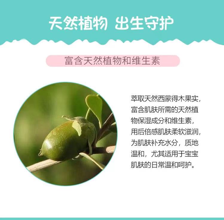萃取自天然的西蒙得木果实,富含皮肤所需的天然植物保湿养分和维生素,用后倍感肌肤柔软滋润,为肌肤补充水分,质地温和,尤其适用于宝宝肌肤的日常温和呵护。